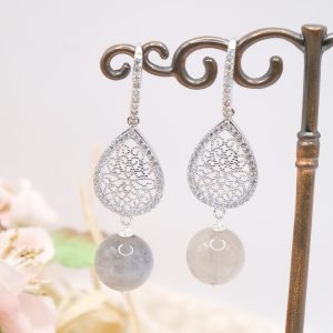 Earrings with charming 12mm natural labradorite and filigree drop or rhombus in 925 silver studded with zircons