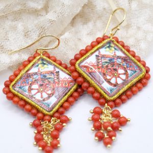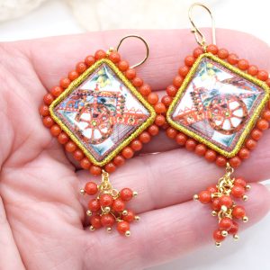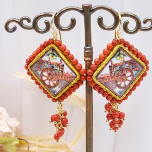 Orecchini con mattonelle, realizzate decorate a mano in pietra lavica ceramizzata di Caltagirone da 30 mm a lavorazione sautache, con carretto Siciliano e cornice e grappolo di corallo bamboo