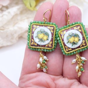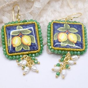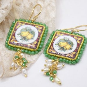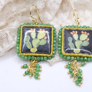 Orecchini con mattonelle, realizzate decorate a mano in pietra lavica ceramizzata di Caltagirone da 30 mm a lavorazione sautache, con fico d’india o limoni, e cornice e grappolo di zirconi verdi