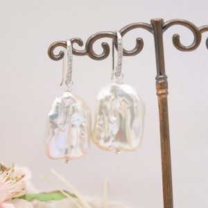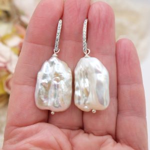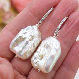 Square Baroque Pearl Earrings in 925 Silver with Zircons and Gold Silver