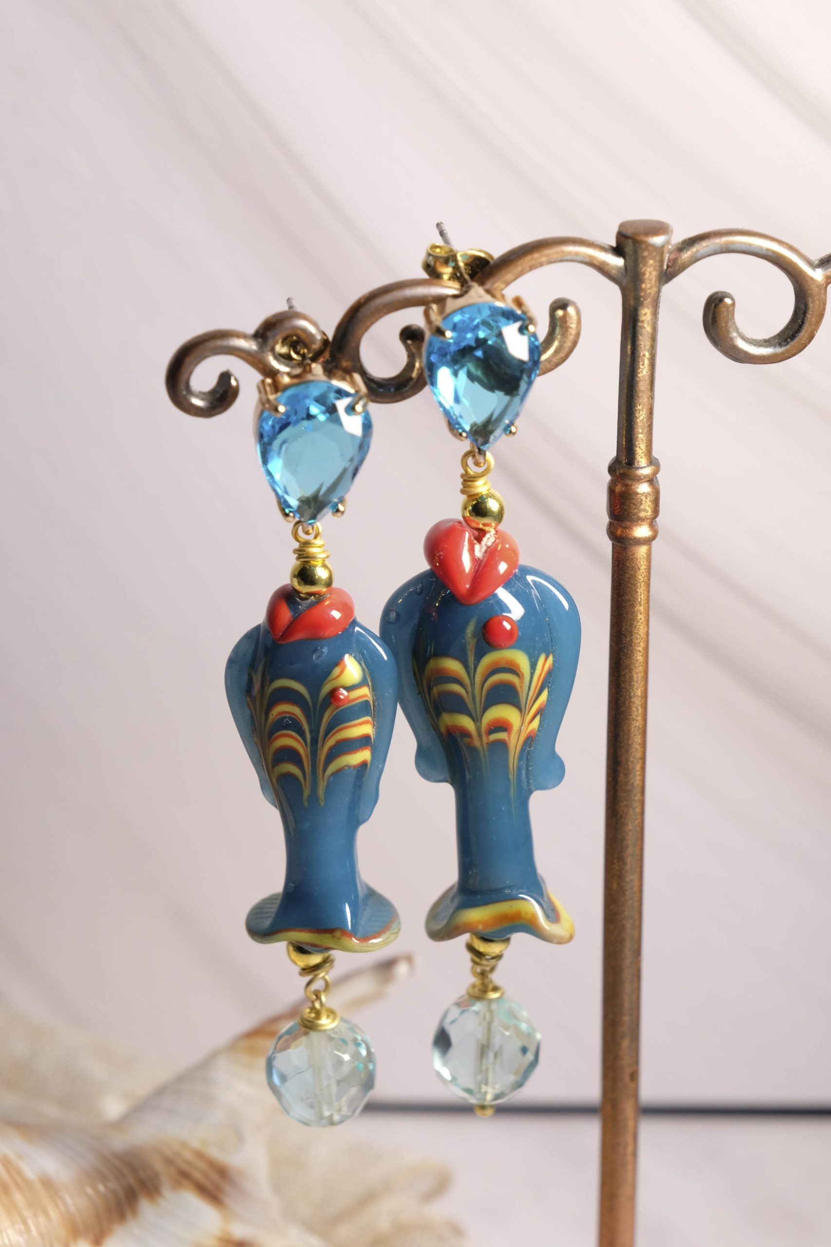 Vintage Murano Glass Blue Fish Earrings with Crystals