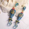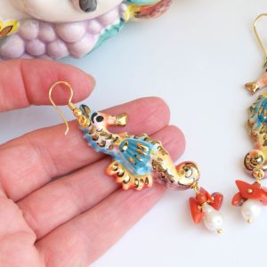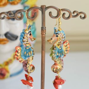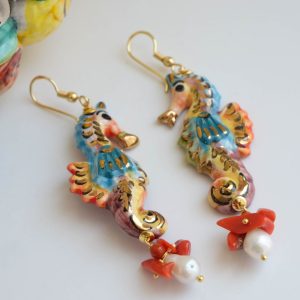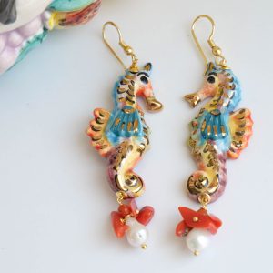 Pendant earrings with seahorses measuring 5.1 x 2.2 cm, made and decorated by hand in Caltagirone ceramic with 22 kt gold leaf, enriched with natural pearls and coral.