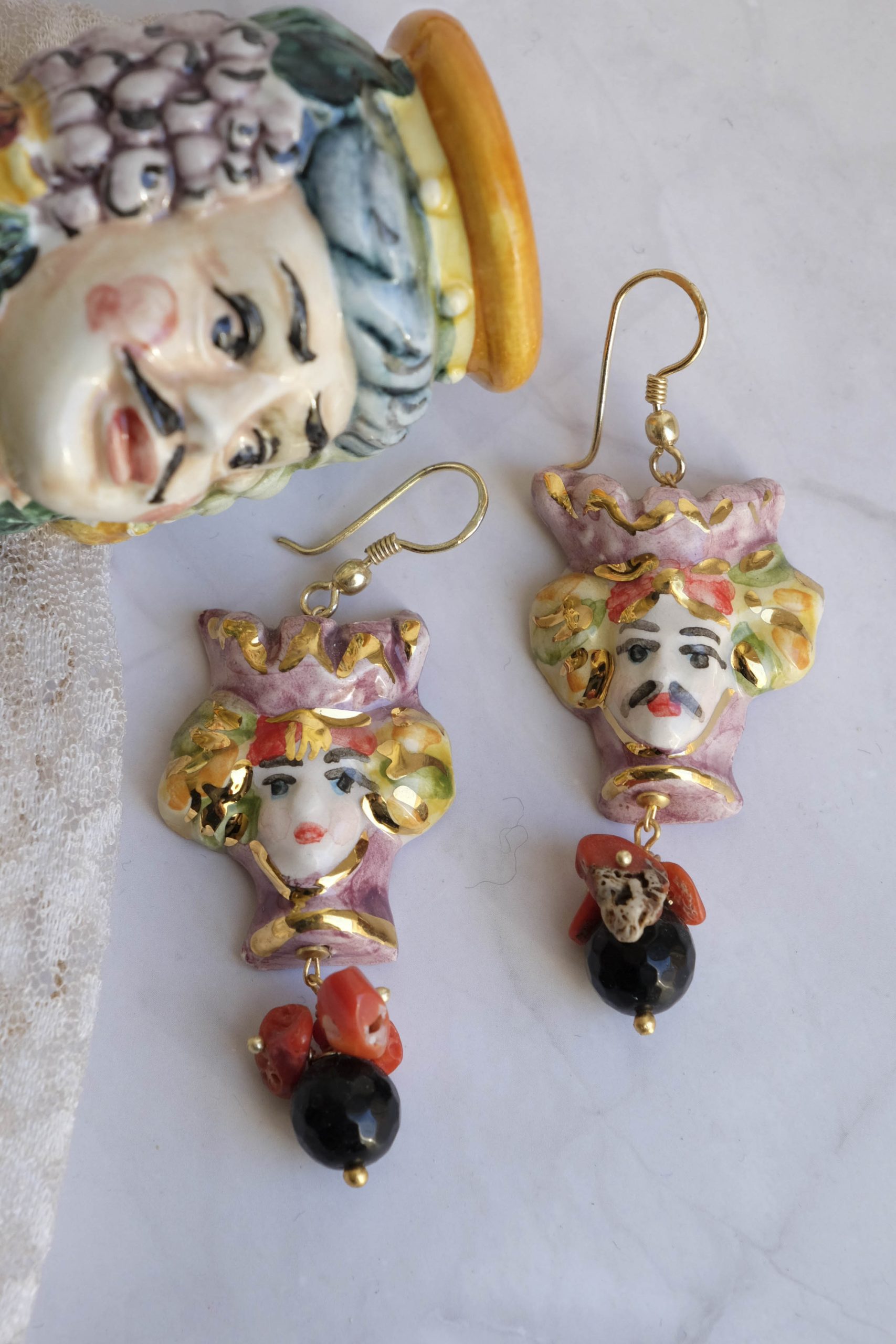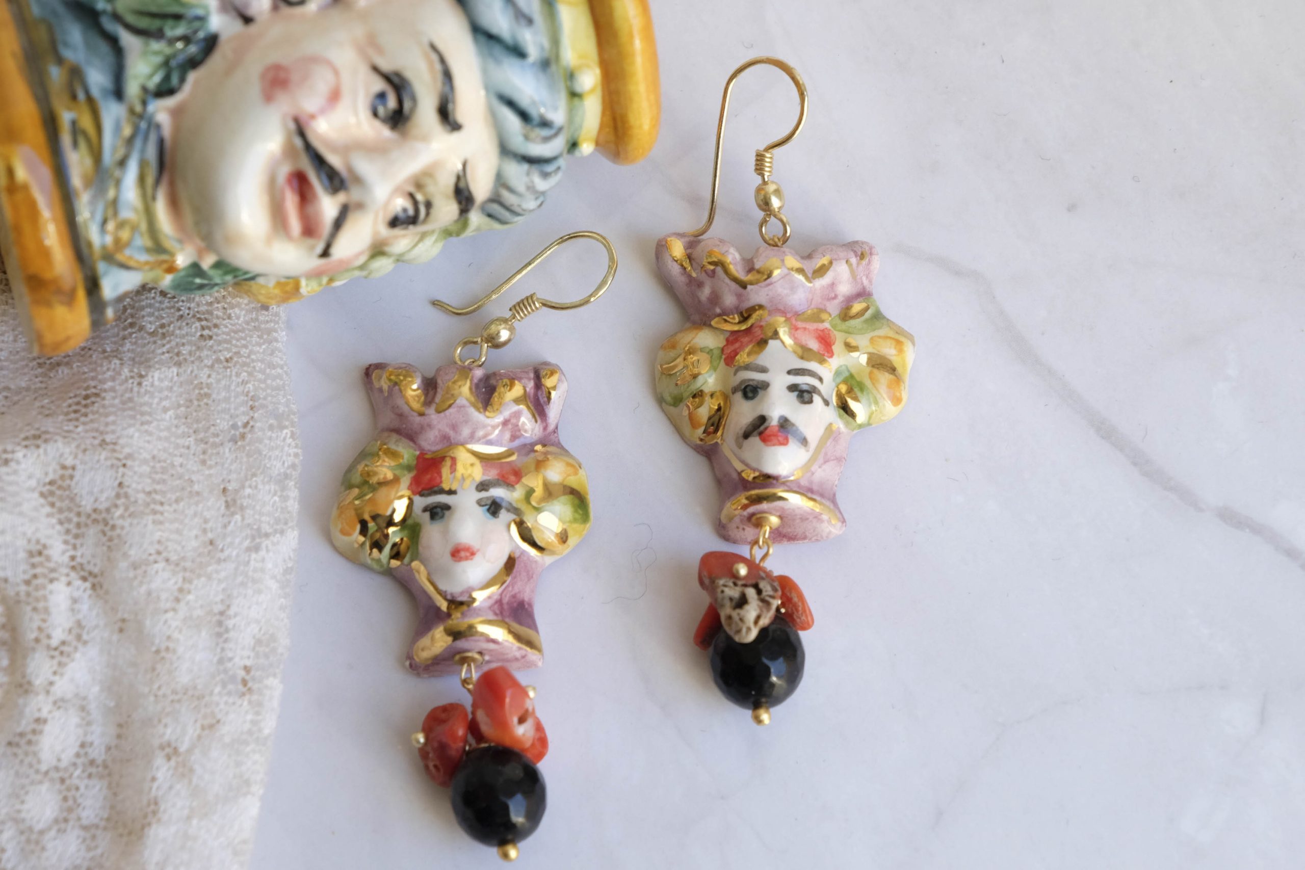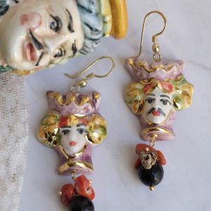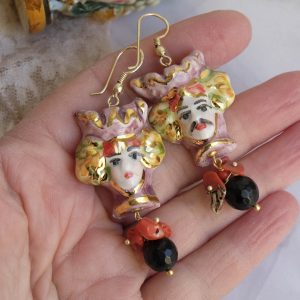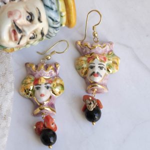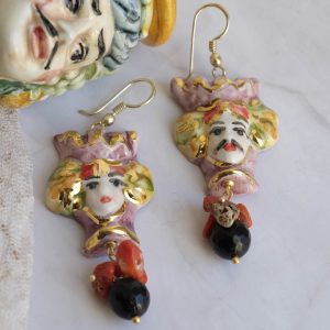 Sicilian Moor's Head earrings (men and women) in Caltagirone ceramic, 3 x 2.8 cm, handmade, with 22 kt gold leaf applications, natural onyx and coral.