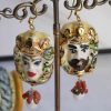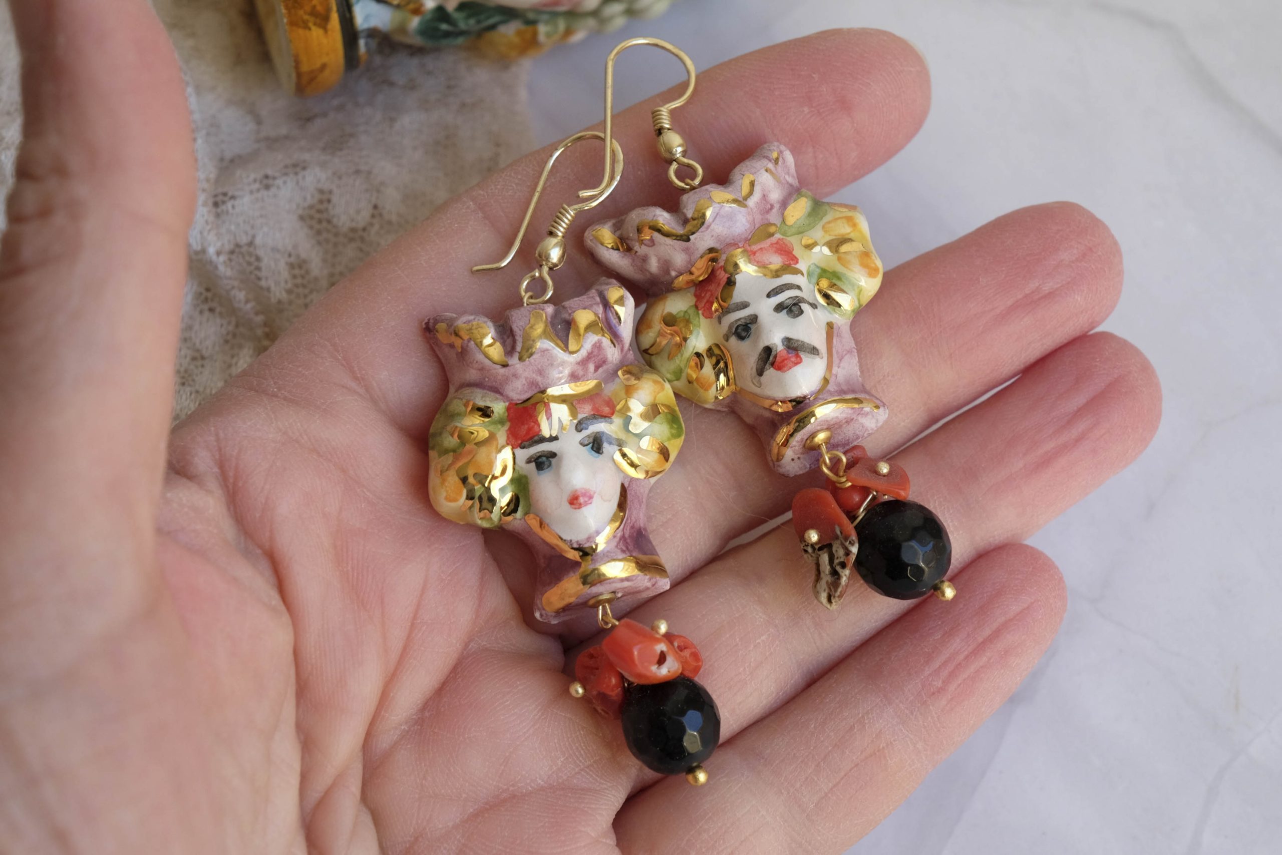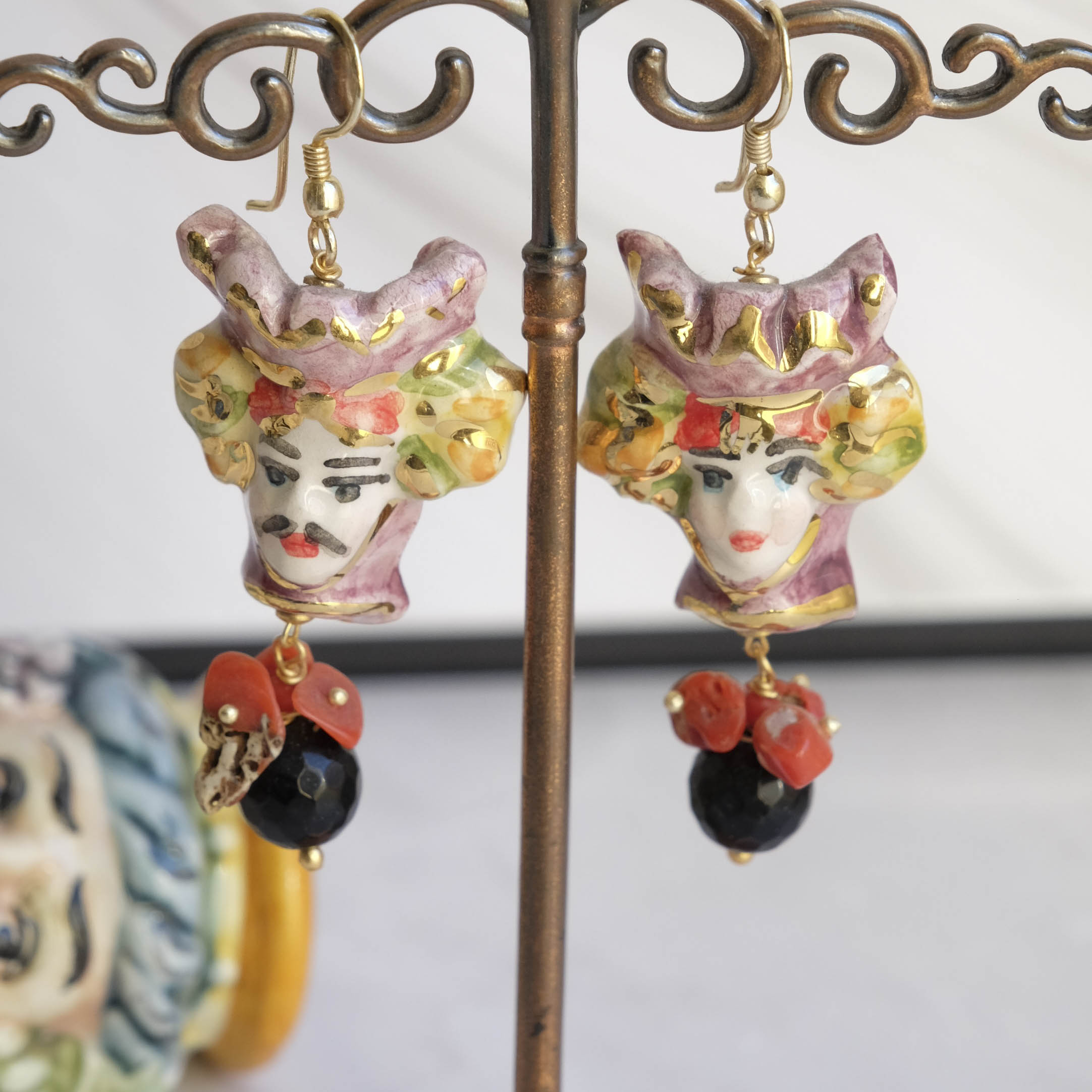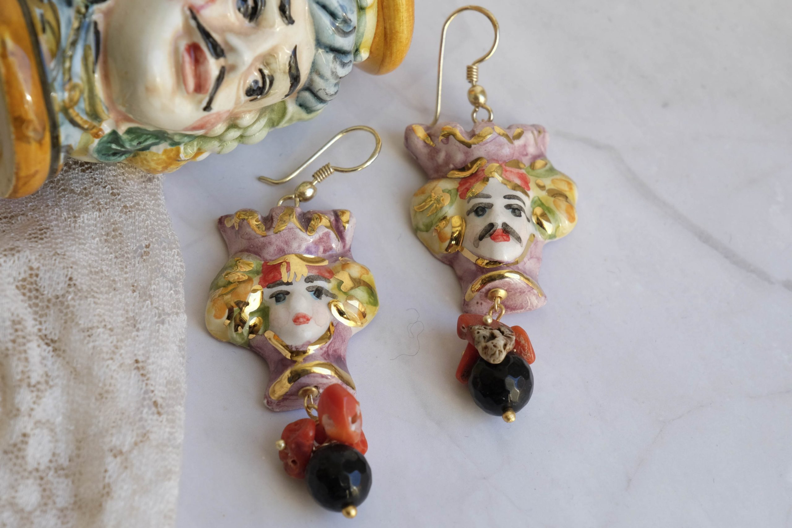 Sicilian Moor's Head earrings (men and women) in Caltagirone ceramic, 3 x 2.8 cm, handmade, with 22 kt gold leaf applications, natural onyx and coral.