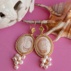 Magnificent earrings, with real shell cameos, hand-engraved by the master goldsmiths of Torre del Greco with a sun and moon design, 30 x 26 mm with a micro-pearl frame and a cluster of bright natural pearls.