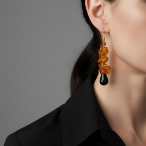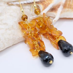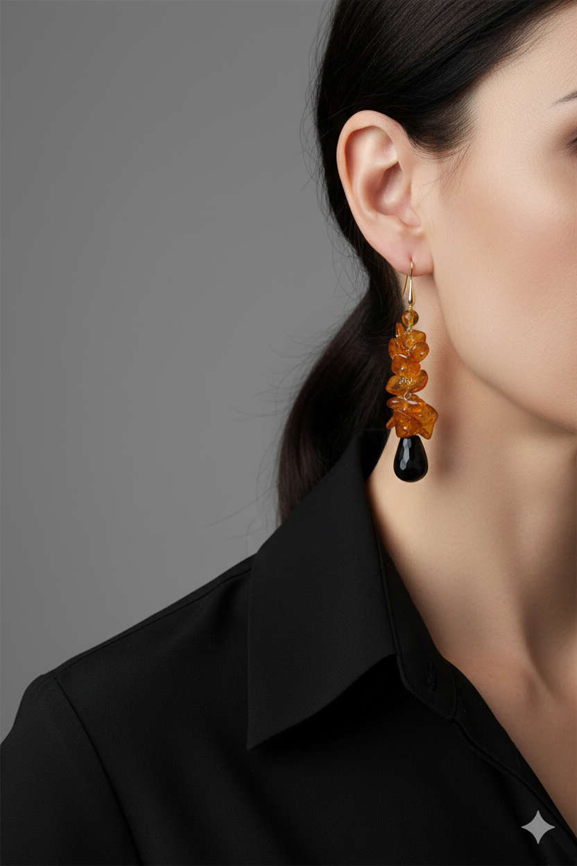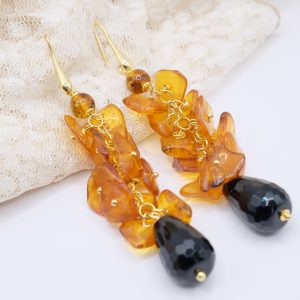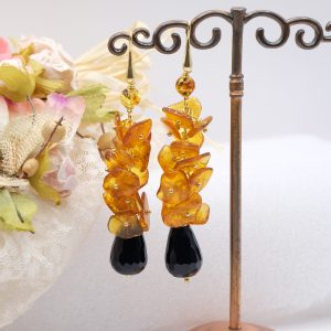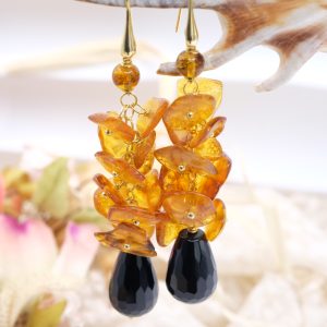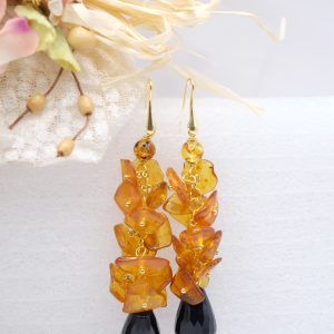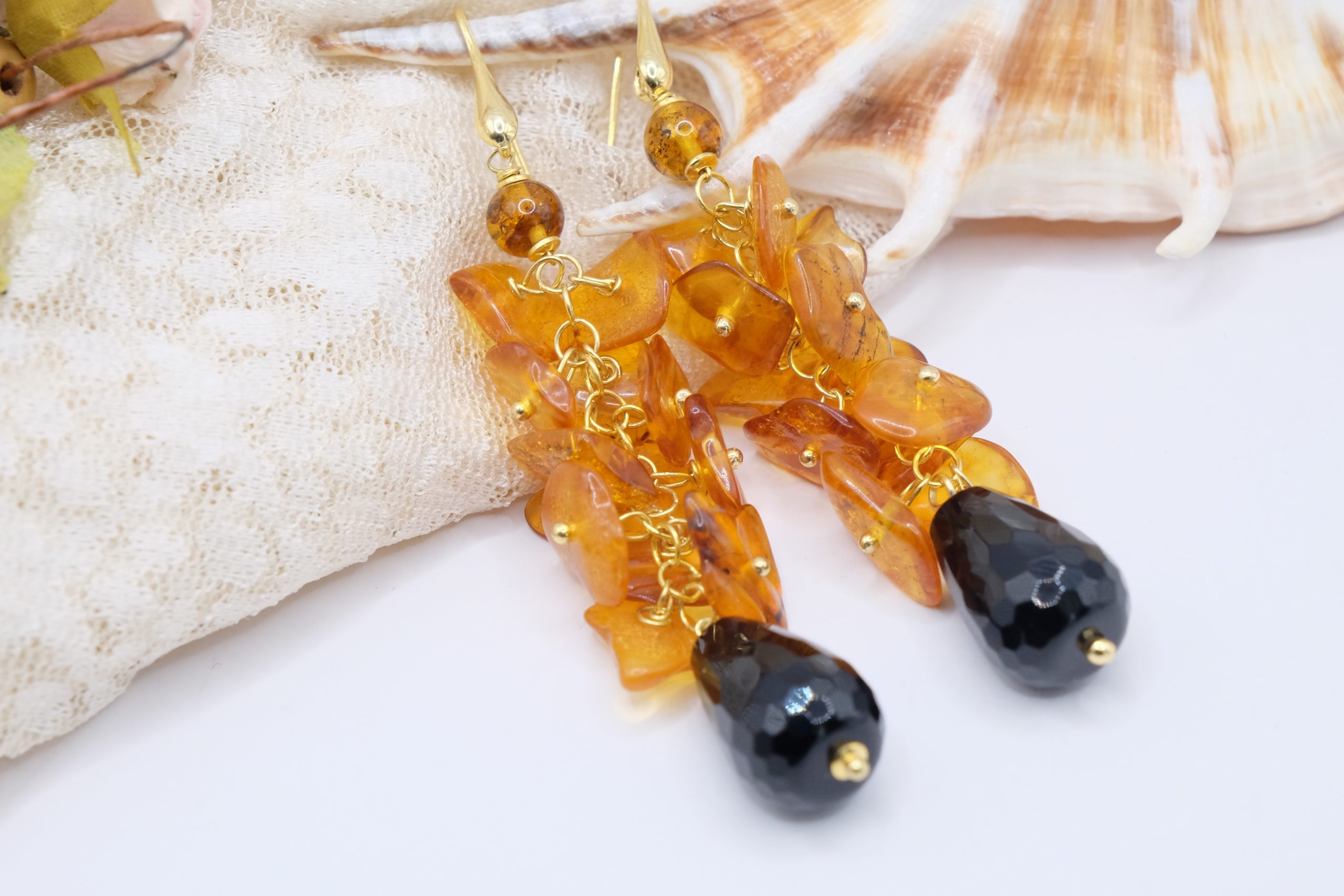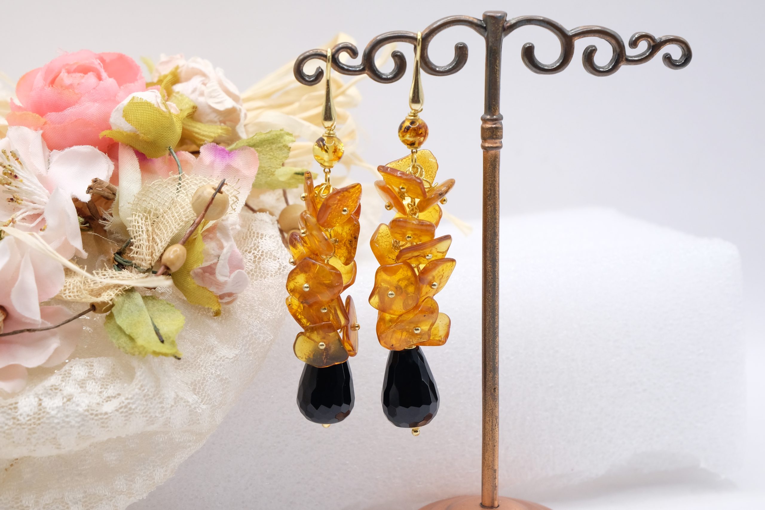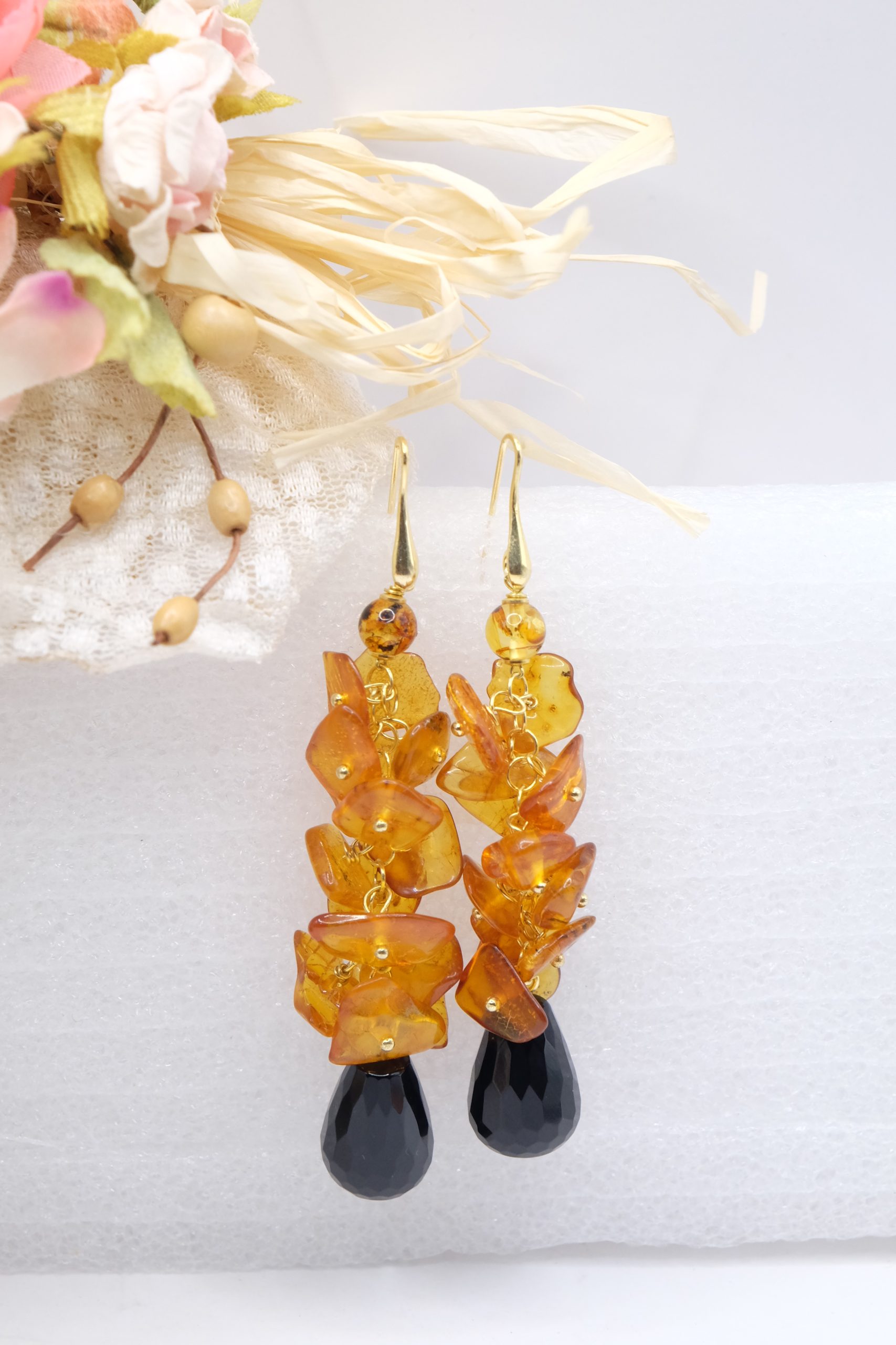 Let yourself be conquered by the magnetic beauty of these super long earrings: a bunch of natural amber that captures the light and a Onyx drop intense that gives depth and character. 🌿🖤