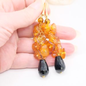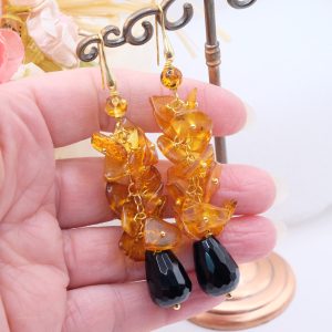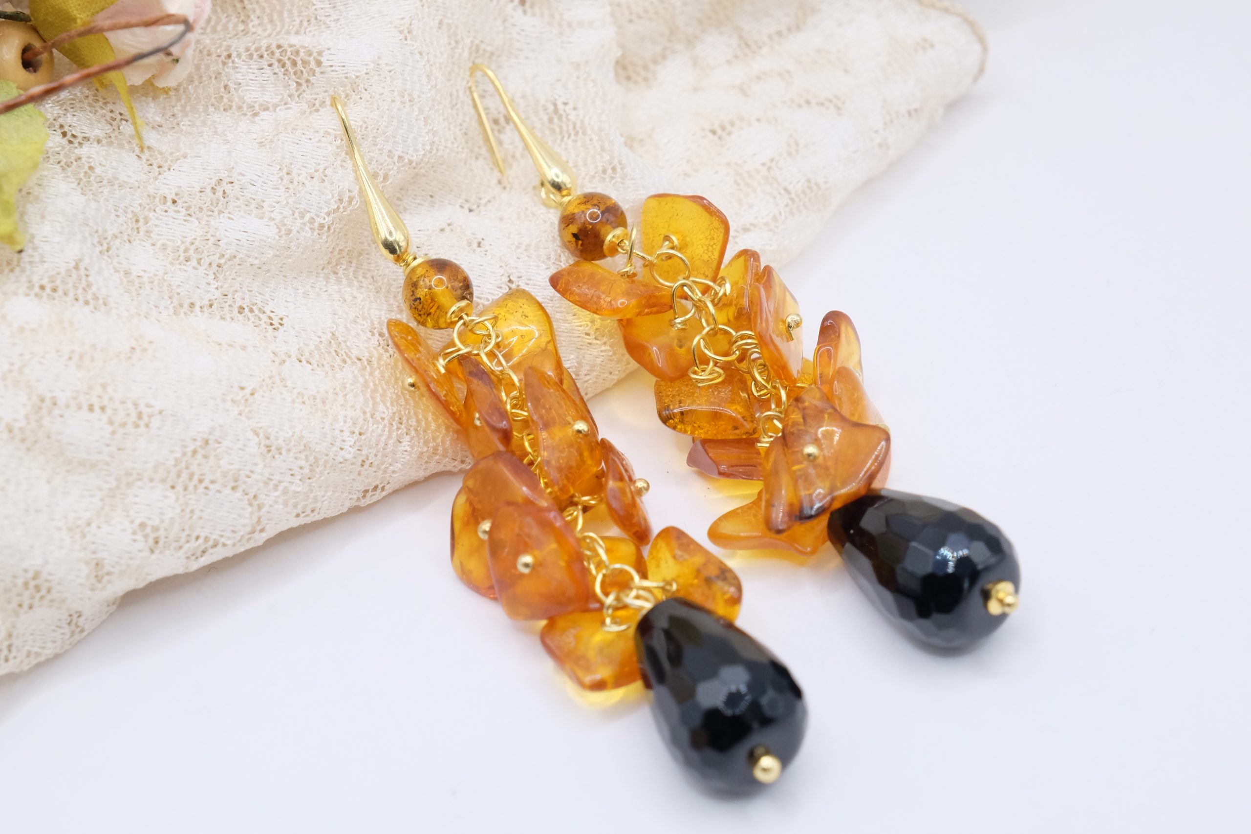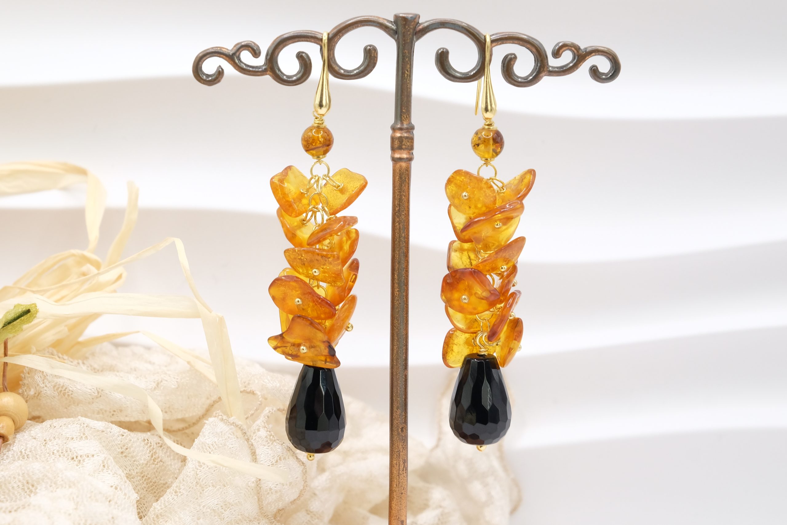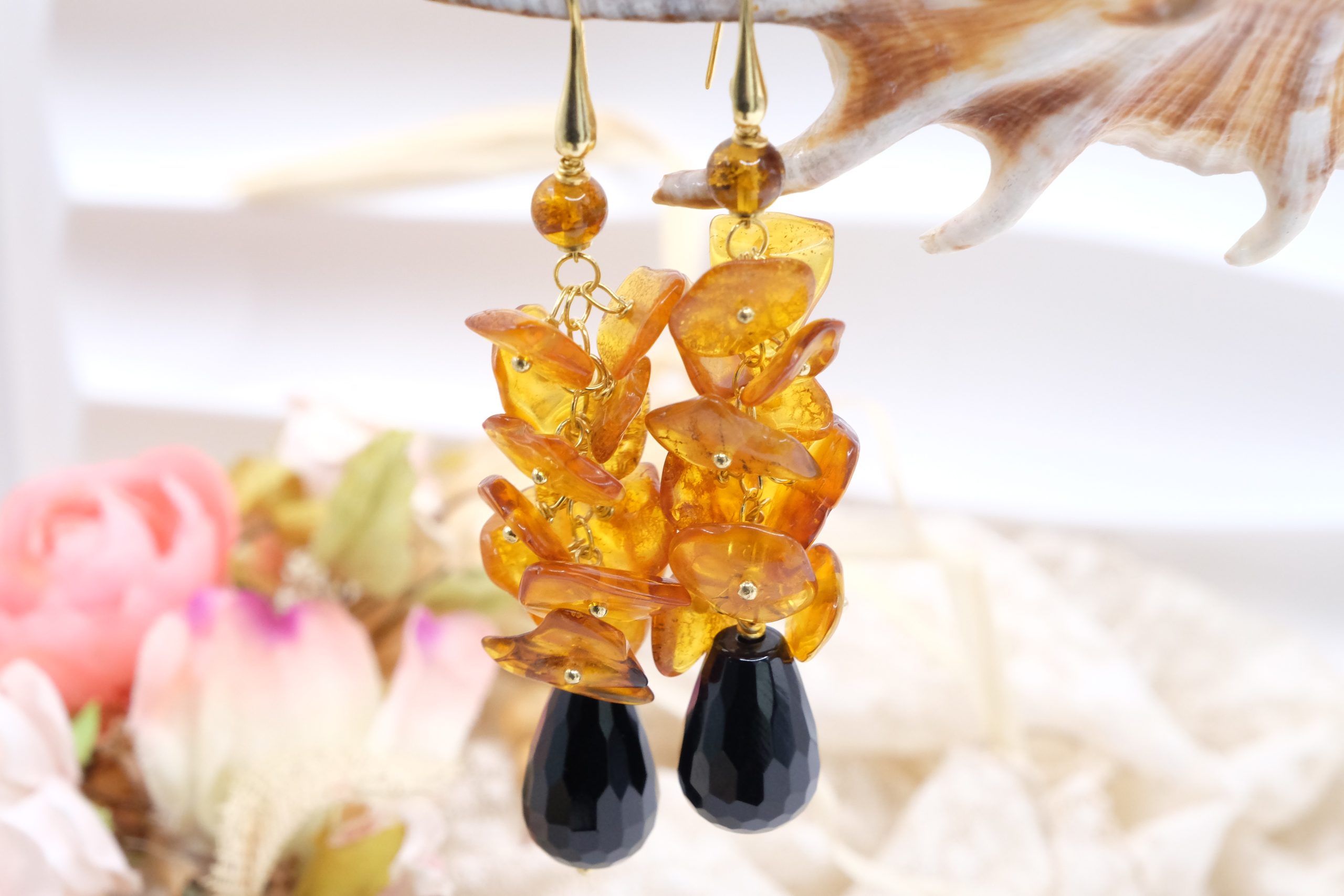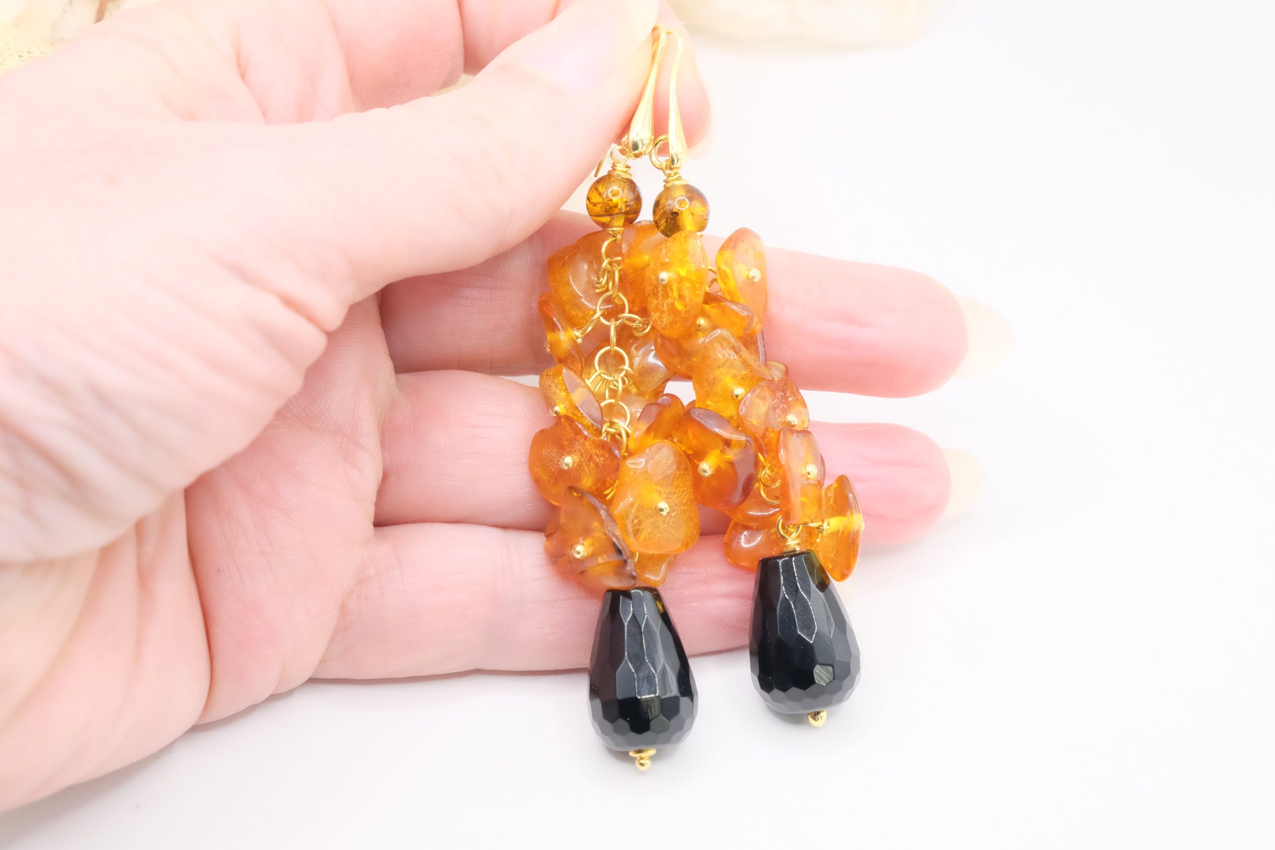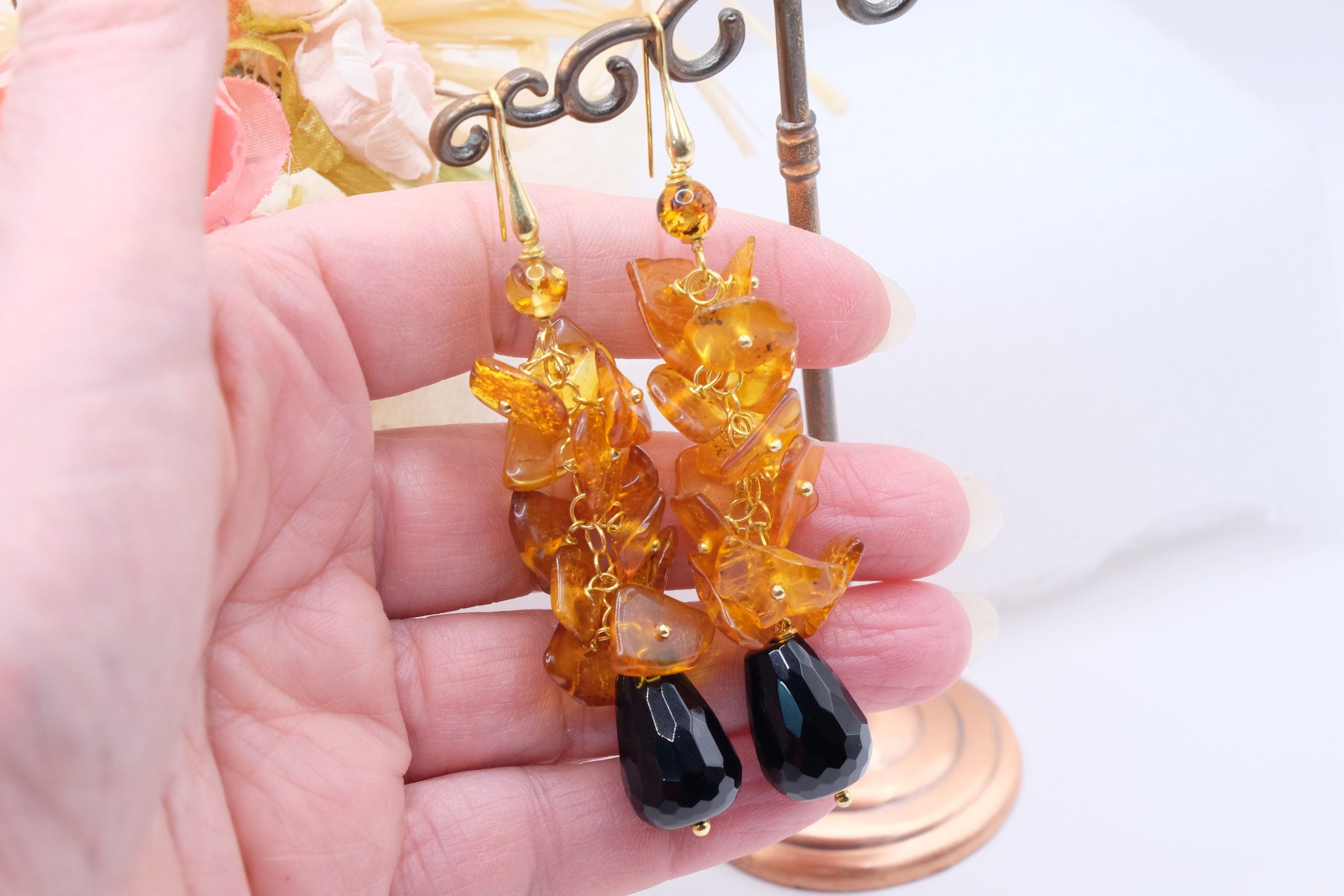 Extra-long, statement earrings with a cluster of natural amber and an onyx drop.