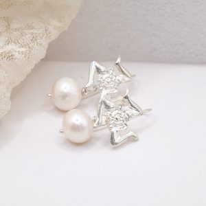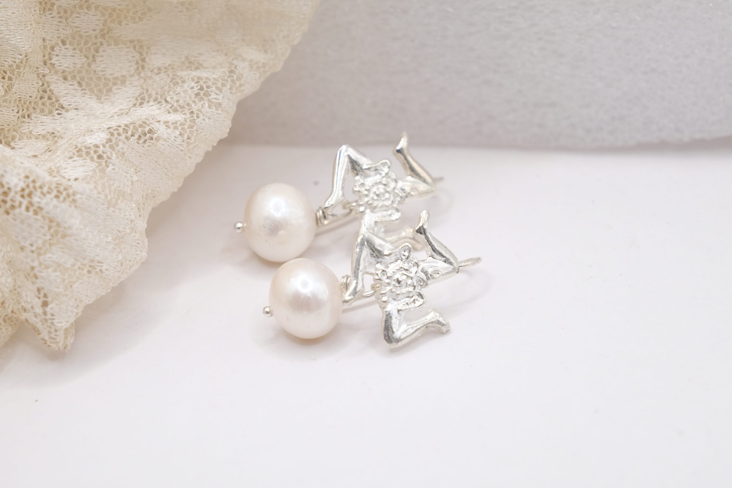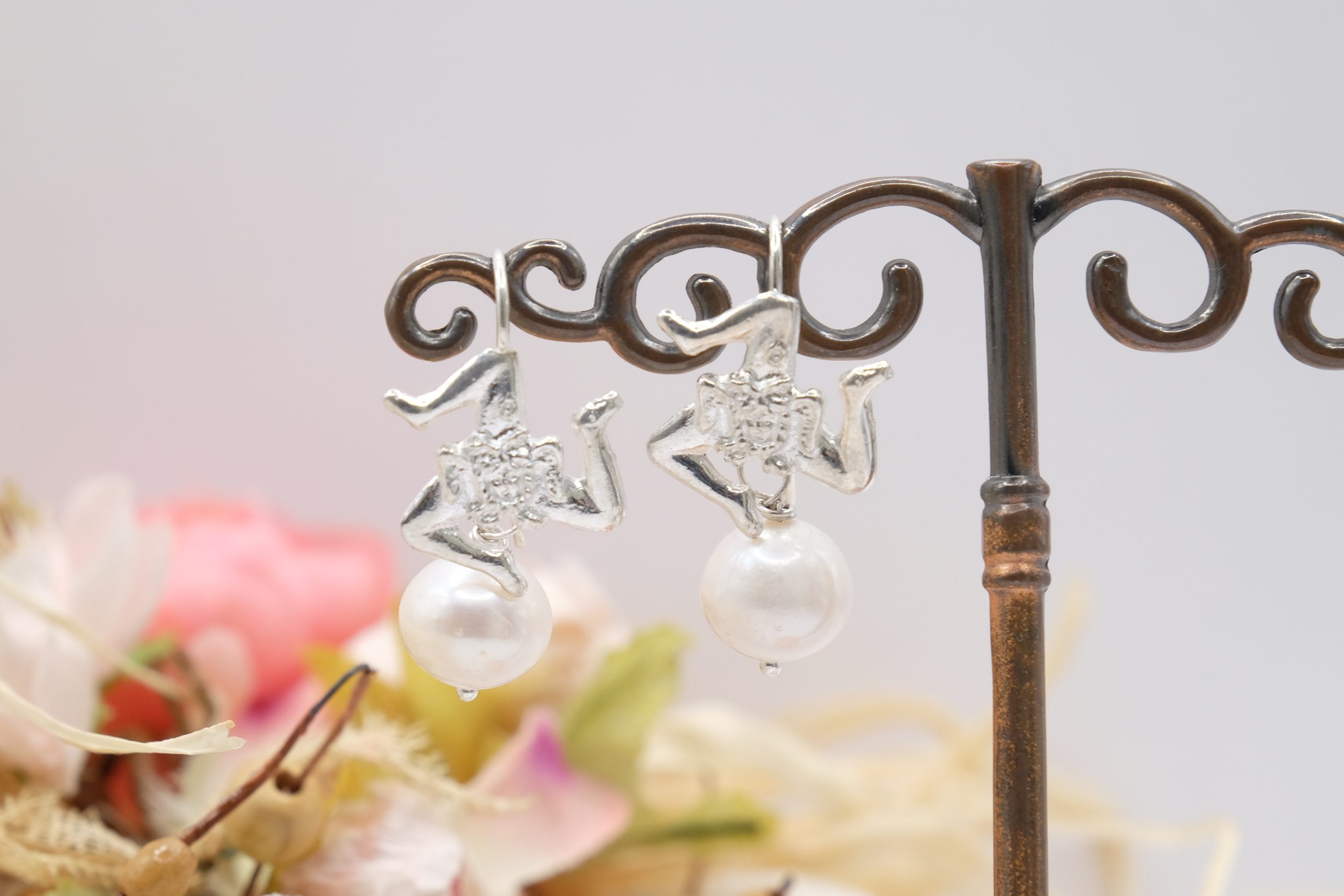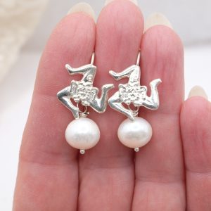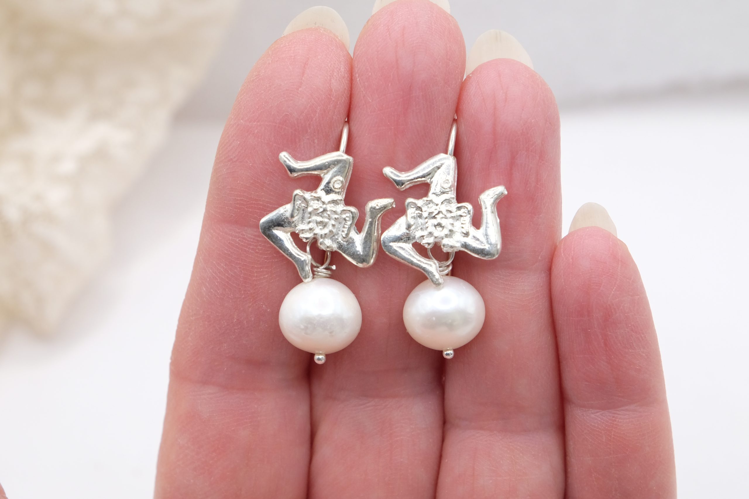 Sicilian Trinacria earrings made in rhodium-plated 925 silver, embellished with natural pearls 🤍
