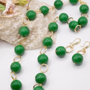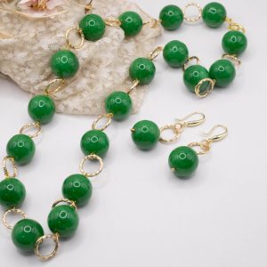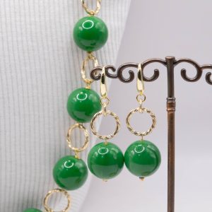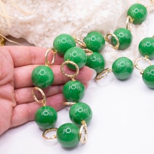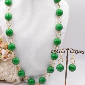 Handcrafted set consisting of a lightweight high-quality Emerald Green resin necklace with 20mm spheres, interspersed with an aluminium chain, in a rosary-like design