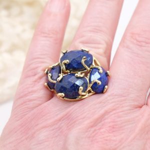 Anello con montatura realizzata in ottone, dai dettagli lavorati e incisioni che aggiungono un tocco di carattere al design. Al centro dell’anello sono posizionate 4 pietre di lapislazuli naturale sfaccettato. Questo anello può essere indossato da solo per attirare l’attenzione sulla bellezza delle pietre o abbinato ad altri gioielli per creare un look unico e sofisticato.