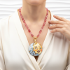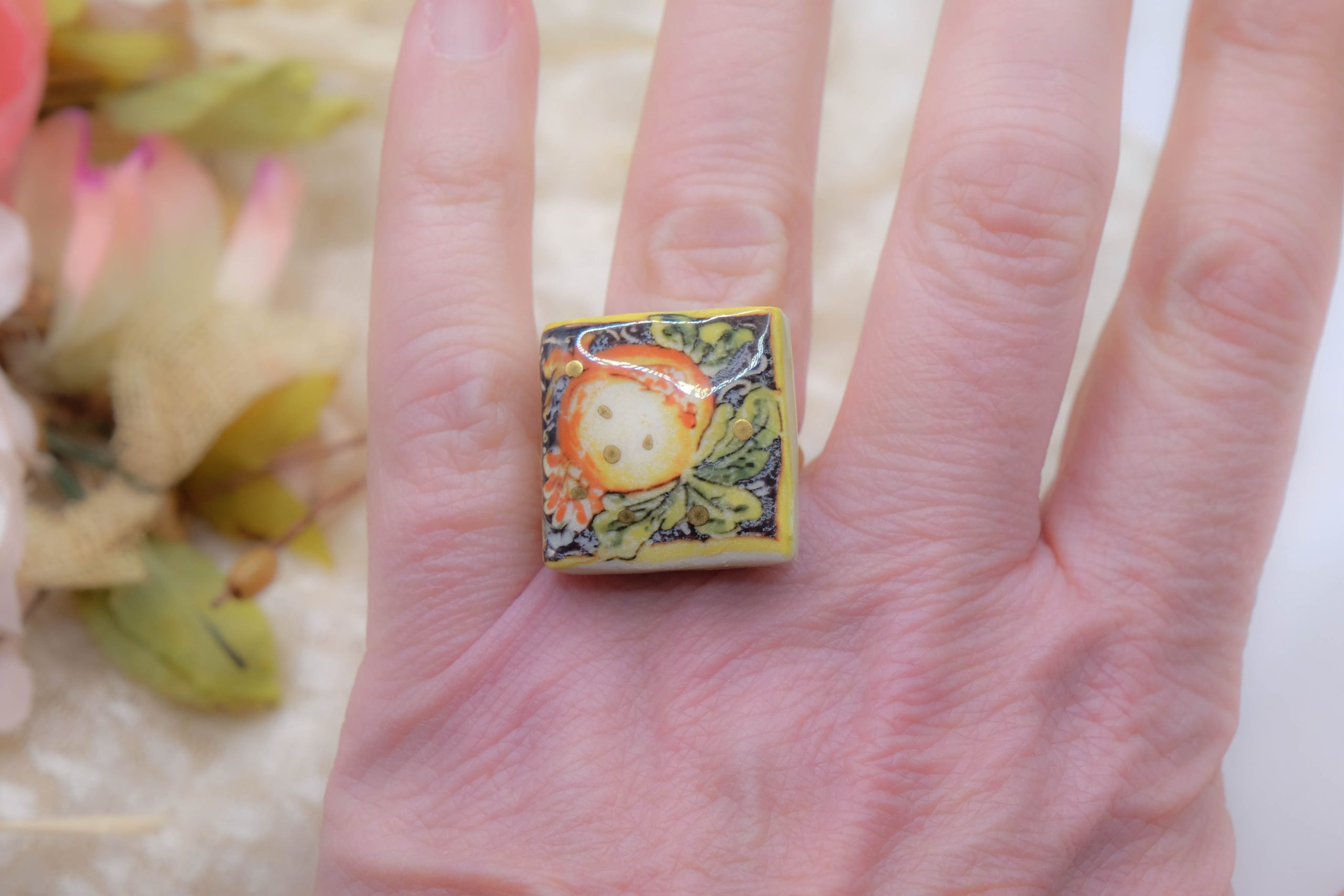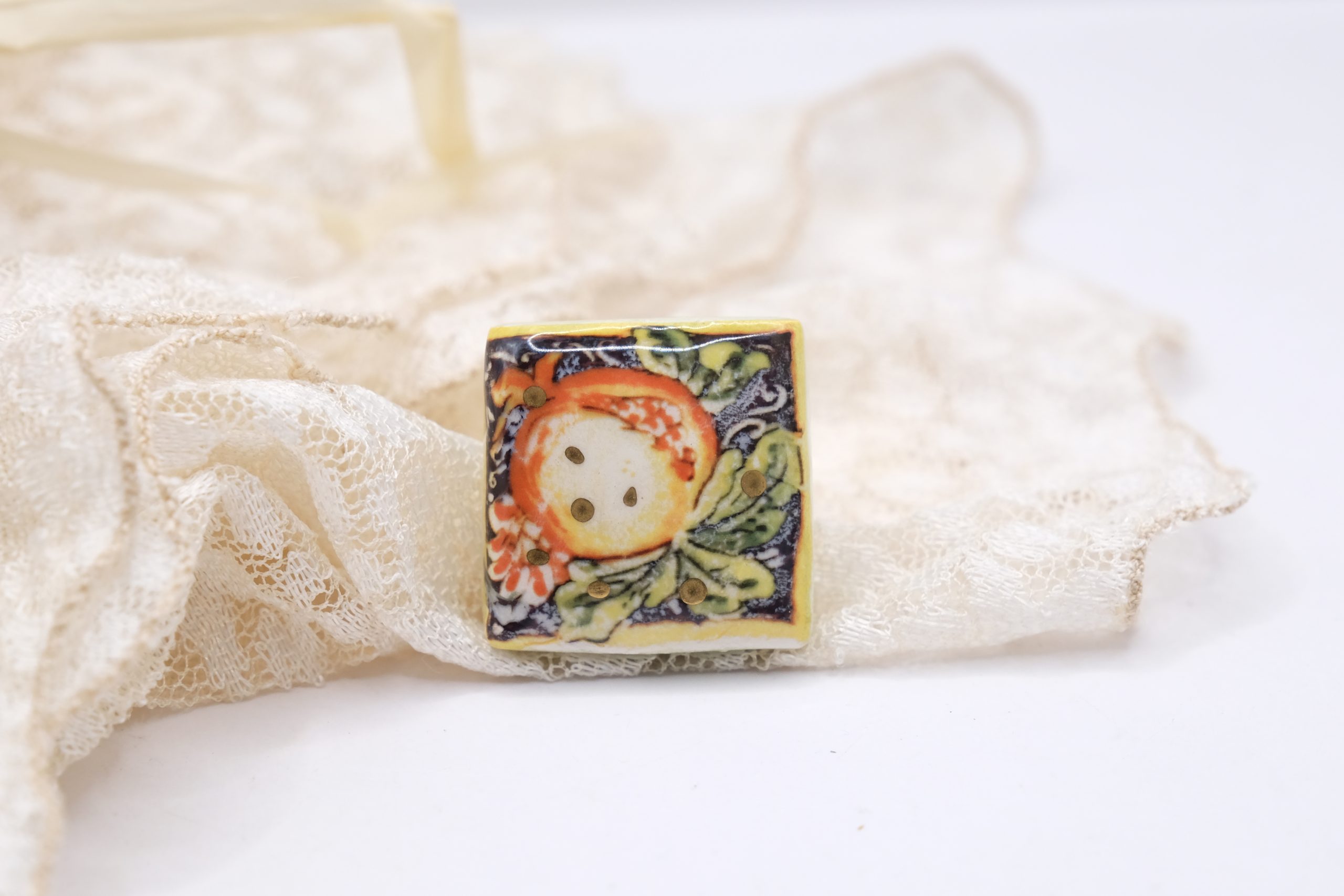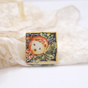 Anello con mattonella in ceramica di Caltagirone con decoro melograno beneaugurante con piccoli inserti in oro zecchino.