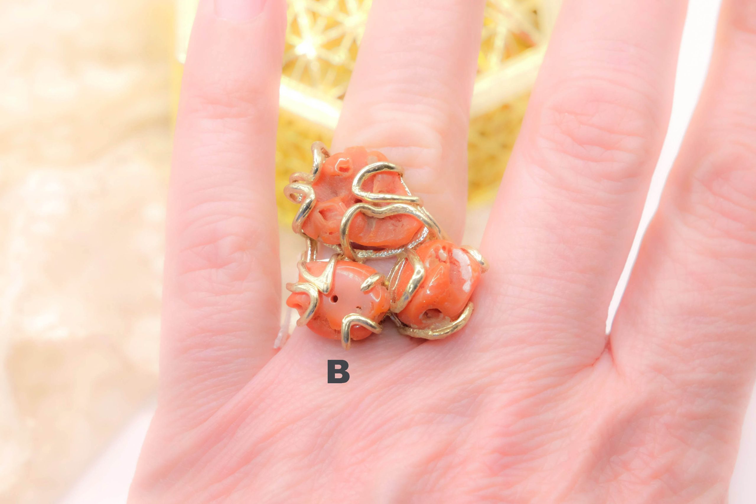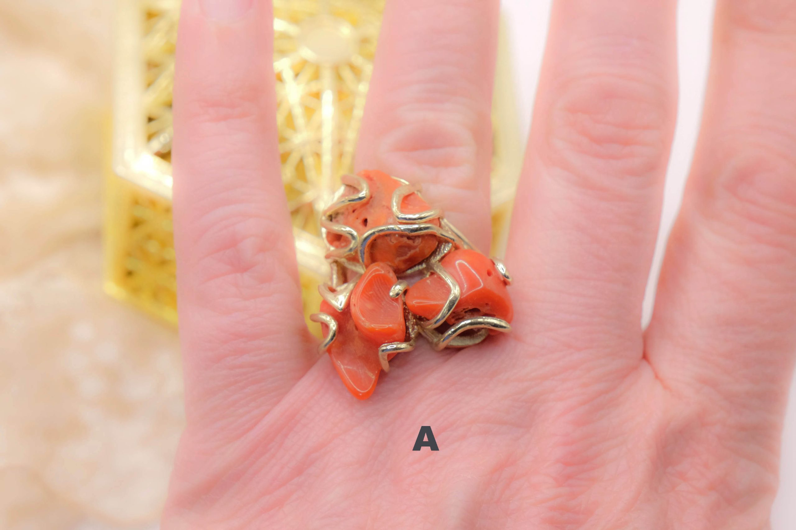 Anello Artigianale Corallo Naturale Ottone 3 Pietre