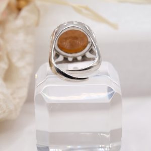 Anello in argento 925 placcato rodio, con vero cammeo in conchiglia sardonica, realizzato a mano dai maestri artigiani di Torre del Greco e illuminato da una cornice di brillantissimi zirconi bianchi..