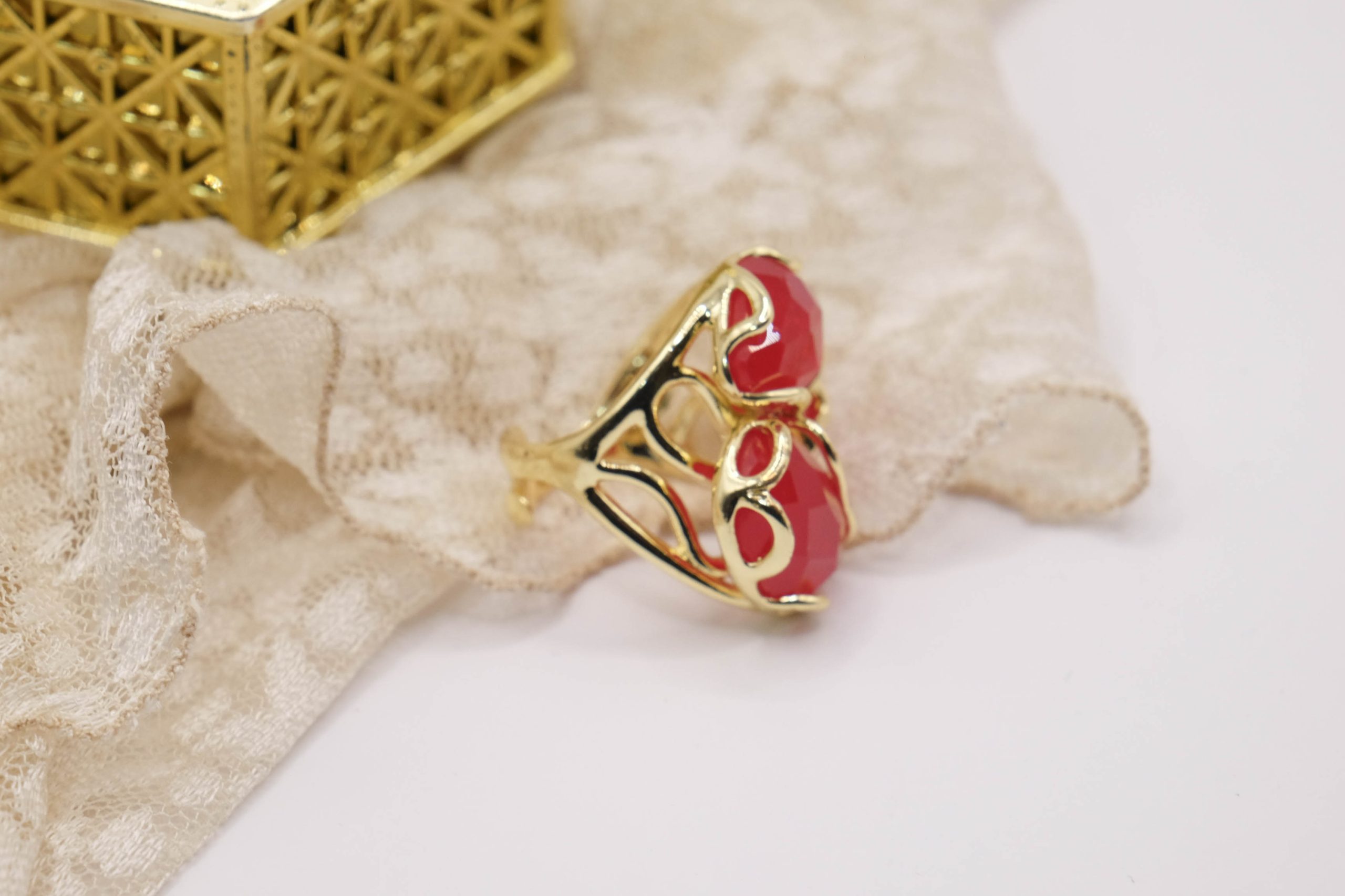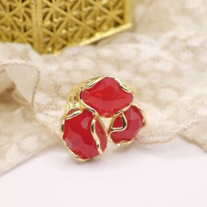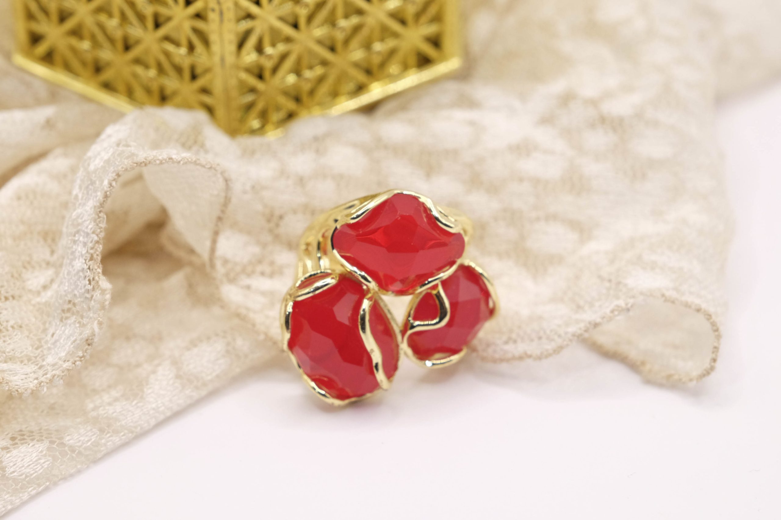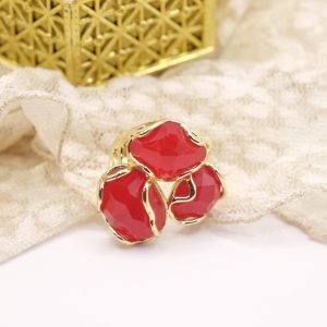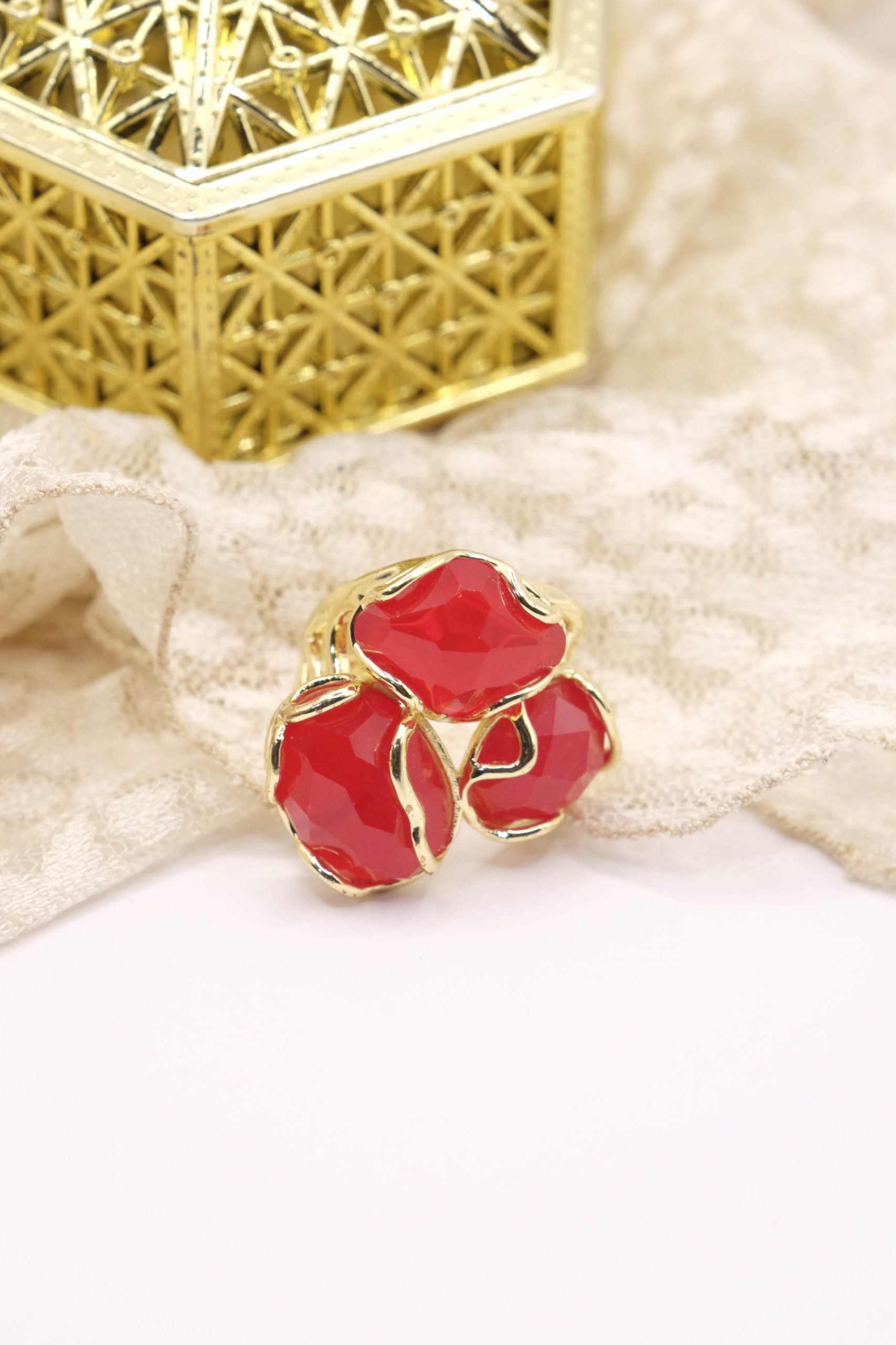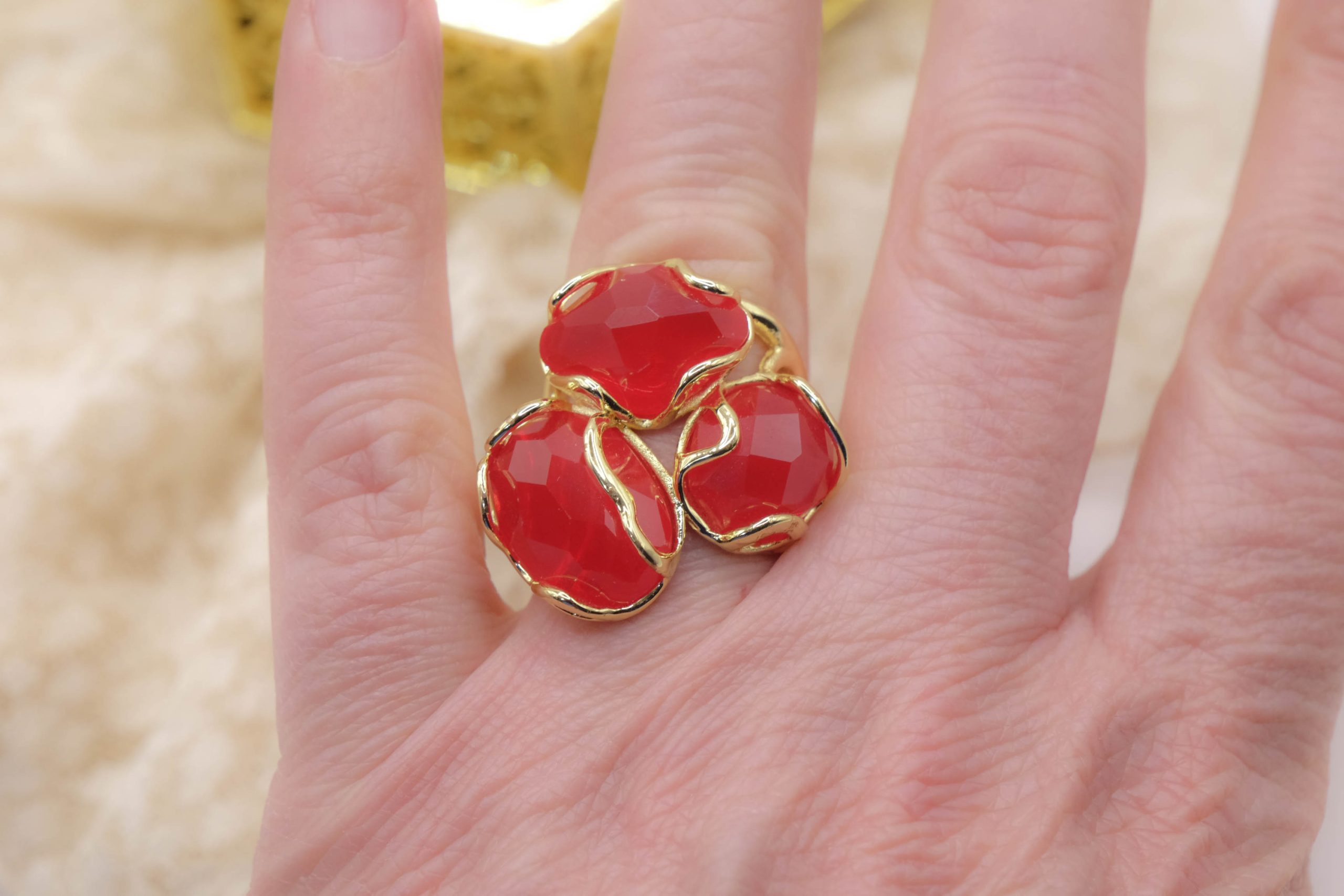 Elegante anello con 3 pietre in occhio di gatto sfaccettato Rosso su montatura in ottone