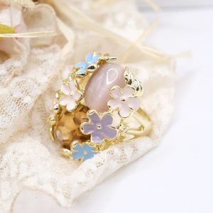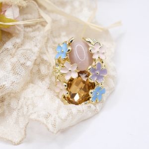 Elegante anello maxi con fiori smaltati, occhio di gatto rosa e cristallo ambrato su montatura in ottone