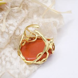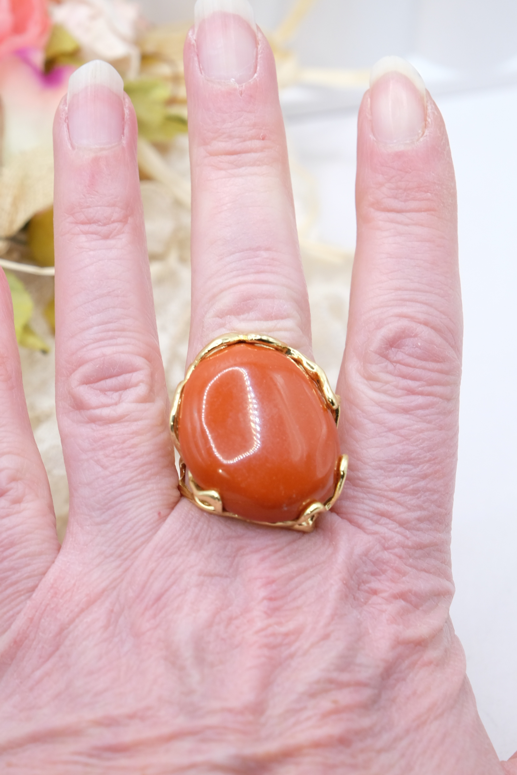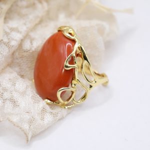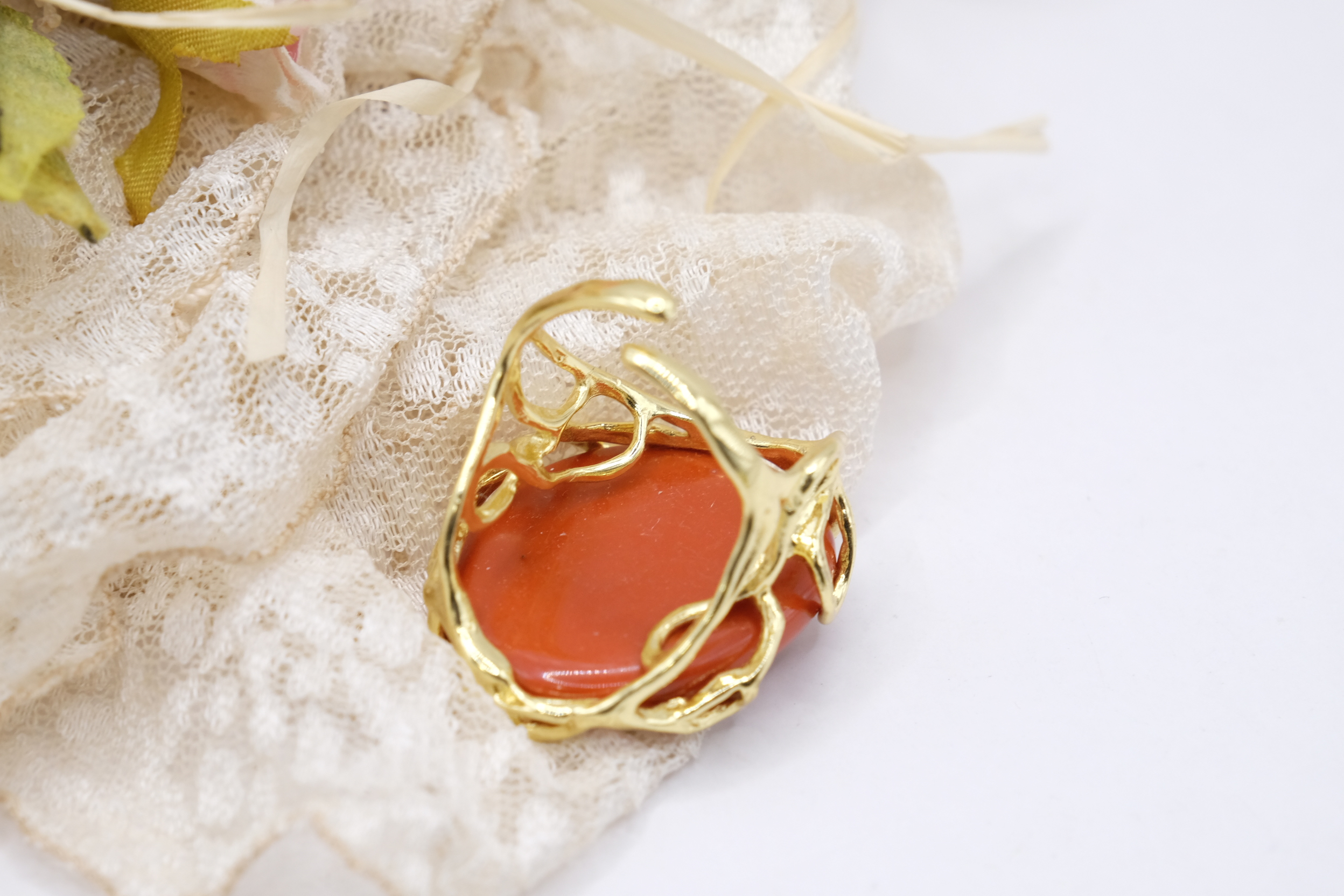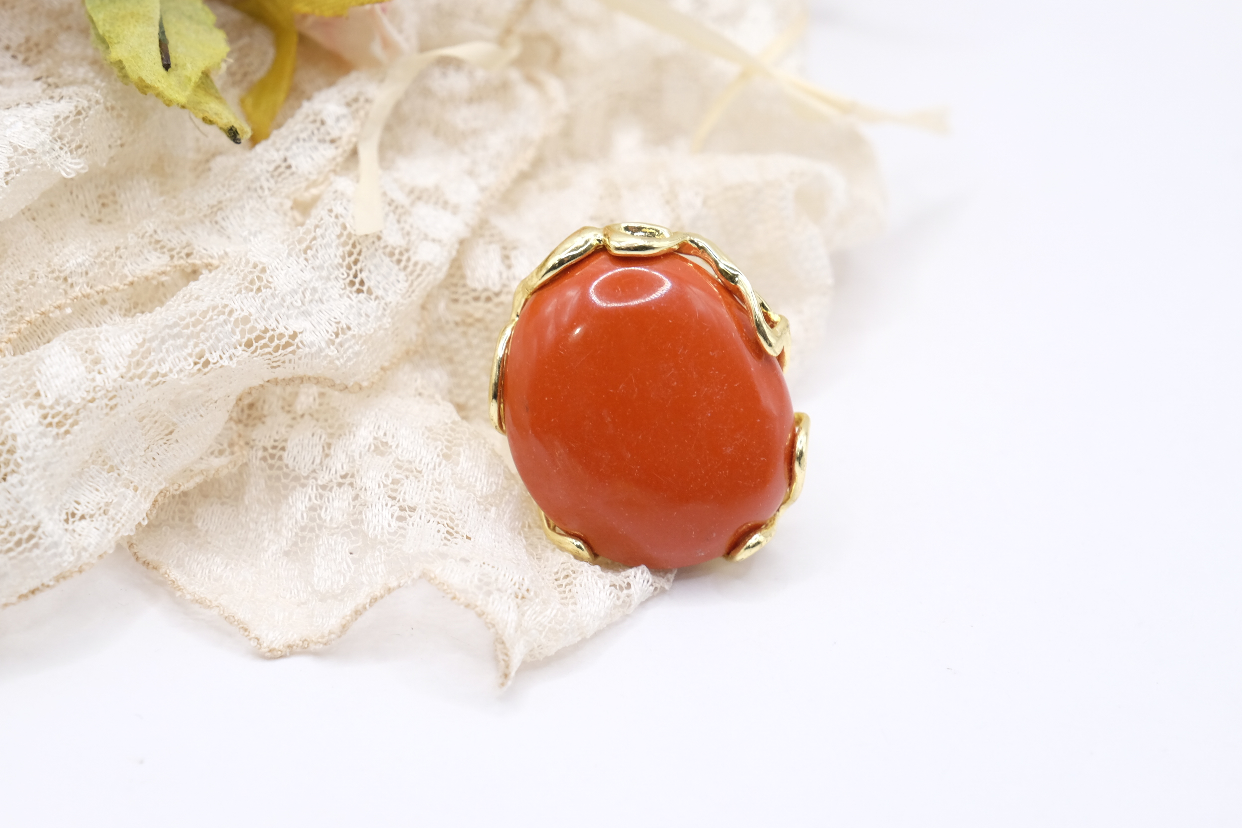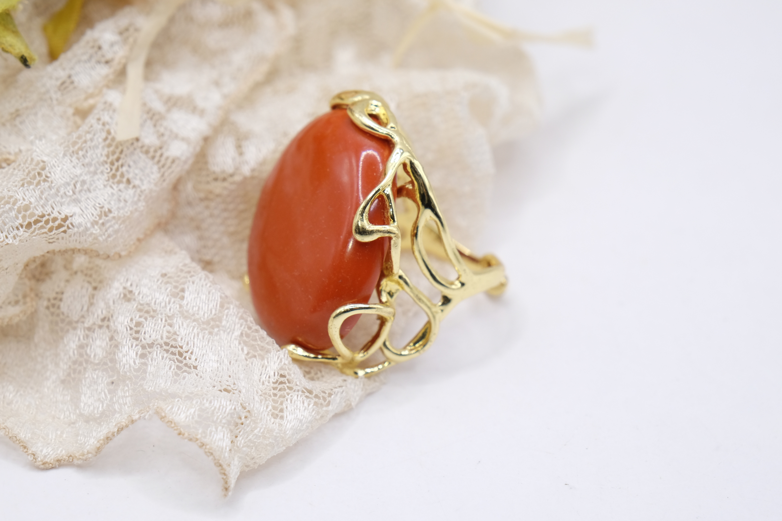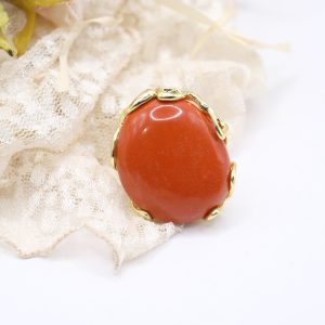 Anello con montatura realizzata in ottone, dai dettagli lavorati e incisioni che aggiungono un tocco di carattere al design. Al centro dell’anello è posizionata una grande pietra di pasta di corallo finissima. Questo anello può essere indossato da solo per attirare l’attenzione sulla bellezza delle pietre o abbinato ad altri gioielli per creare un look unico e sofisticato.