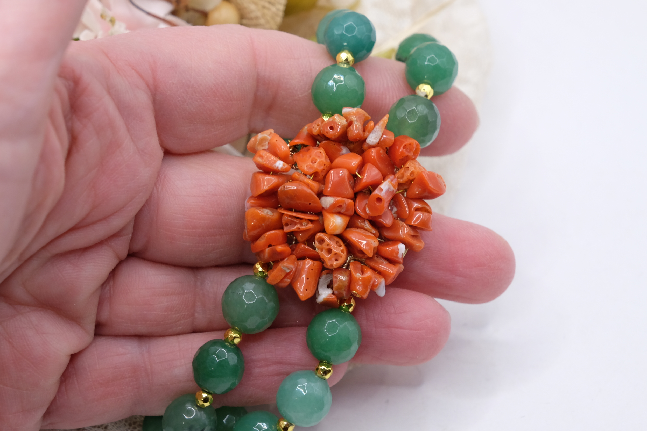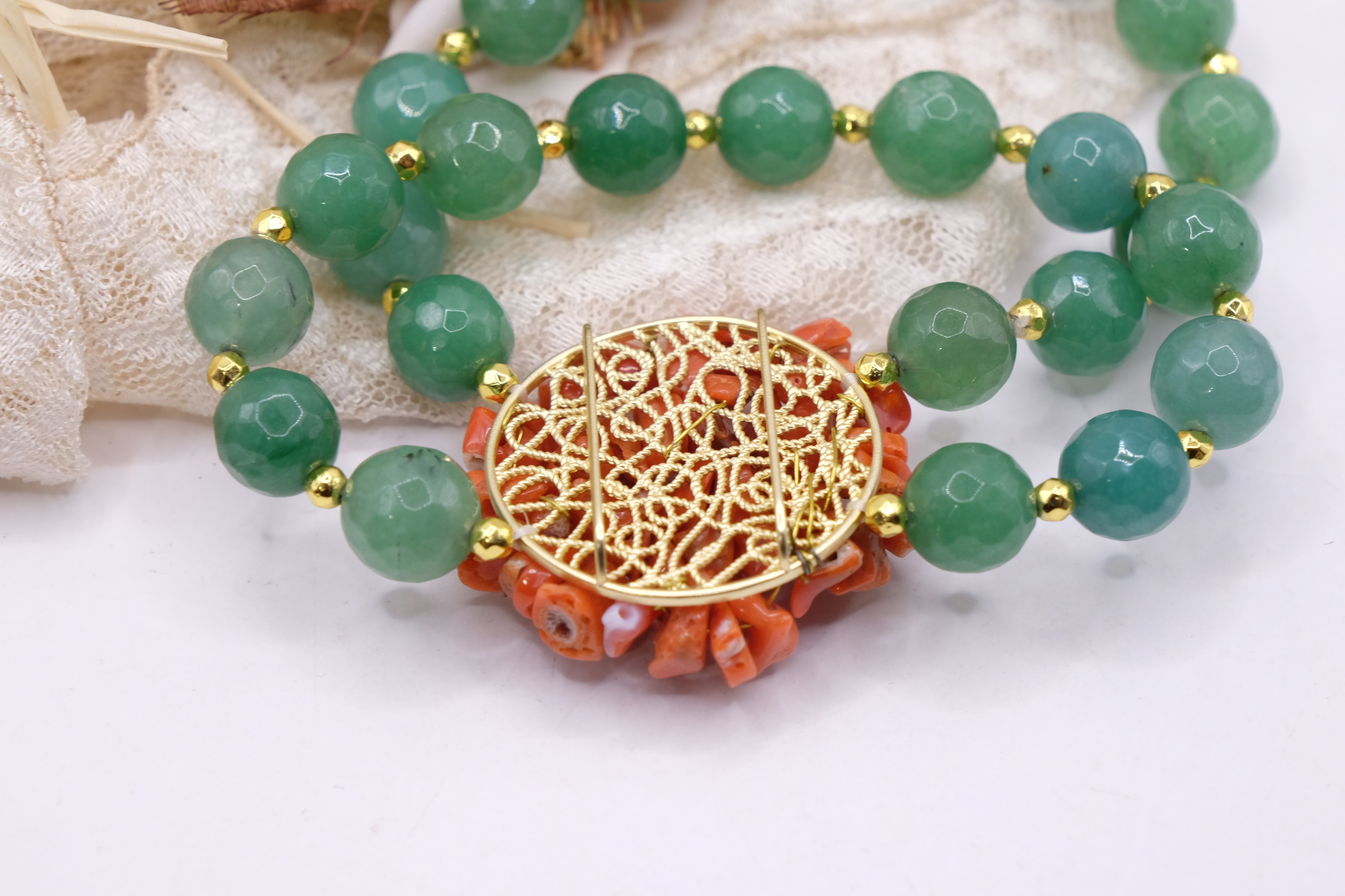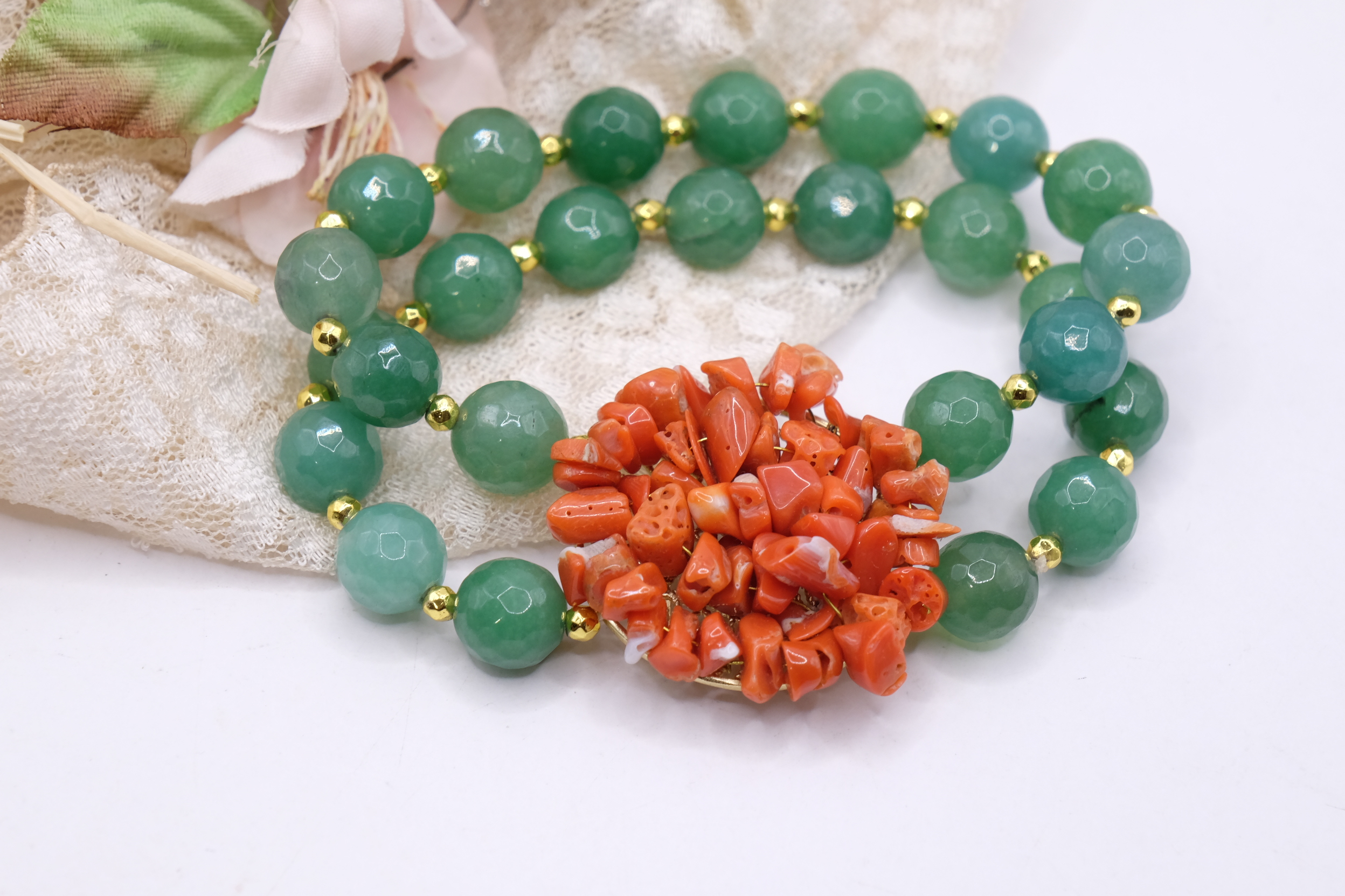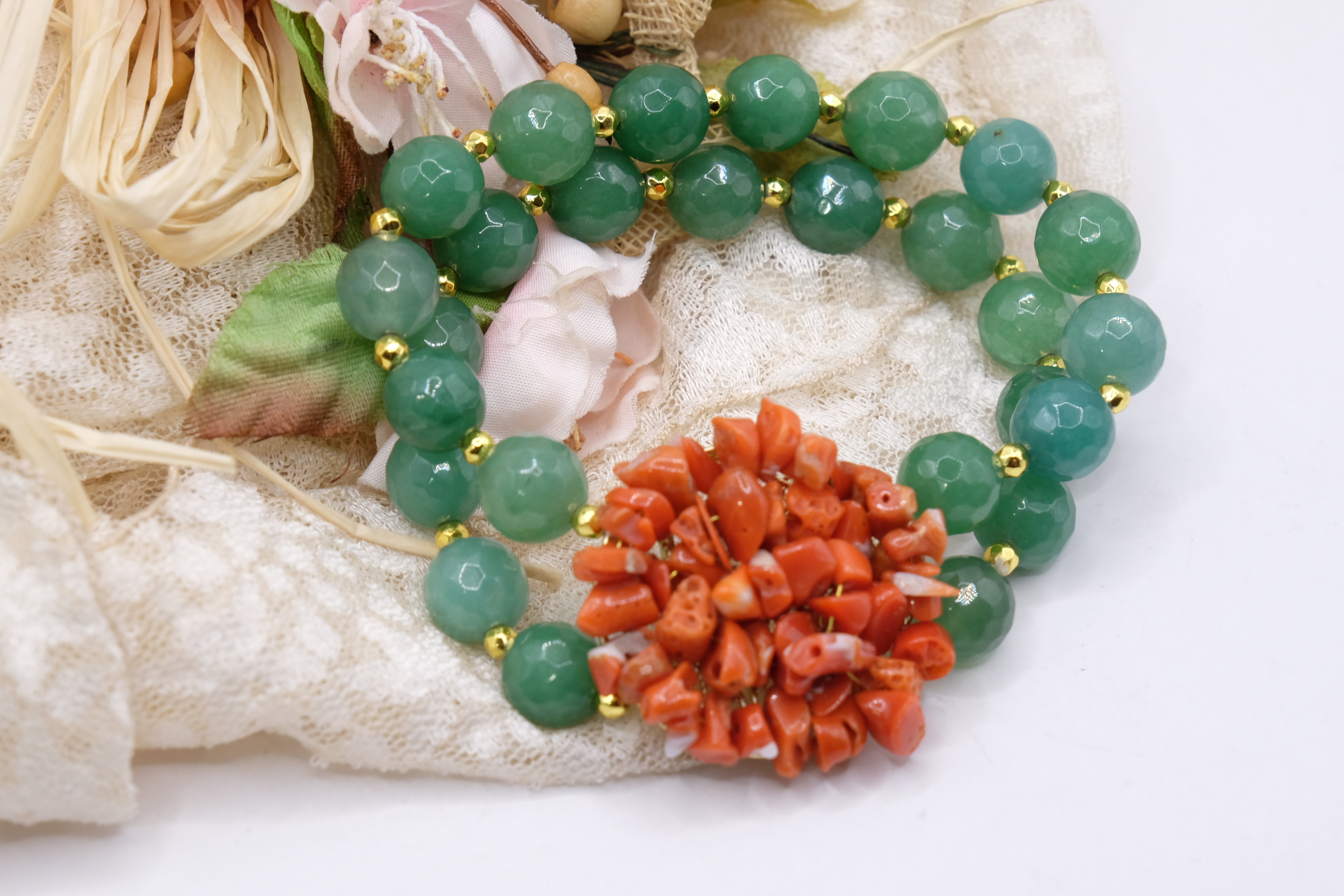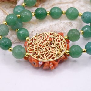 Bracciale artigianale in giada verde sfaccettata naturale da 10 mm a 2 fili , elasticizzato con centrale tessito a mano da 3,3 cm con corallo naturale