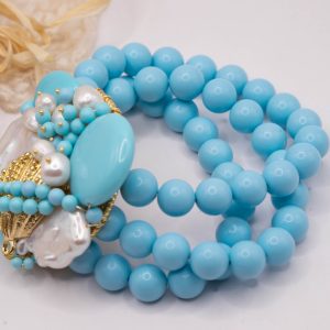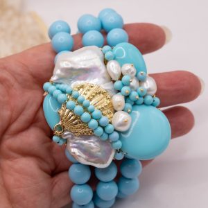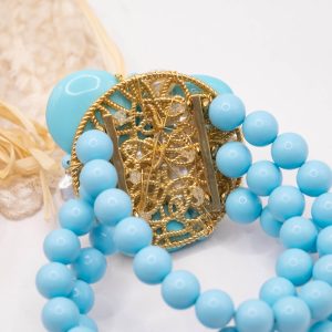 Bracciale artigianale in pasta di turchese a 3 fili , elasticizzato con centrale tessito a mano da 5,5/6 cm con elementi in pasta di turchese 4 fiori di Torre del Greco, perle luminosissime e conchiglia in ottone laminato oro