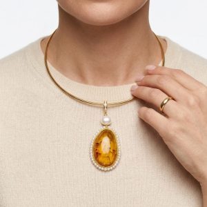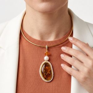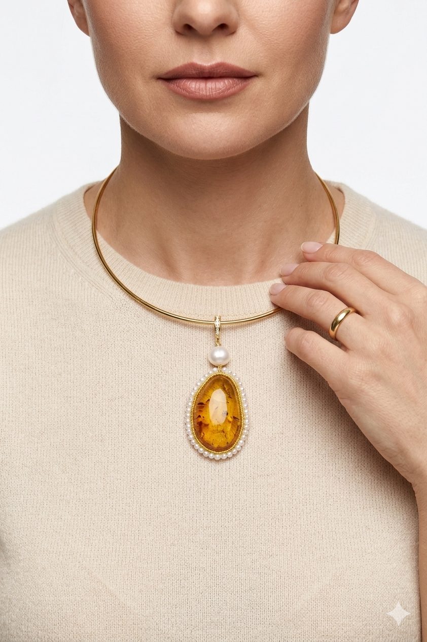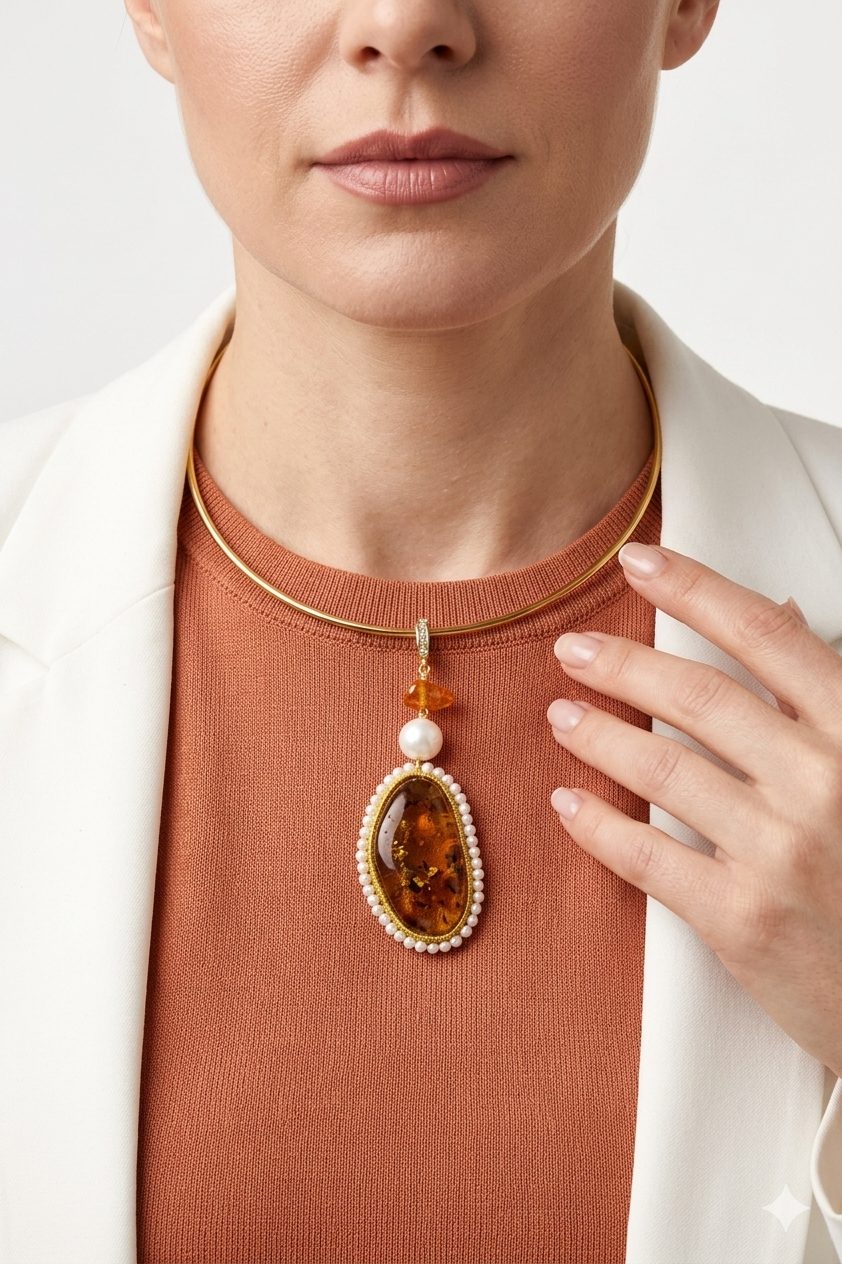 Pendente ciondolo con grande ambra del baltico a lavorazione sautache e perle naturali