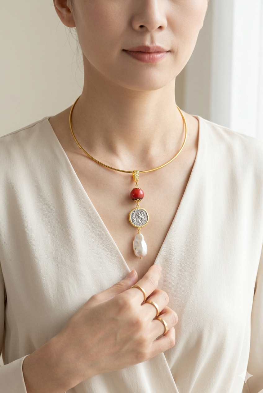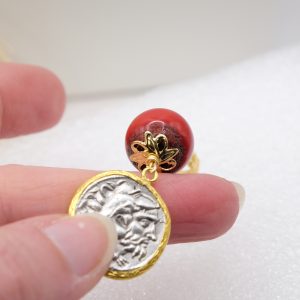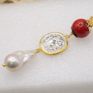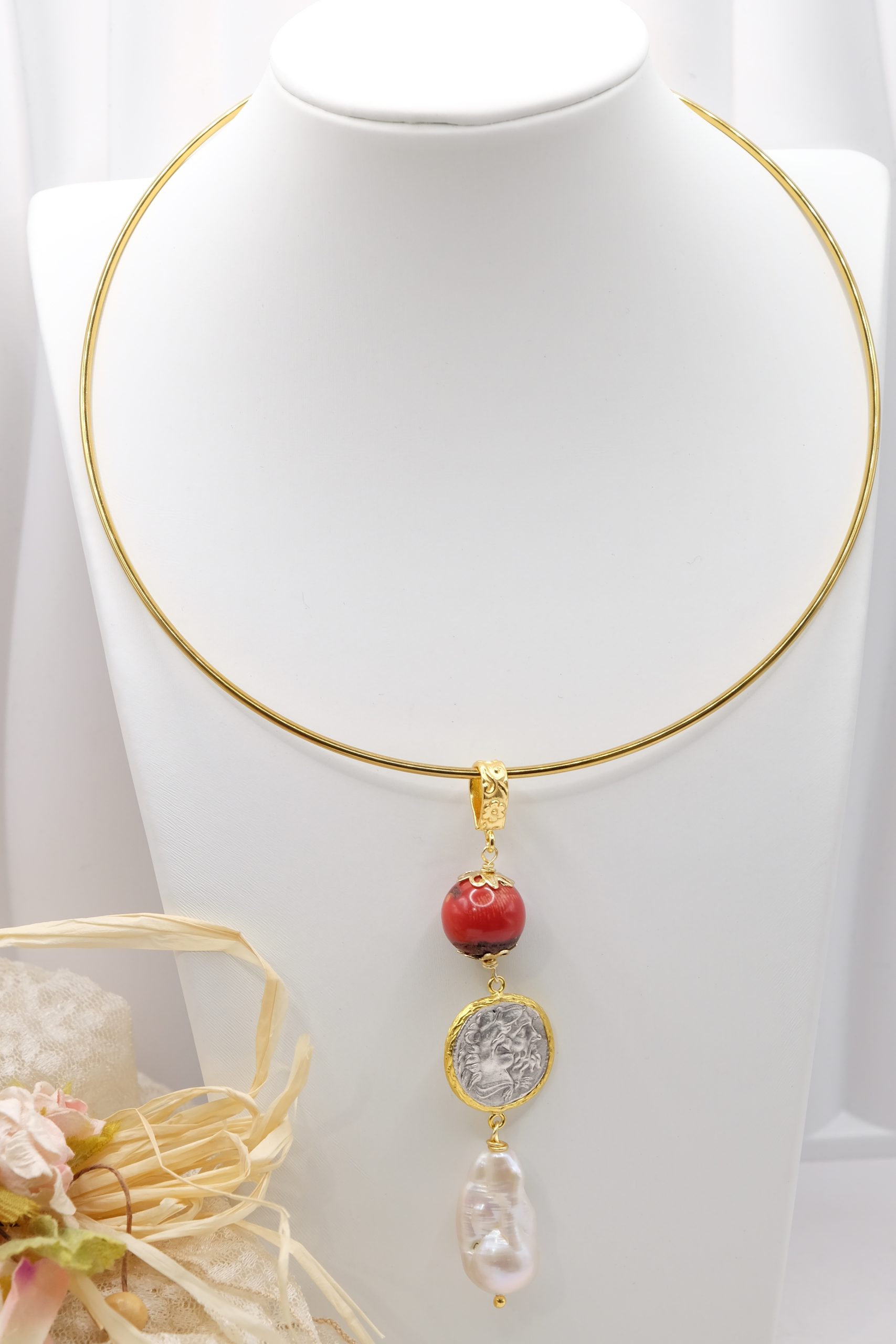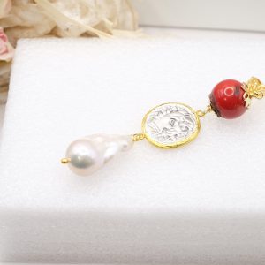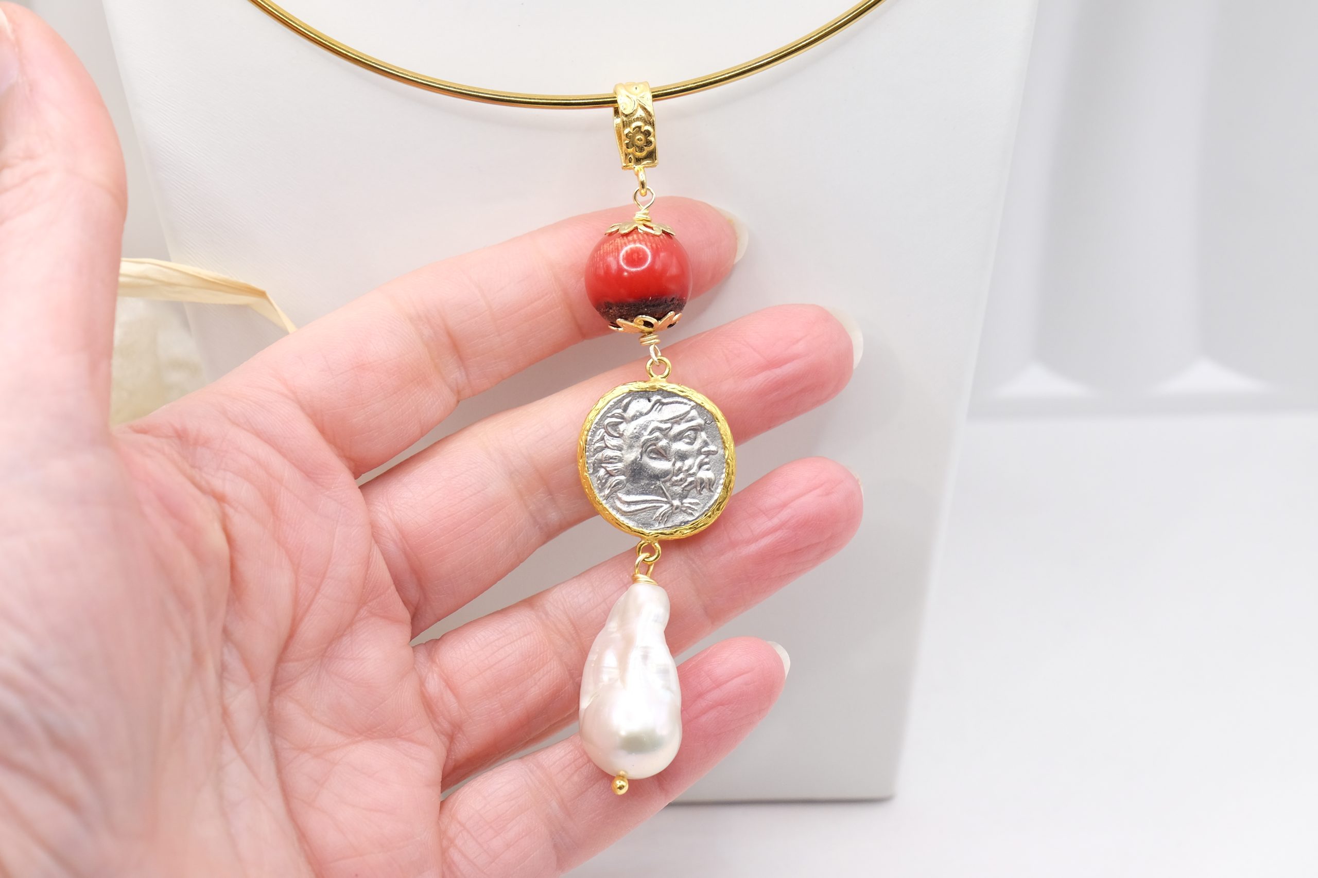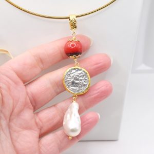 Ciondolo Artigianale Moneta Anticata TQ Perla Corallo B Grezzo