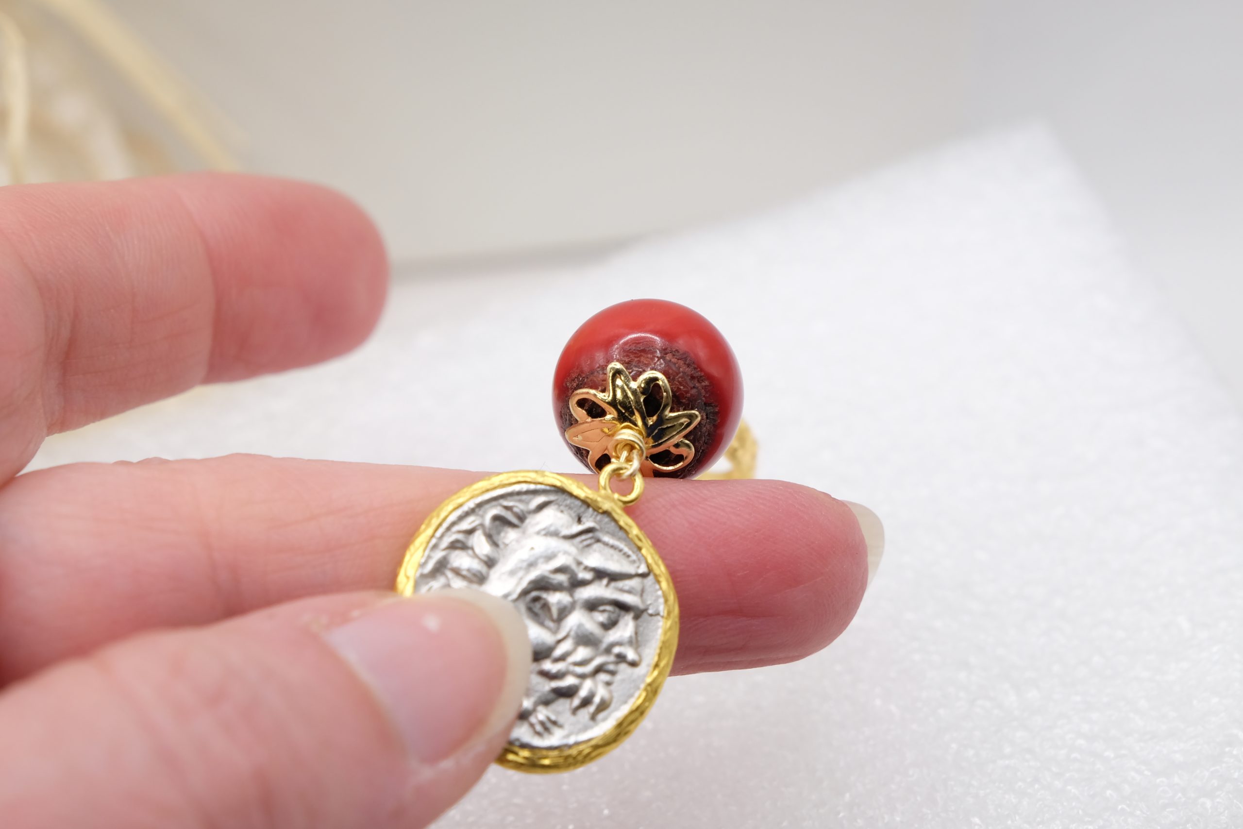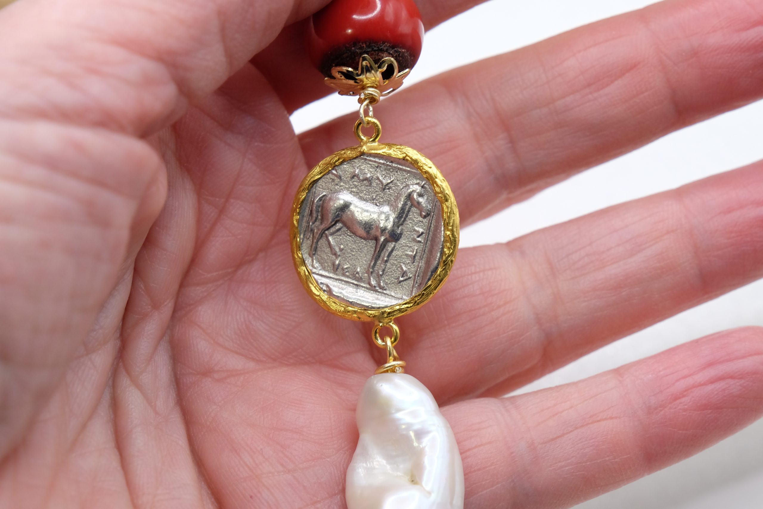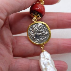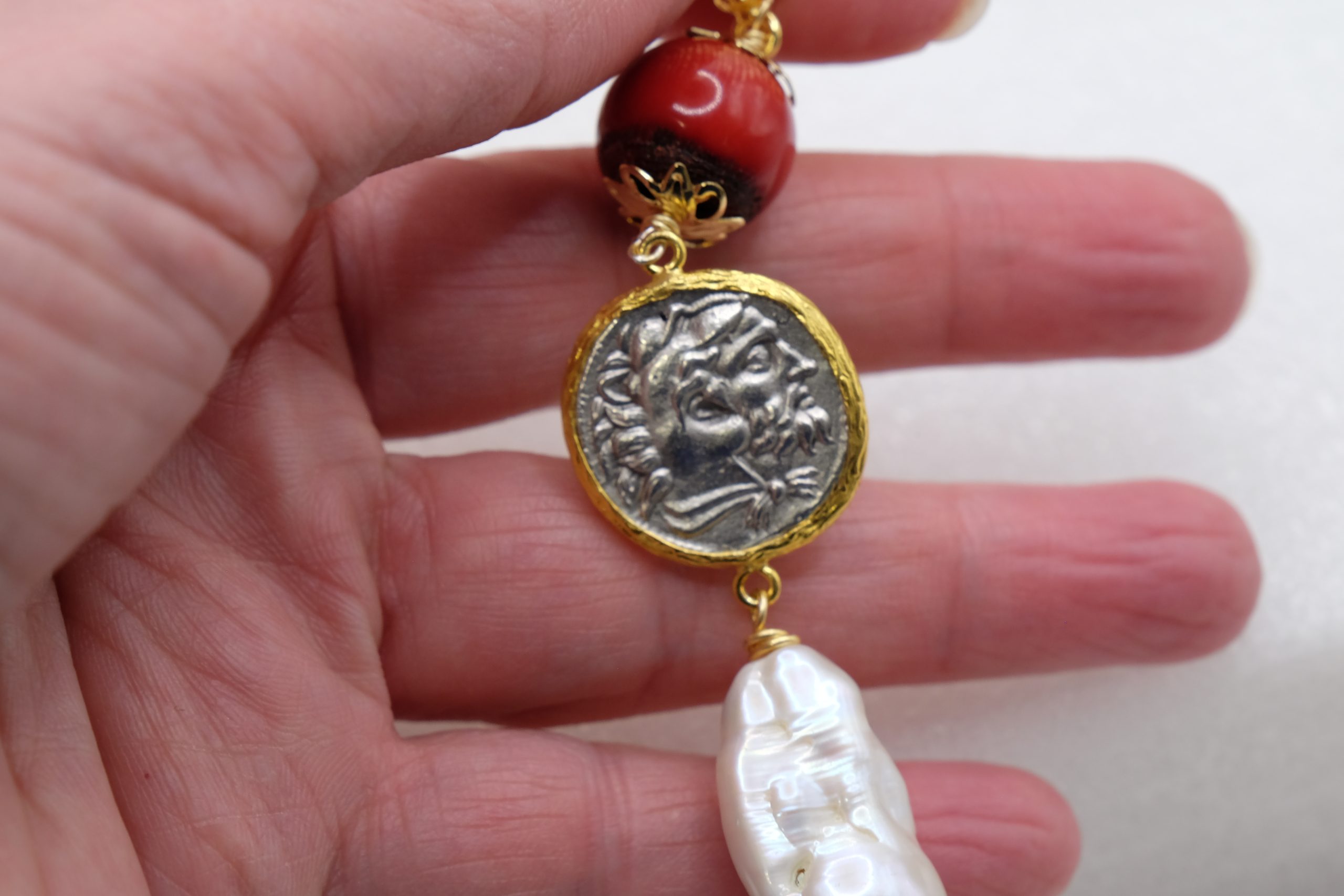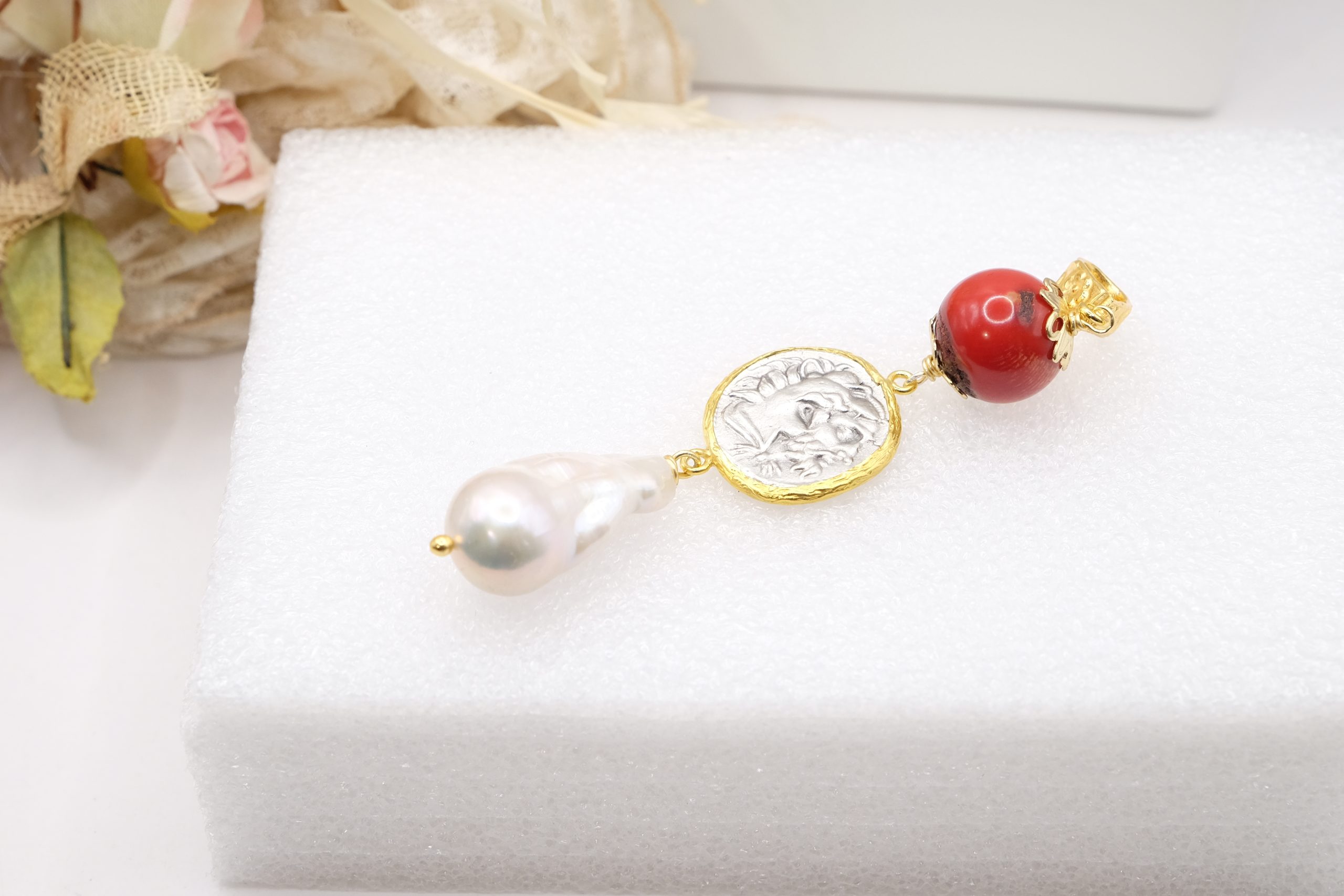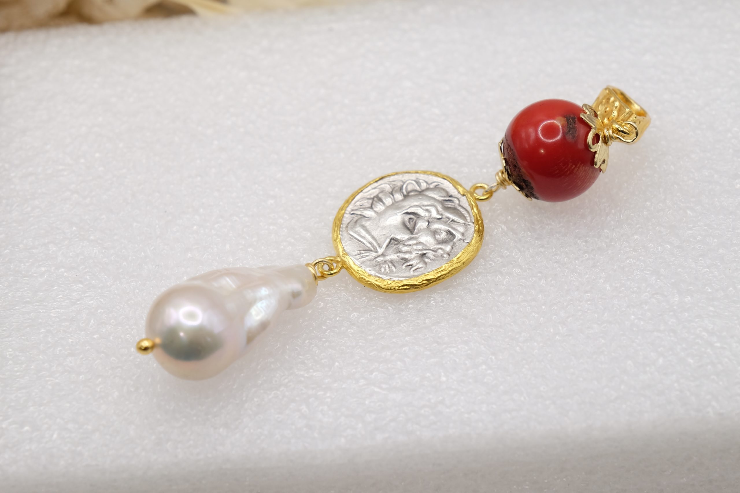 Pendente ciondolo con moneta bifacciale anticata top quality, sfera in corallo bamboo grezzo e perla finale a goccia barocca naturale