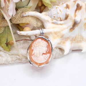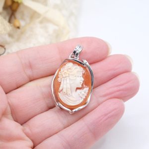 Pendente con cammeo inciso a mano dai maestri incisori di Torre del Greco con volto di dama, da 3,5 x 2,5 cm, su montatura in argento 925 rodiato, con passante che vi permetterà di indossarlo su catenine.