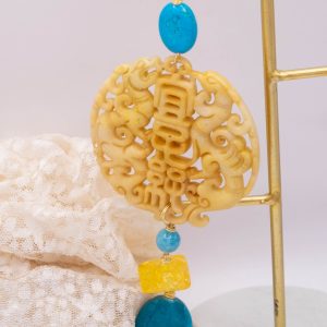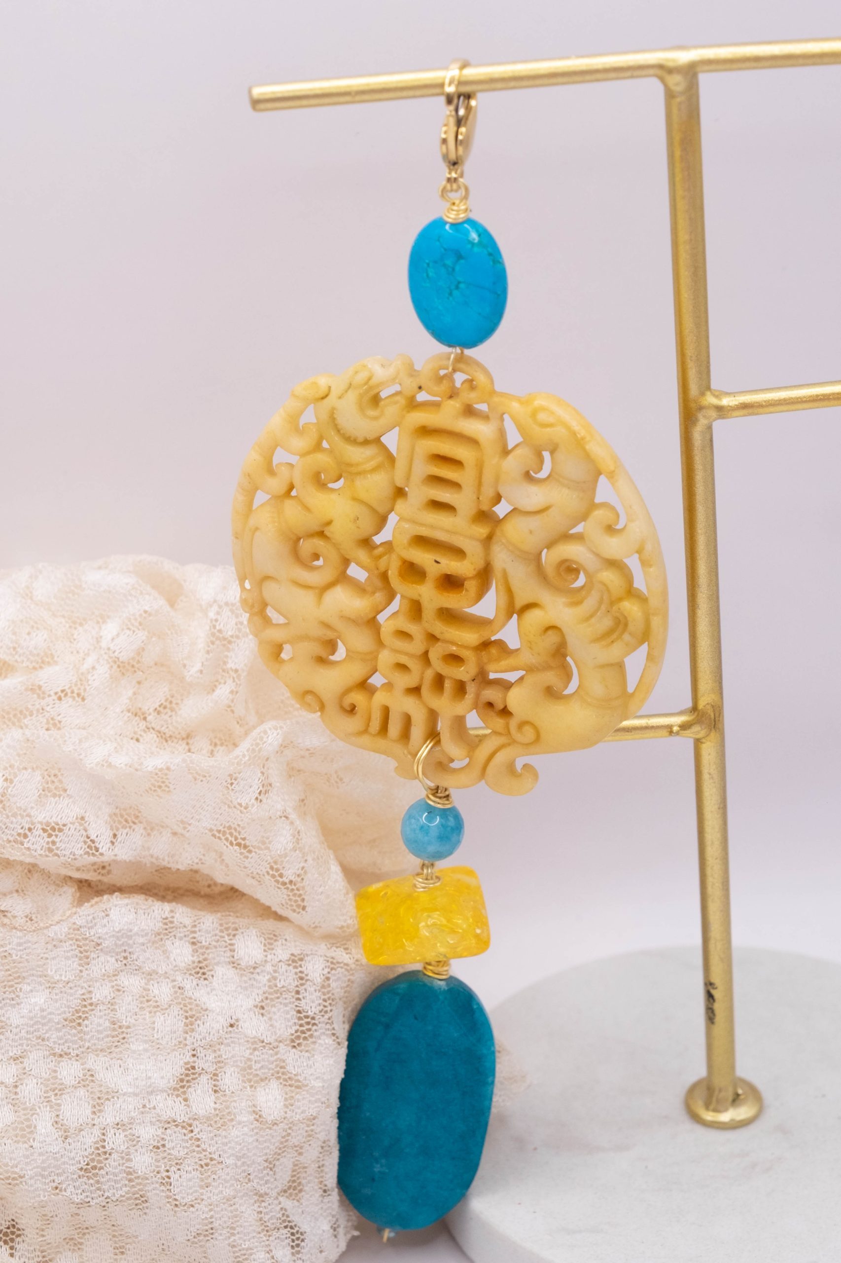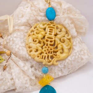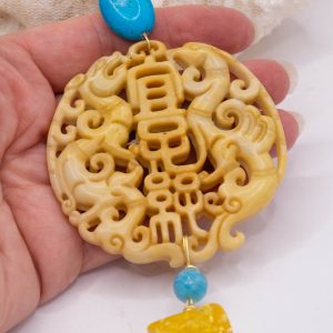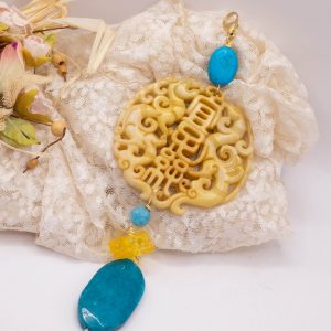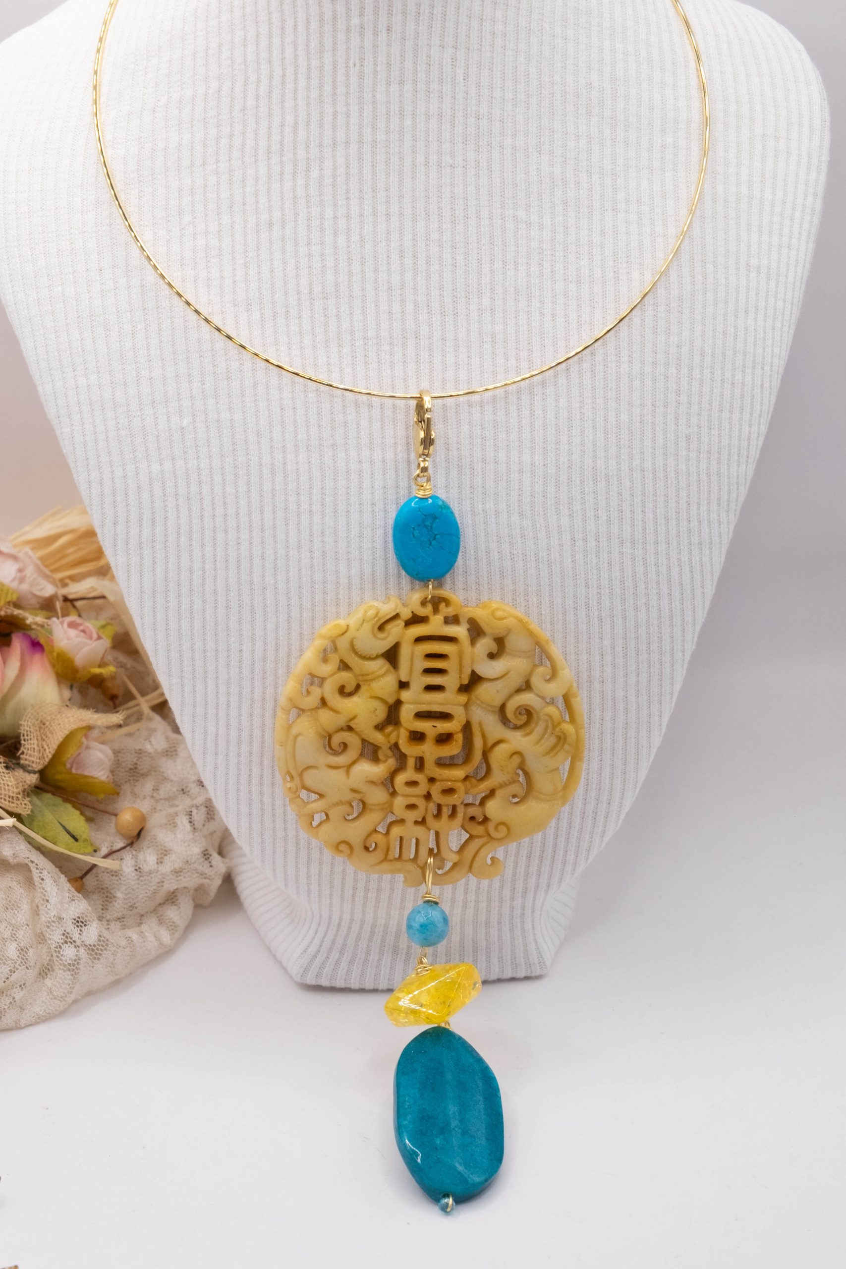 Un gioiello raffinato e senza tempo: questo splendido ciondolo unisce la bellezza della giada intarsiata a mano con la luminosità delle pietre naturali turchese, angelite, giada azzurra e ambra vintage sintetica. Perfetto per chi ama dettagli preziosi e significati profondi.