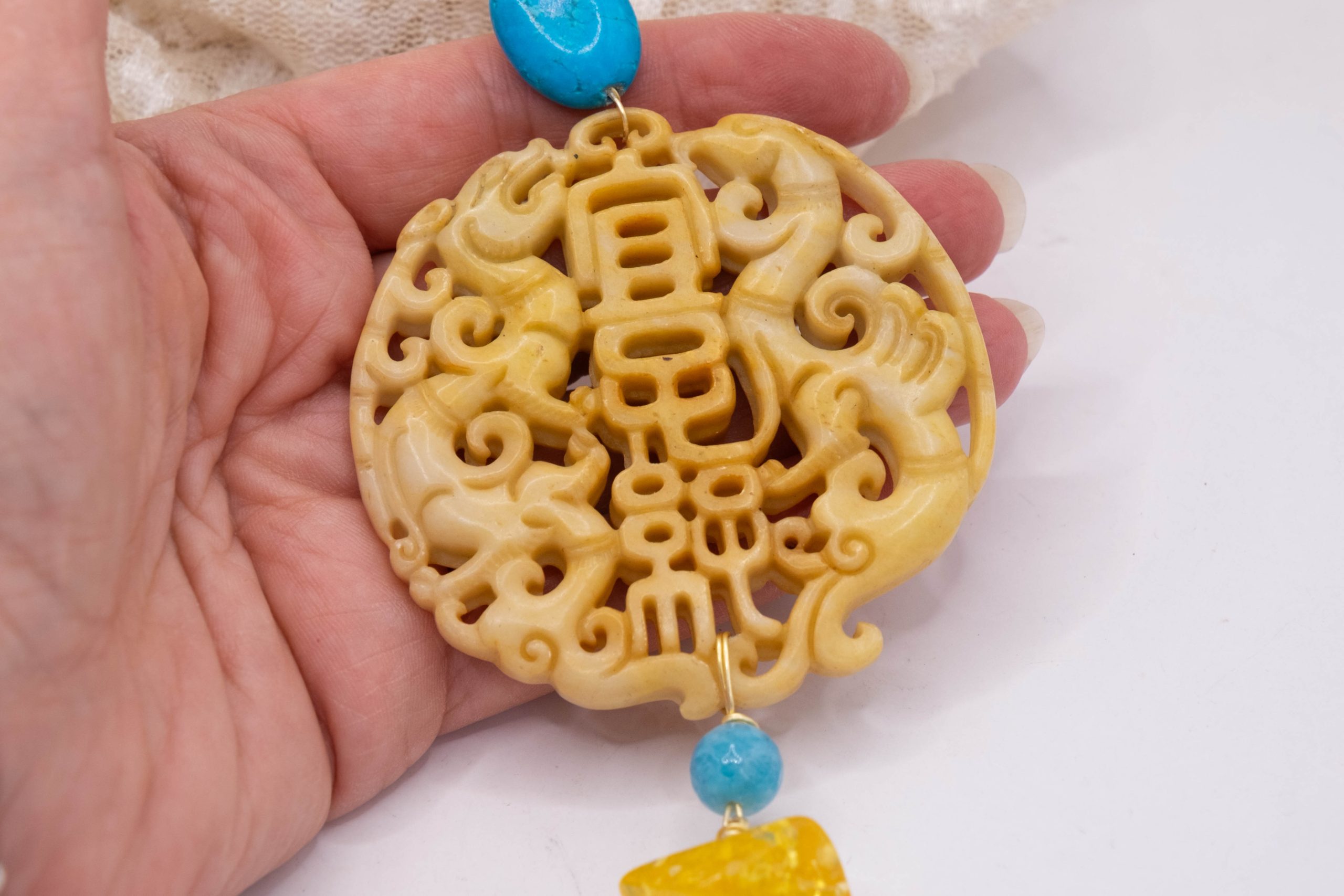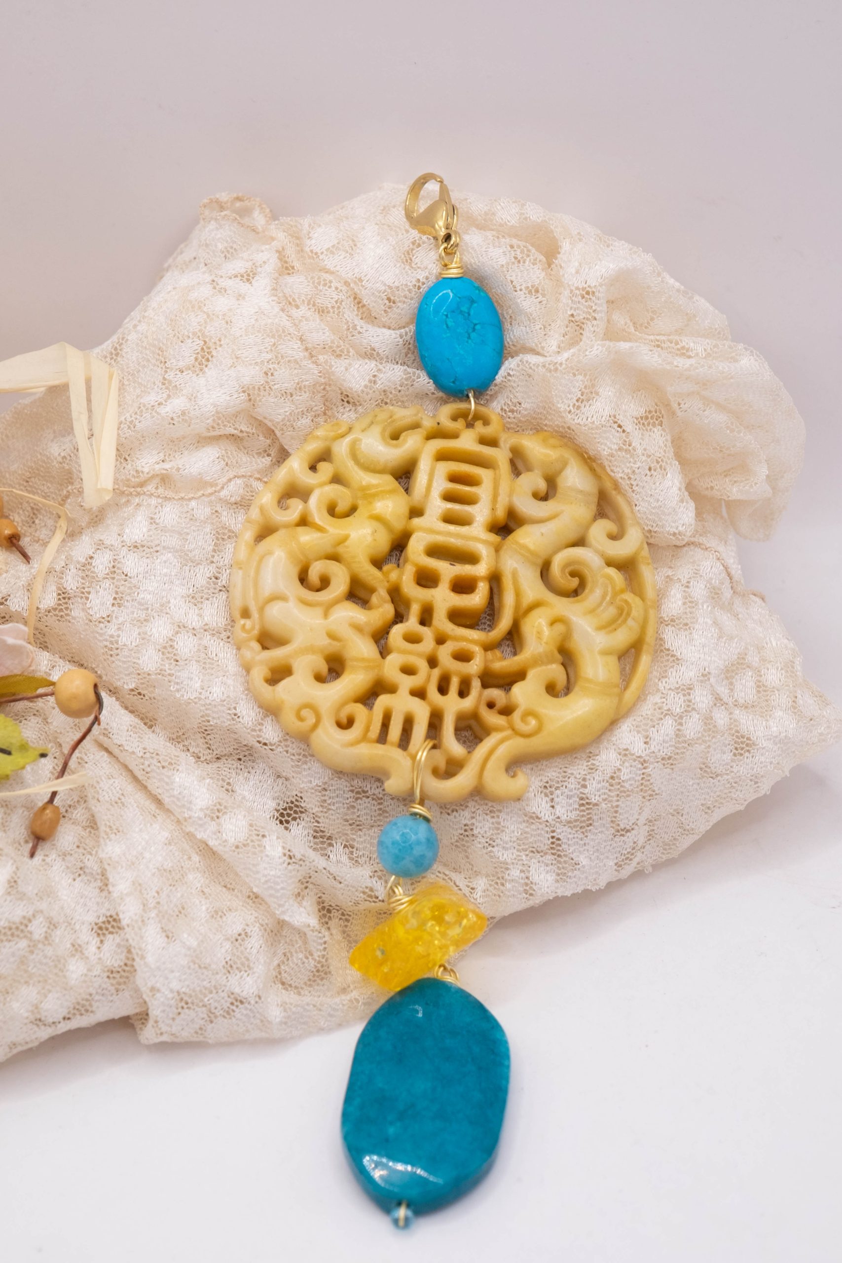 Ciondolo con giada intarsiata a mano, e pietre dure naturali di turchese, angelite, giada azzurra e ambra sintetica vintage