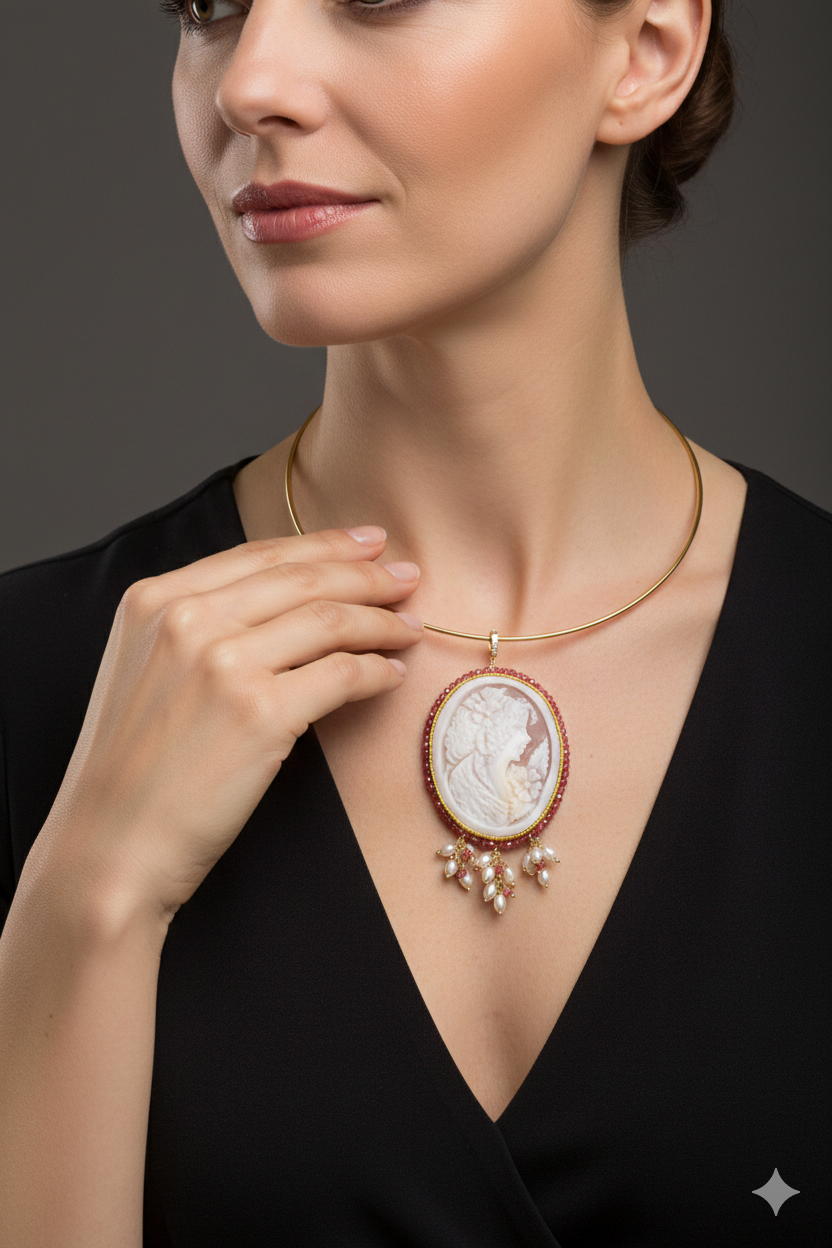 Il grande cammeo genuino, inciso a mano dai maestri incisori di Torre del Greco, raffigura il volto delicato di una dama ed รจ valorizzato da una raffinata lavorazione soutache con zirconi naturali rosa, perle e passamaneria ๐
