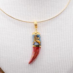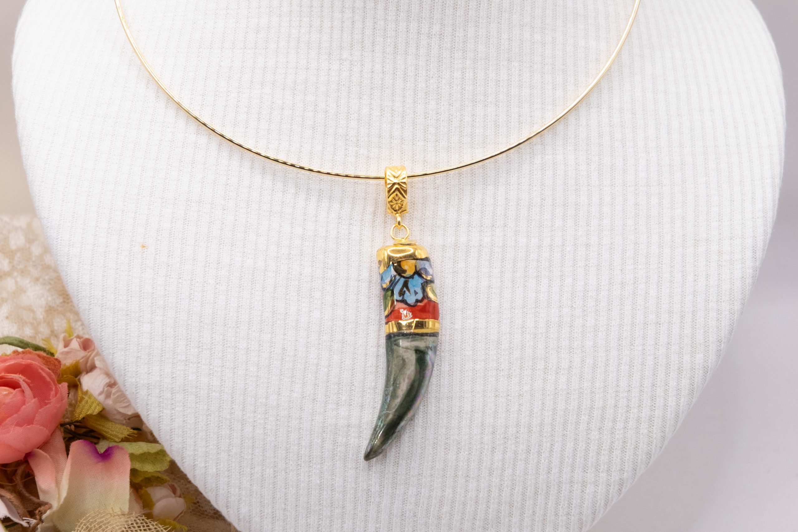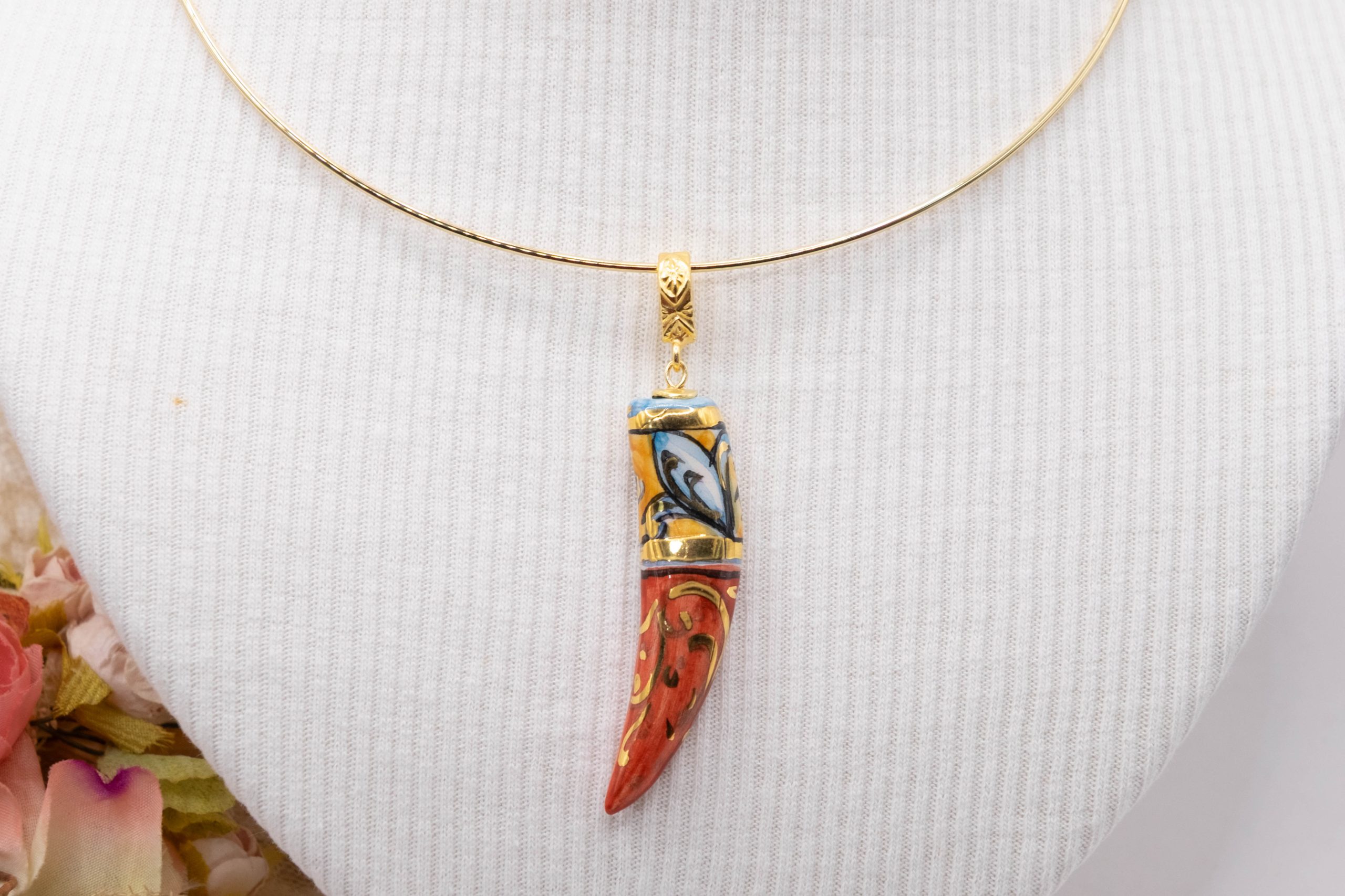 Un amuleto dal forte valore simbolico, realizzato interamente a mano in ceramica artistica di Caltagirone e impreziosito da dettagli in oro zecchino. Ogni pezzo è unico, frutto della tradizione artigianale siciliana e della maestria decorativa che rende questo ciondolo non solo un portafortuna, ma anche un raffinato accessorio da indossare.