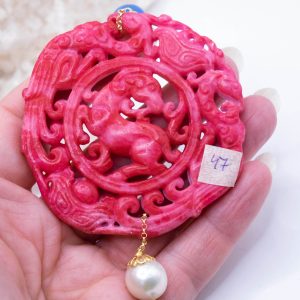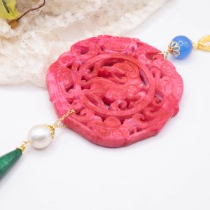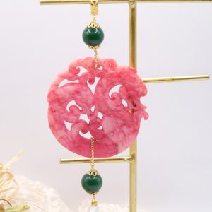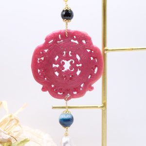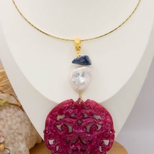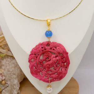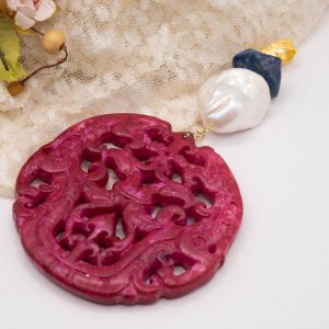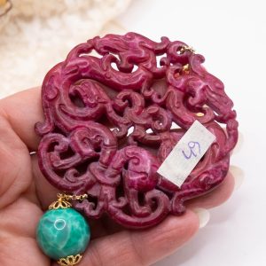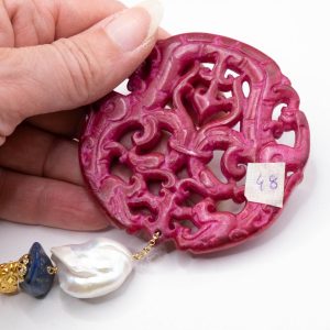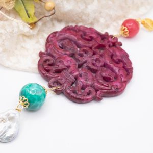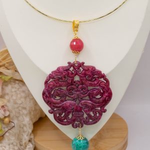 Ciondolo con vera giada intarsiata a mano, e pietre dure naturali nei toni del fuxia e borgogna in 5 varianti