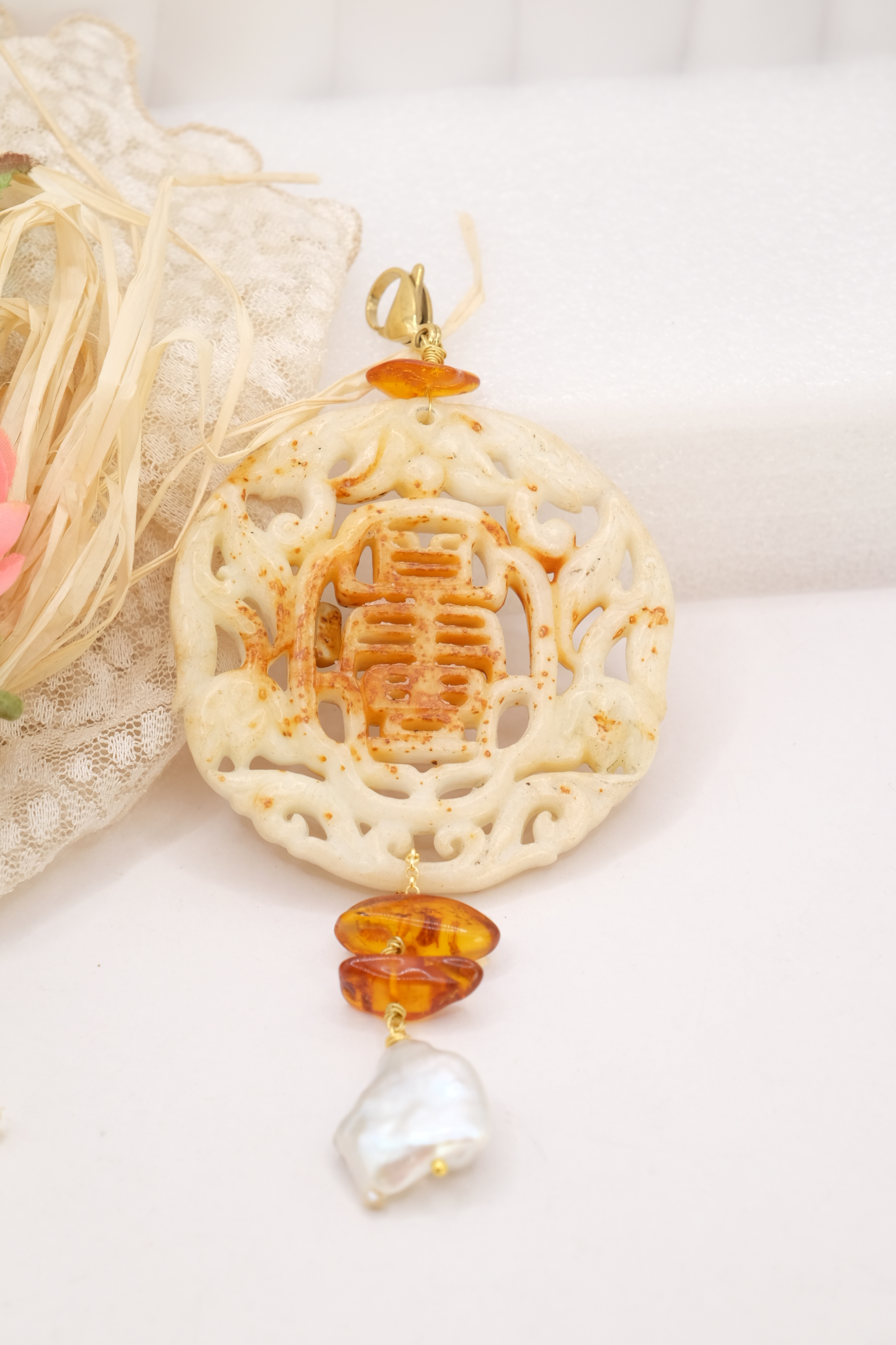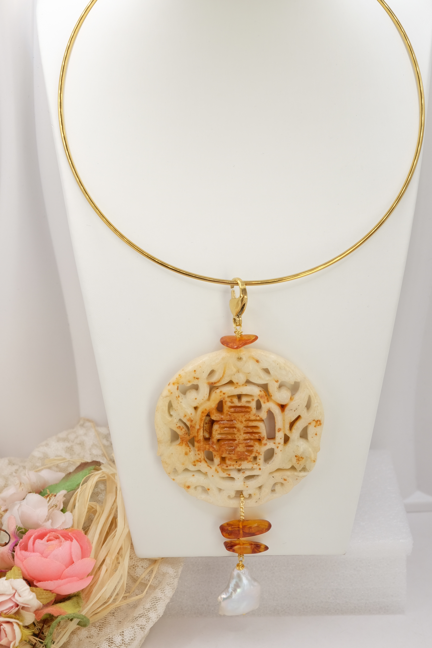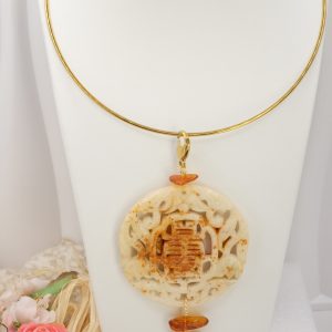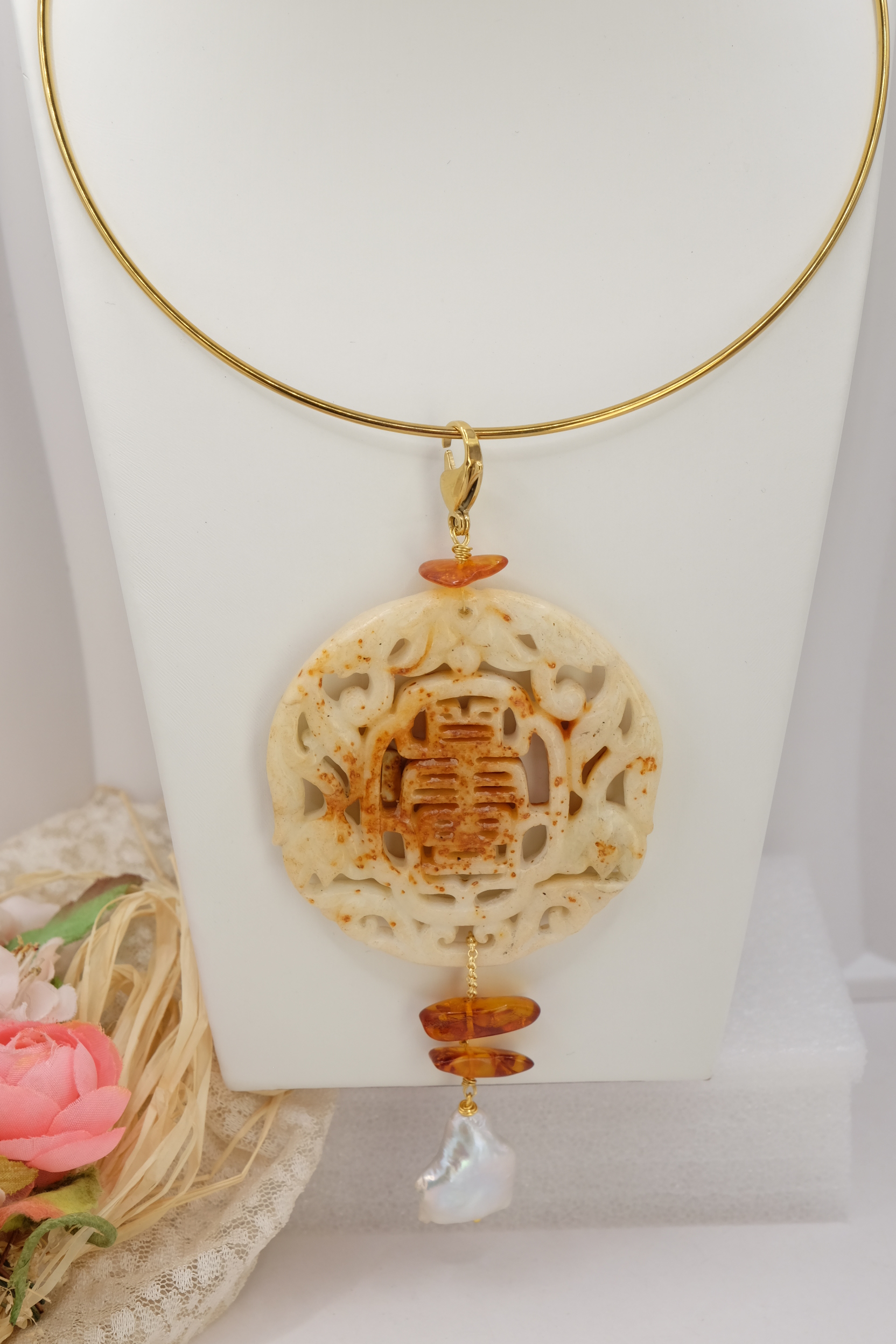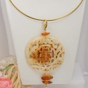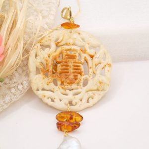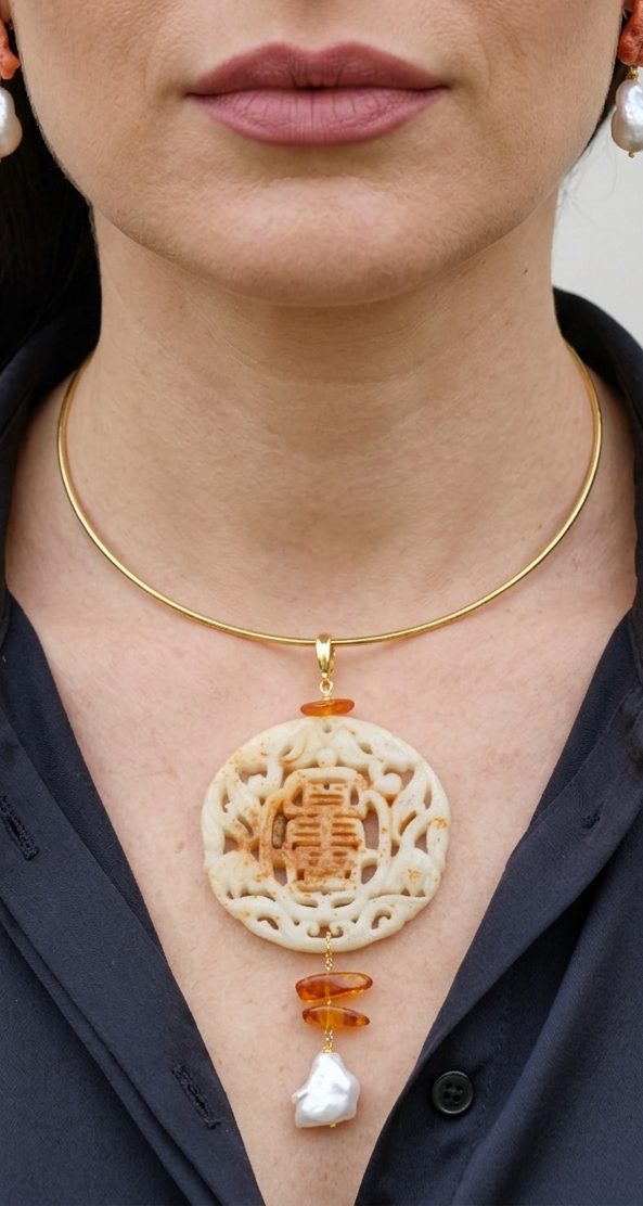 Il pendente unisce una giada color crema, scolpita a mano a inserti di ambra del Baltico e a una perla naturale, creando un equilibrio armonioso tra luce, forme e materia.