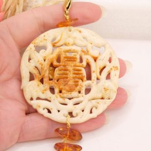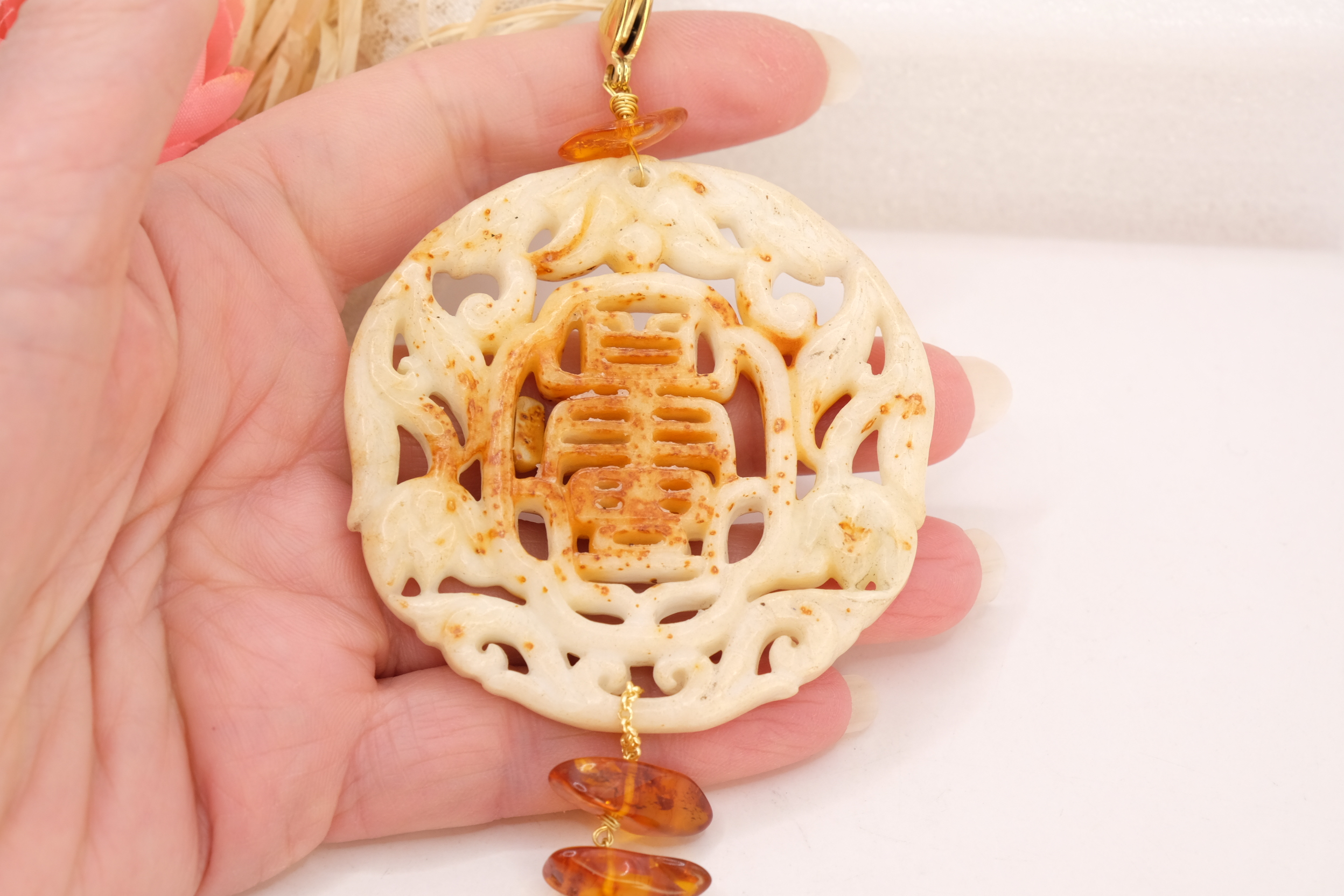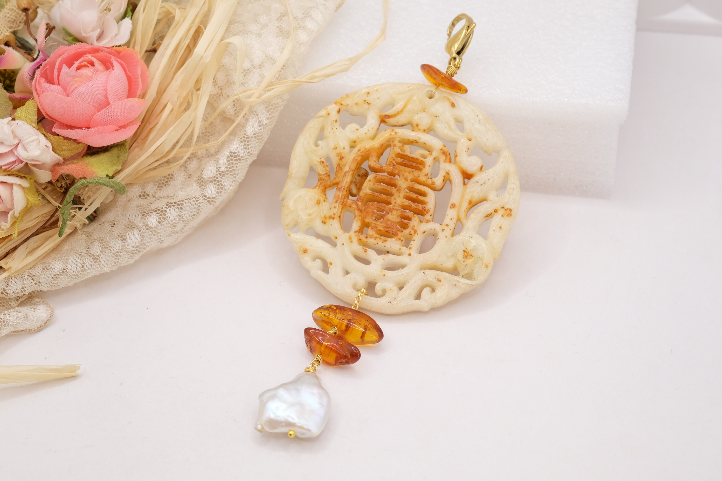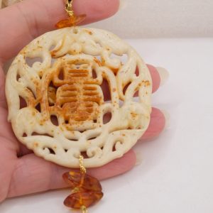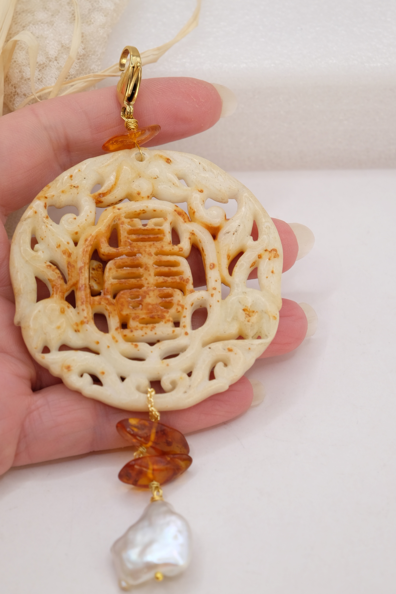 Il pendente unisce una giada color crema, scolpita a mano a inserti di ambra del Baltico e a una perla naturale, creando un equilibrio armonioso tra luce, forme e materia.