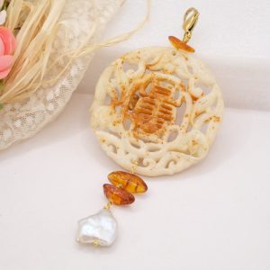 Ciondolo Pendente Mandala Crema Ambra Baltico Perla Naturale
