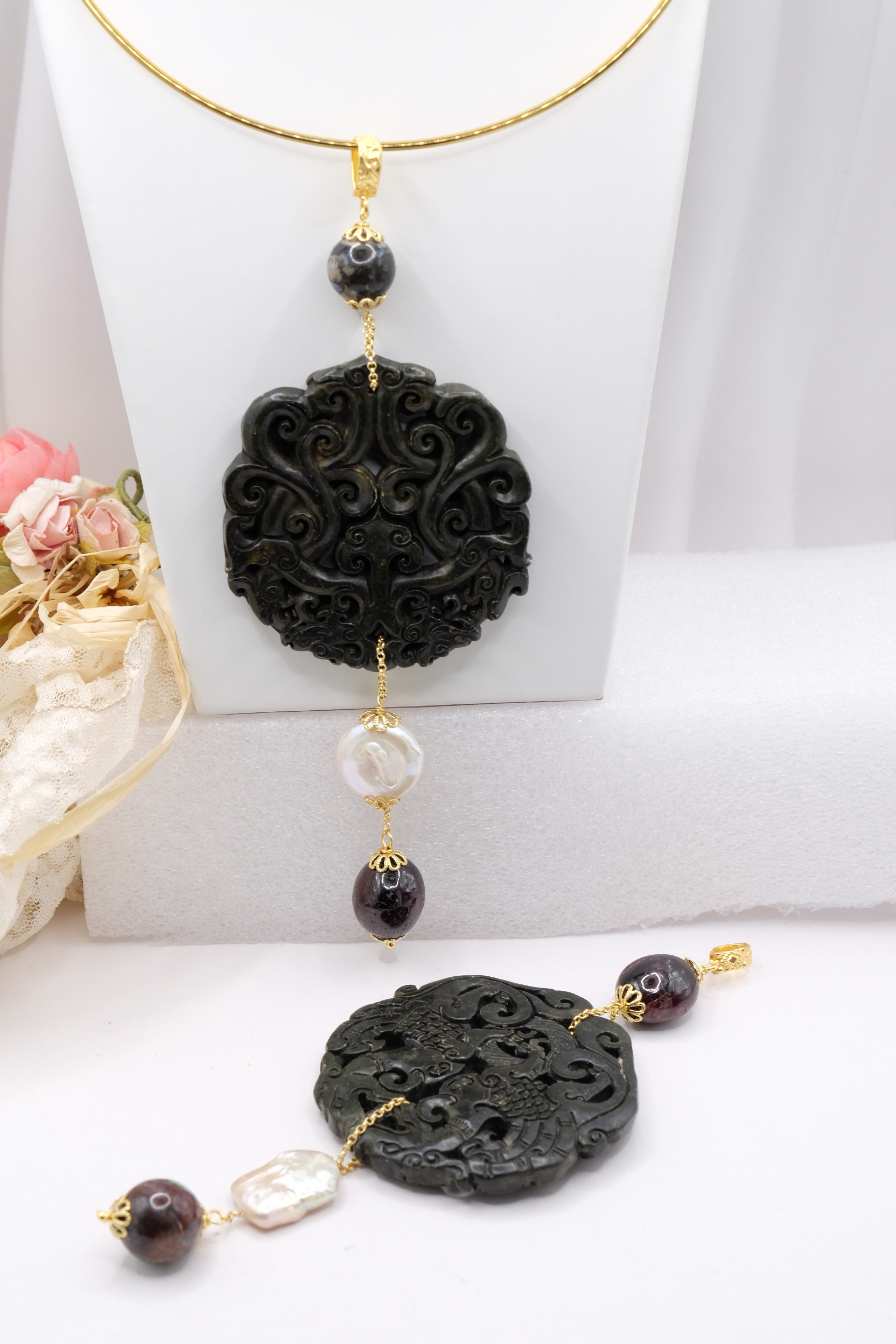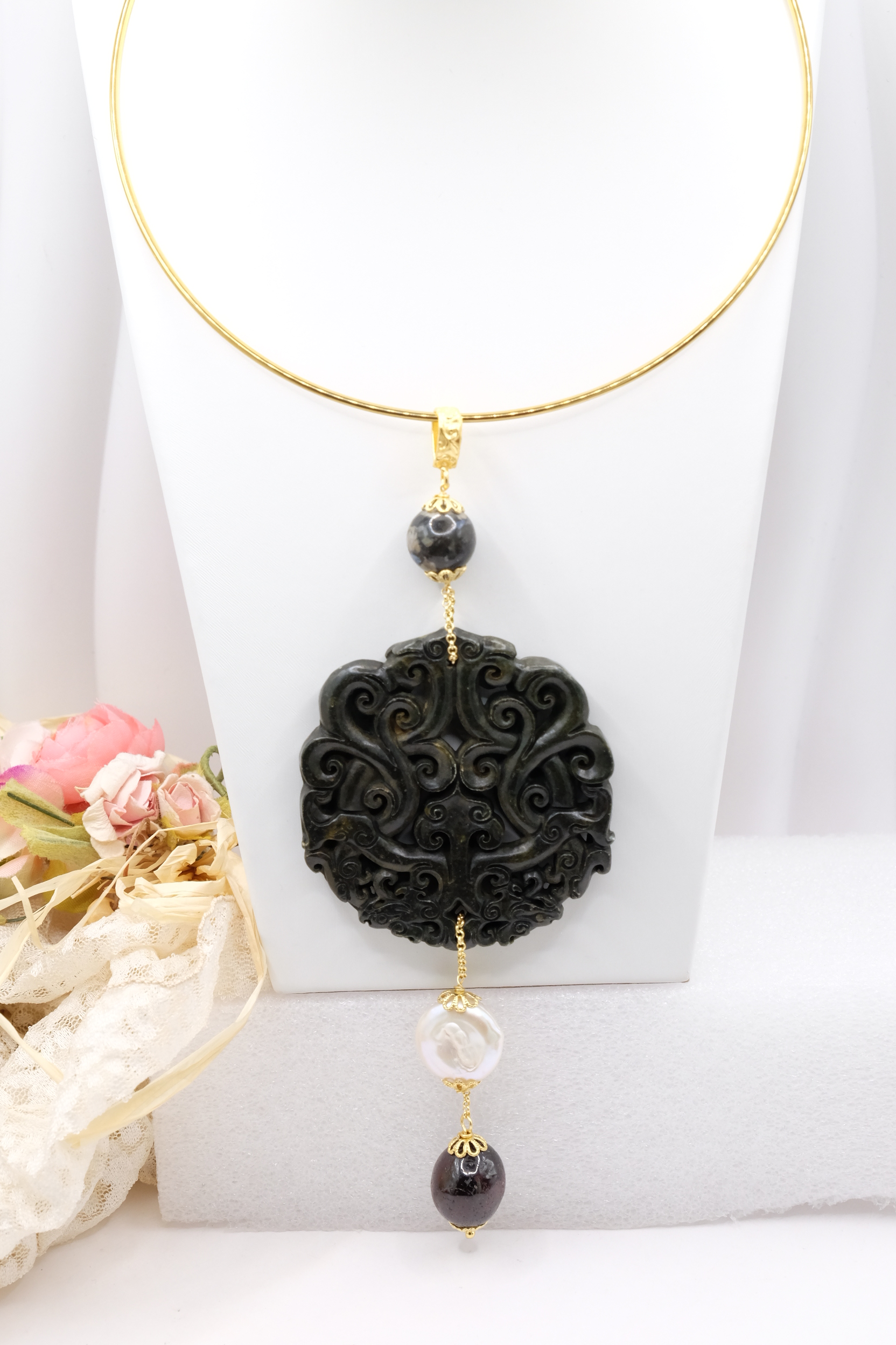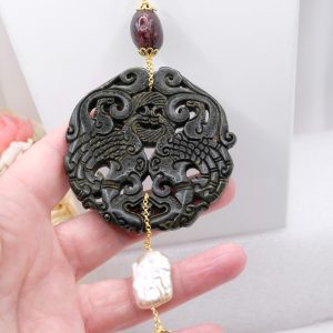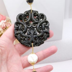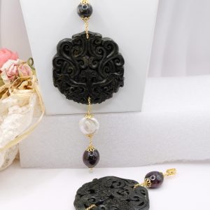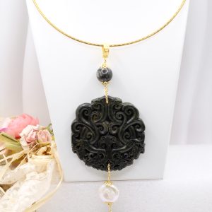 Ciondolo con Mandala Beneaugurante in vera giada intarsiata a mano, e pietre dure naturali nei toni del nero in 2 varianti