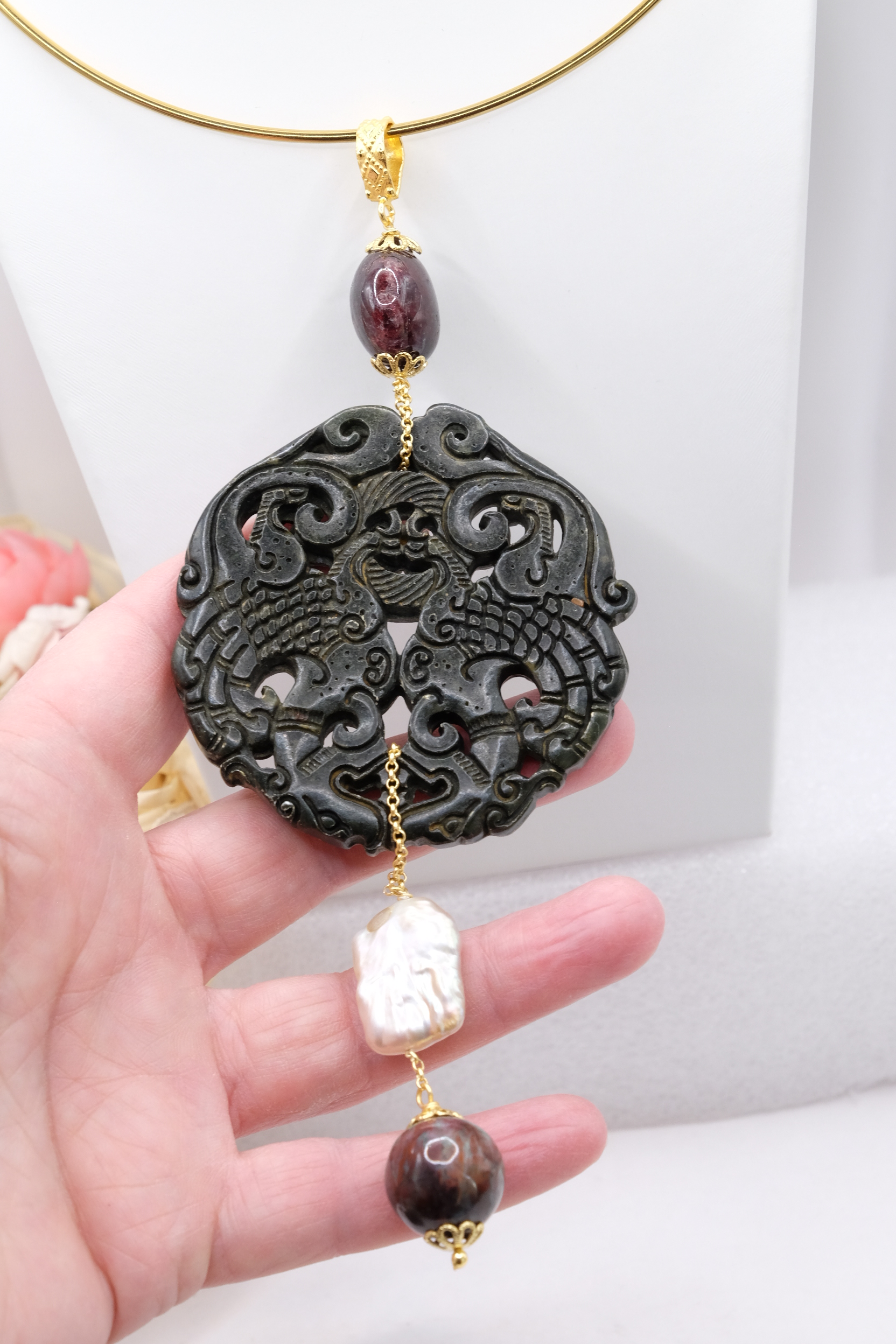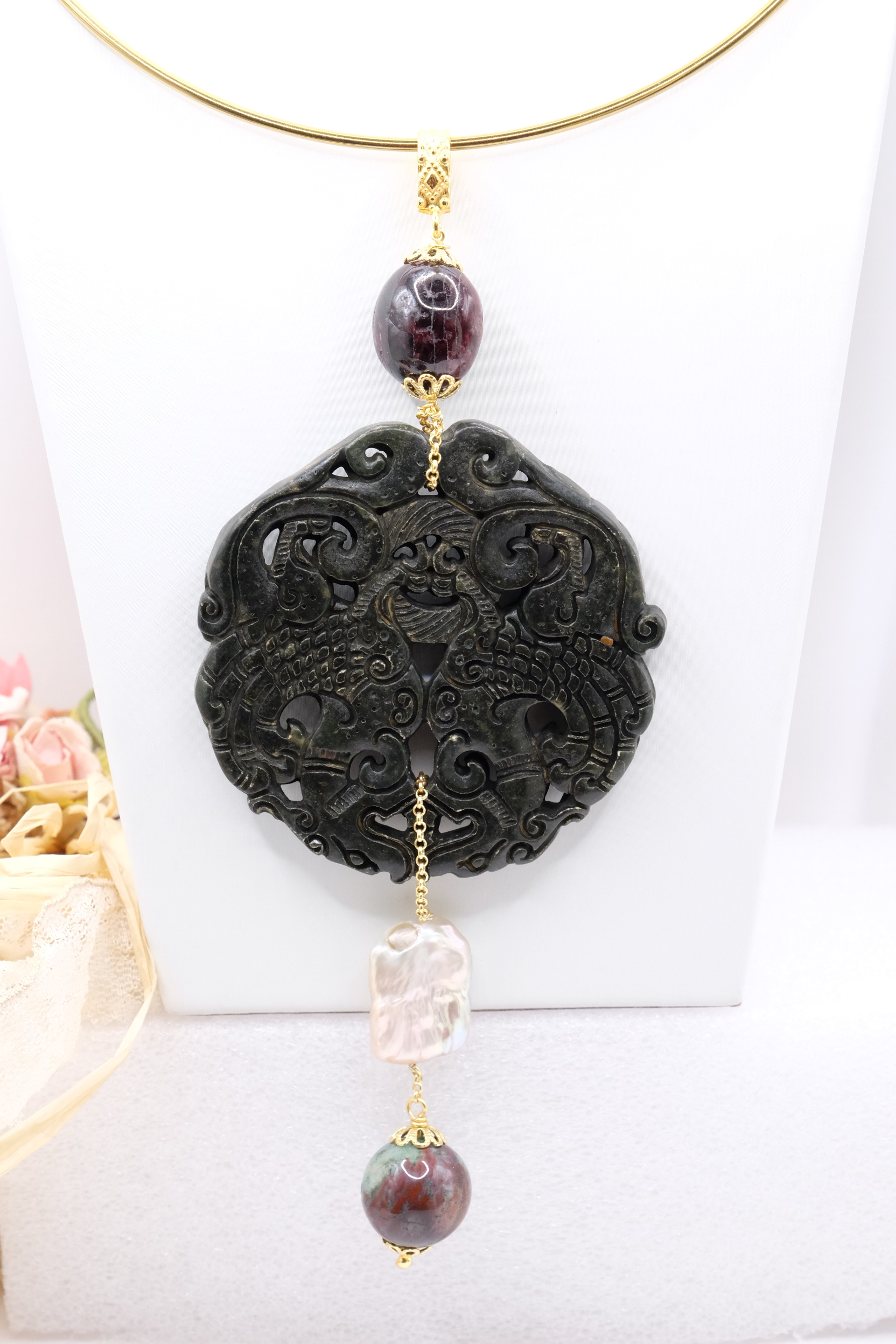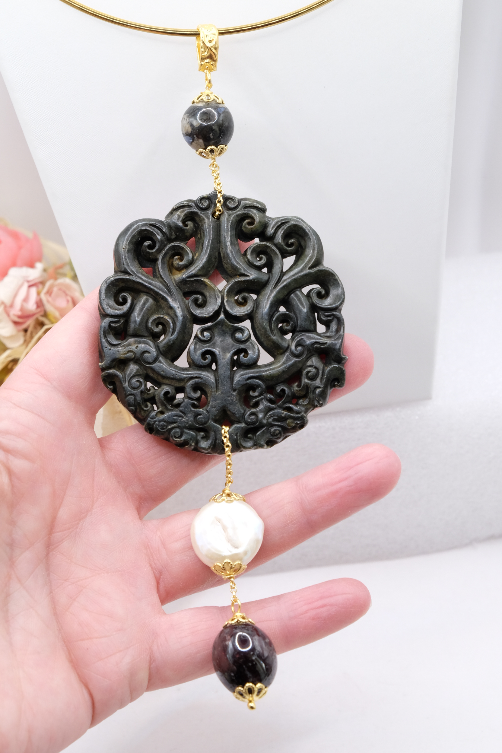 Ciondolo con Mandala Beneaugurante in vera giada intarsiata a mano, e pietre dure naturali nei toni del nero in 2 varianti