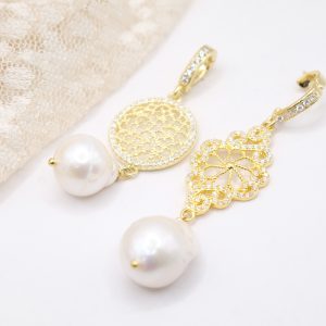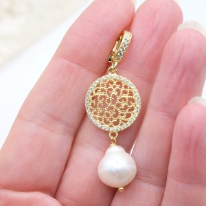 Pendente con luminosa perla barocca naturale e montatura filigranata in argento 925 placcato oro zirconata con gancio apribile che vi permetterà di applicarlo su collane o catenine.