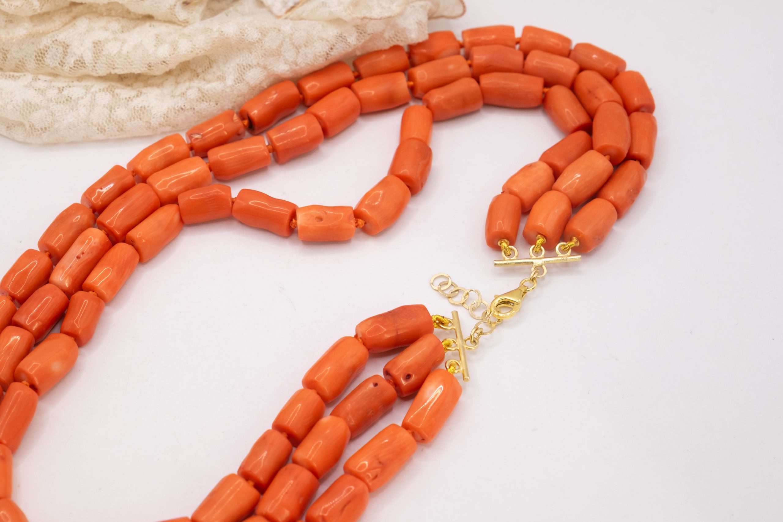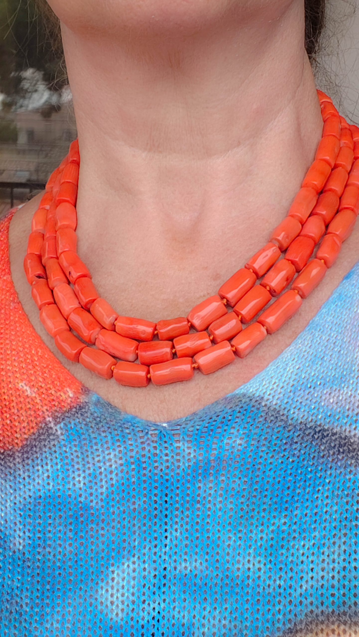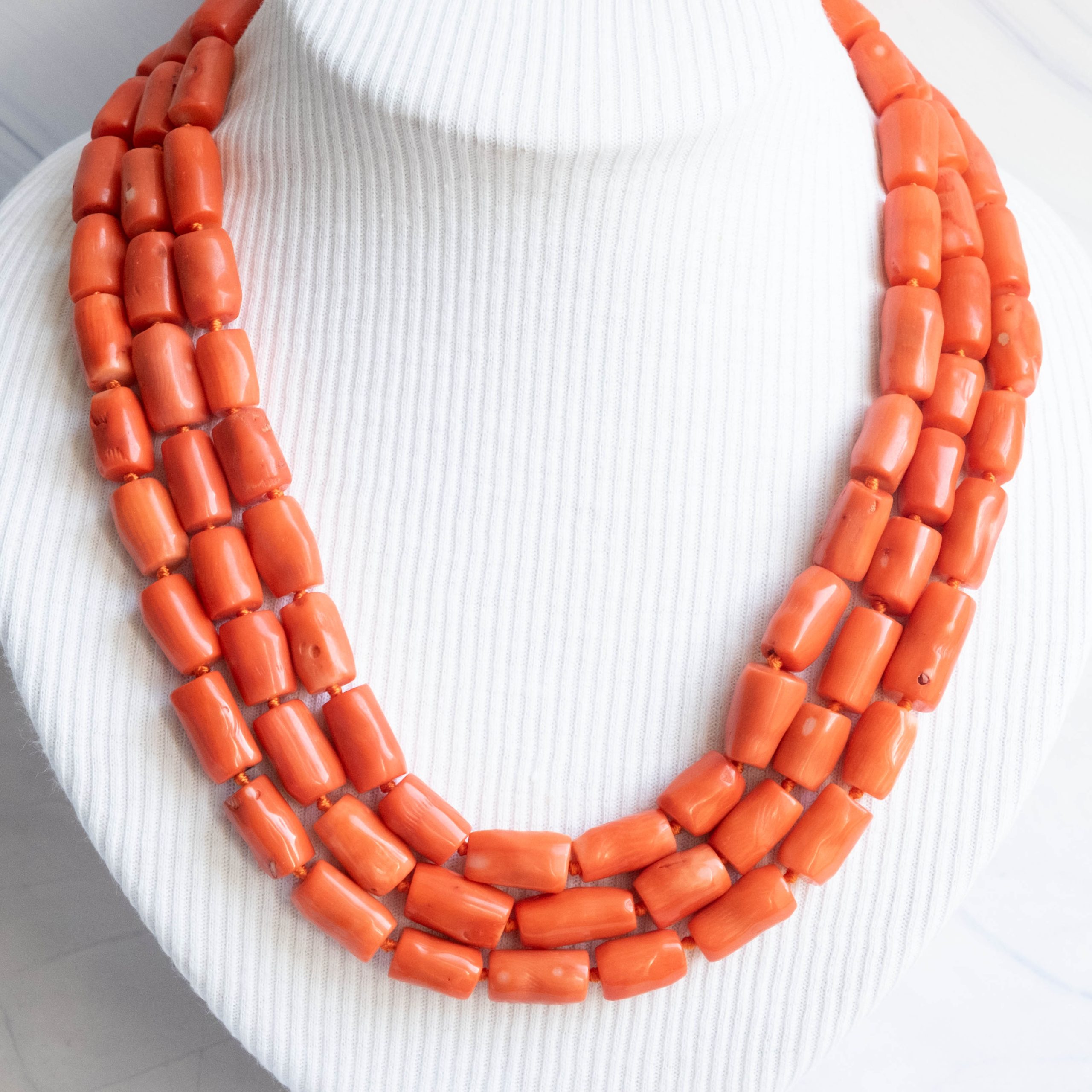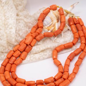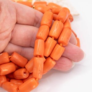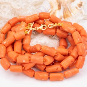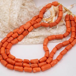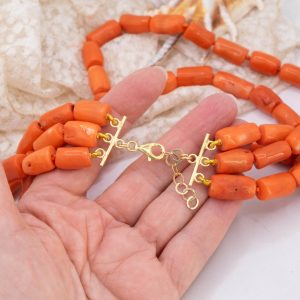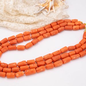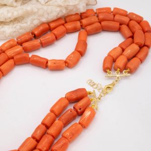 Strepitosa collana a 3 fili in corallo bamboo aranciato a barilotti da 15/17 x 10 mm