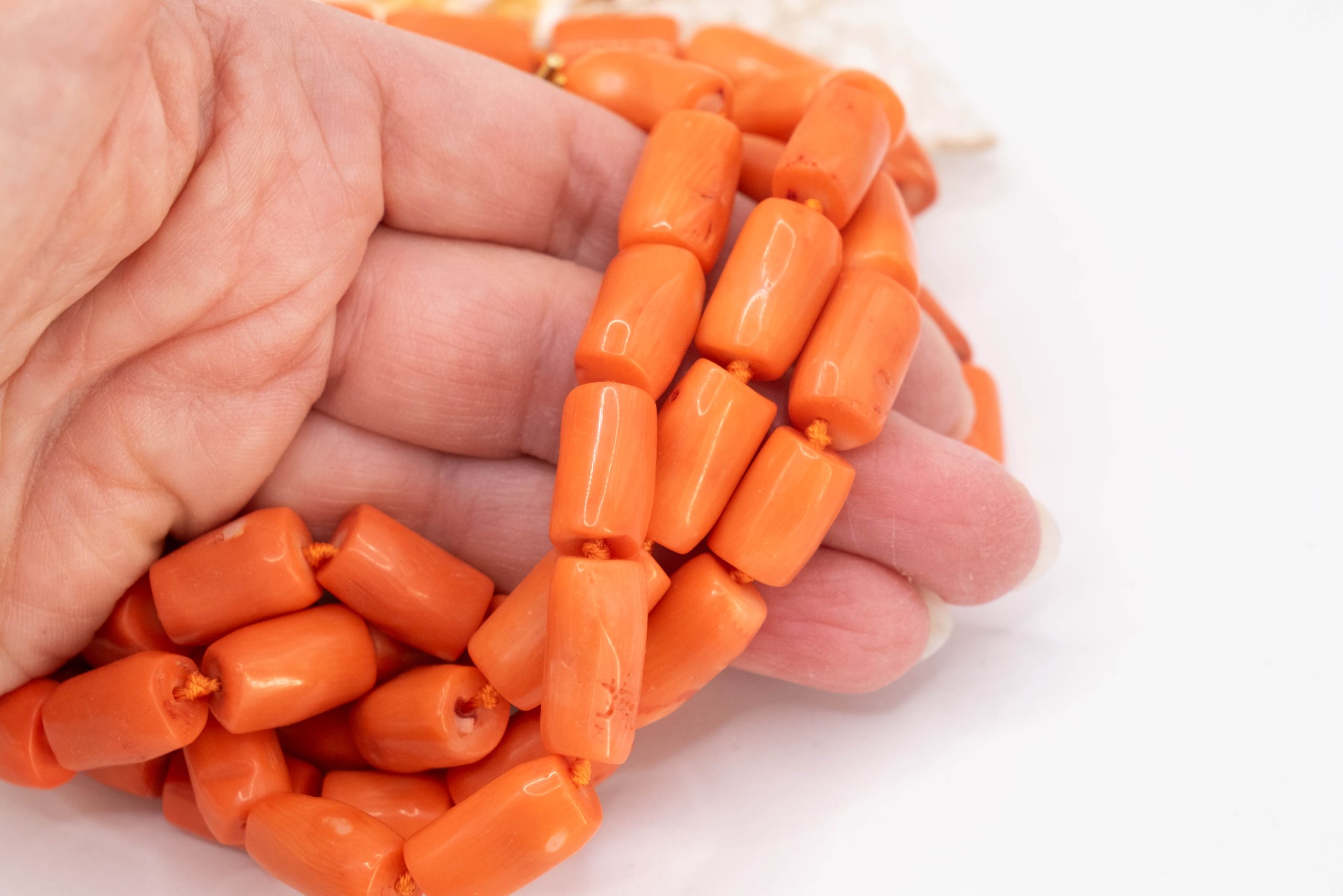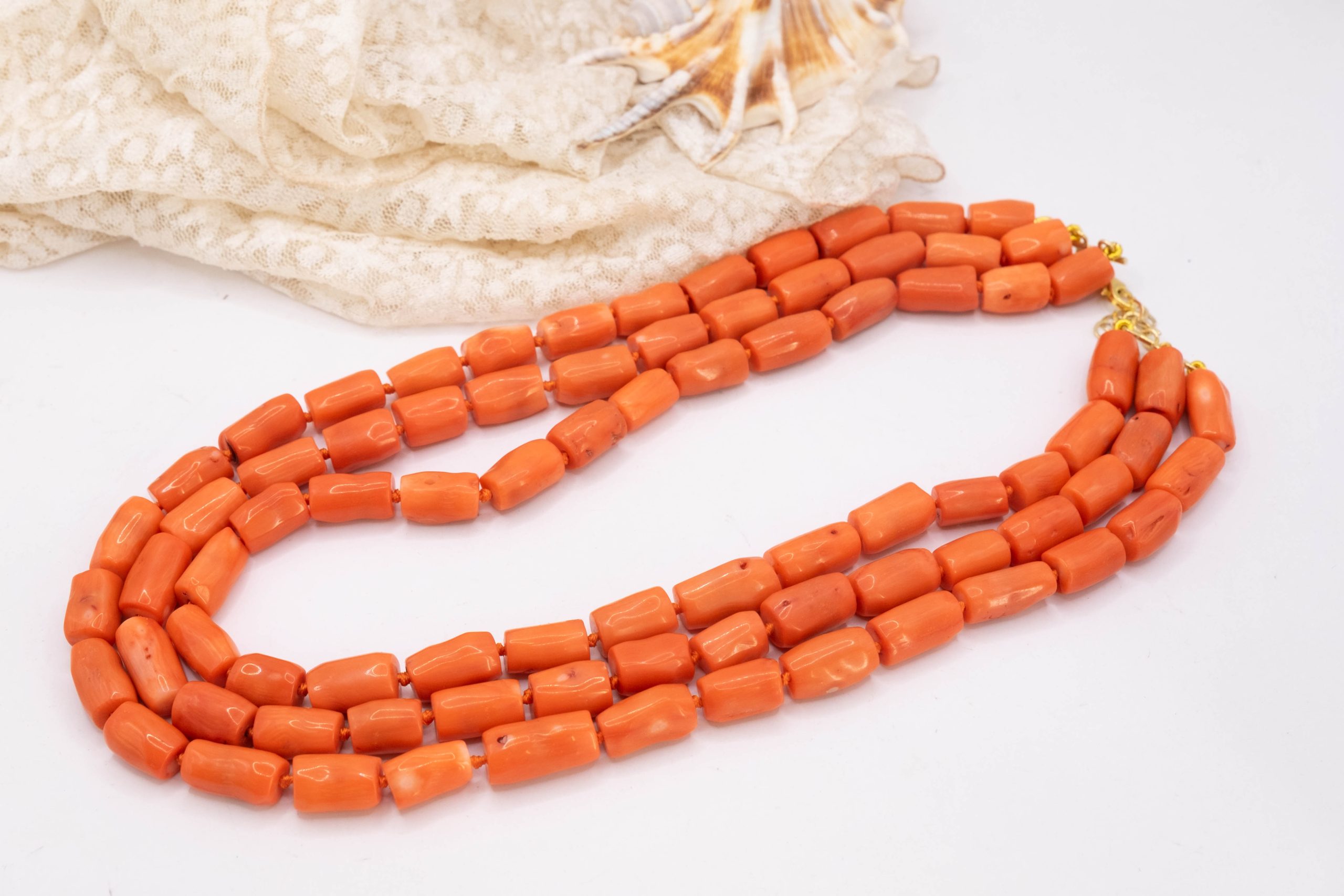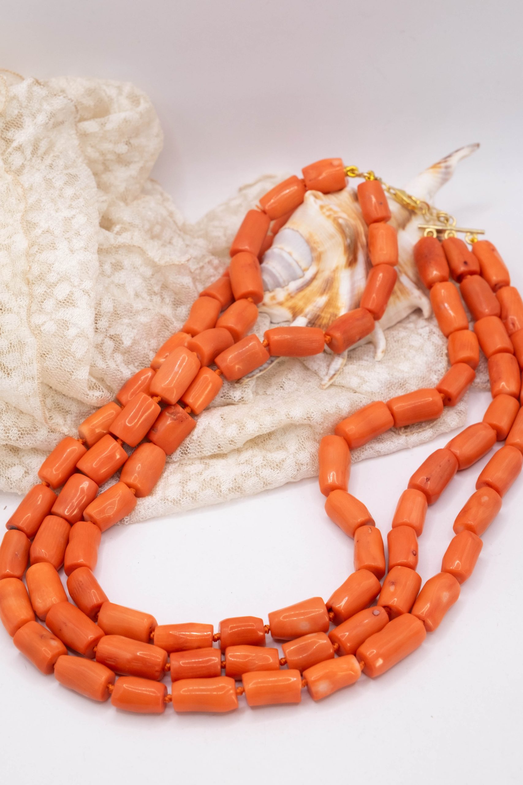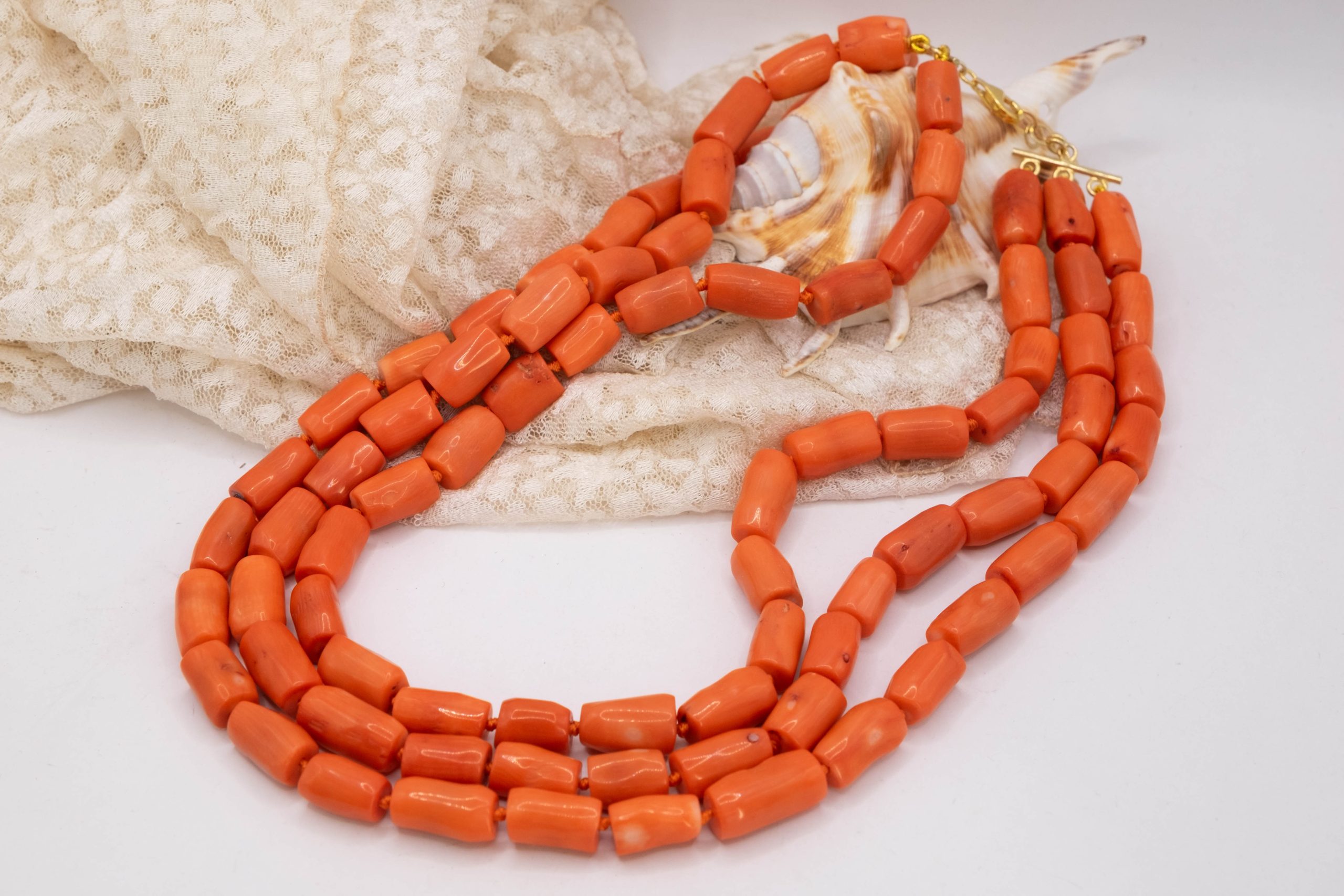 Strepitosa collana a 3 fili in corallo bamboo aranciato a barilotti da 15/17 x 10 mm