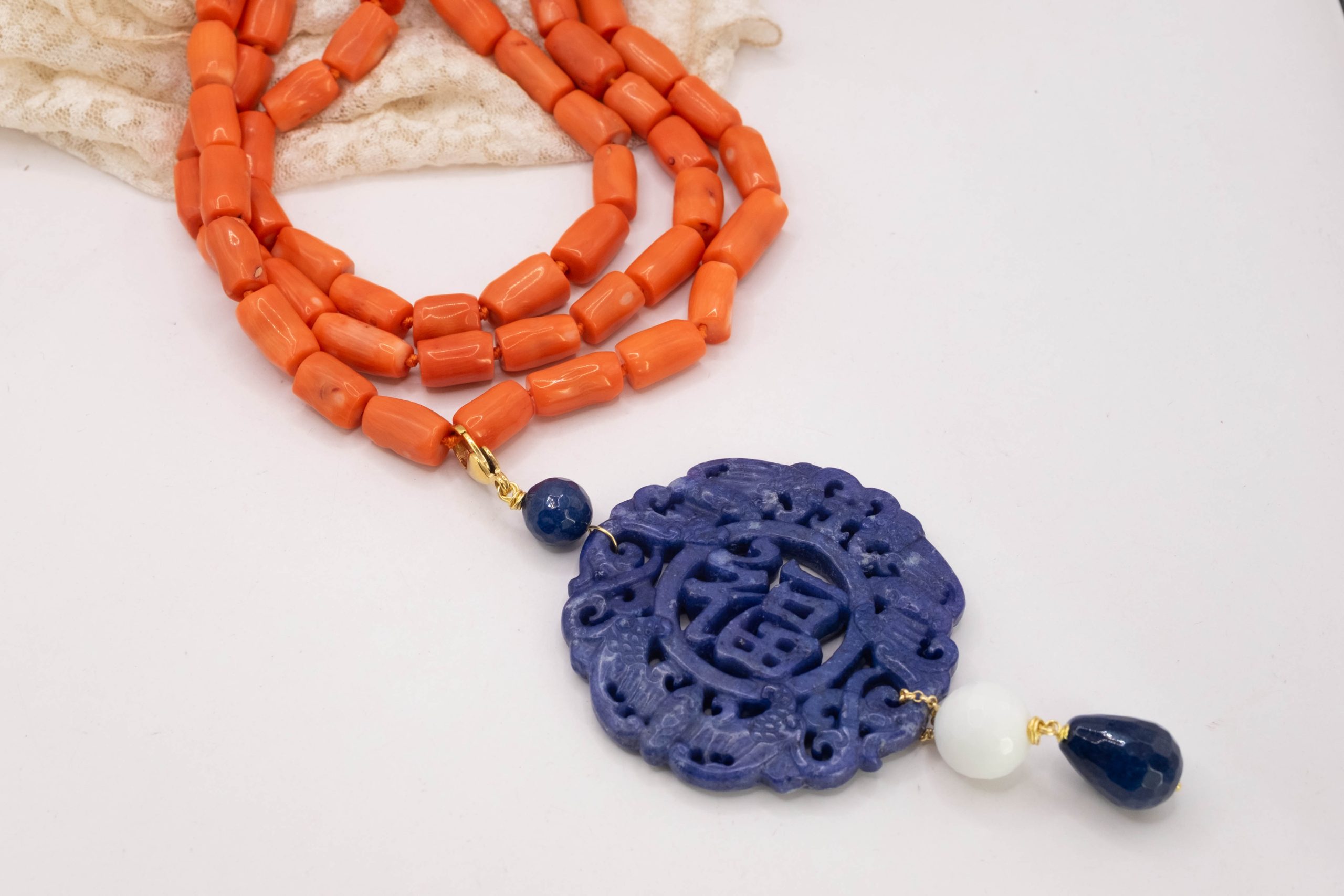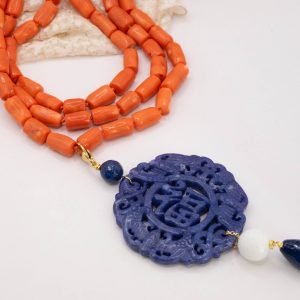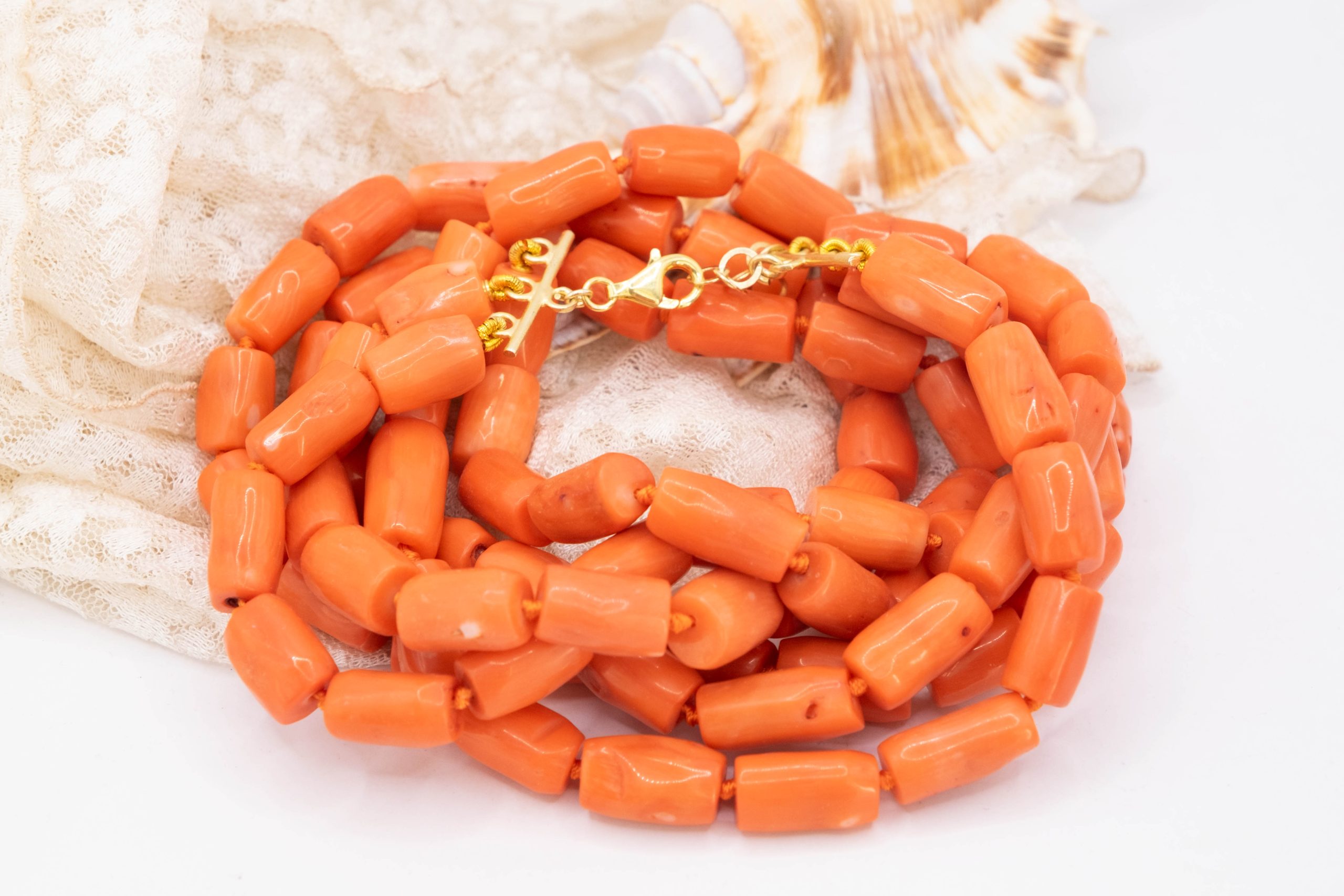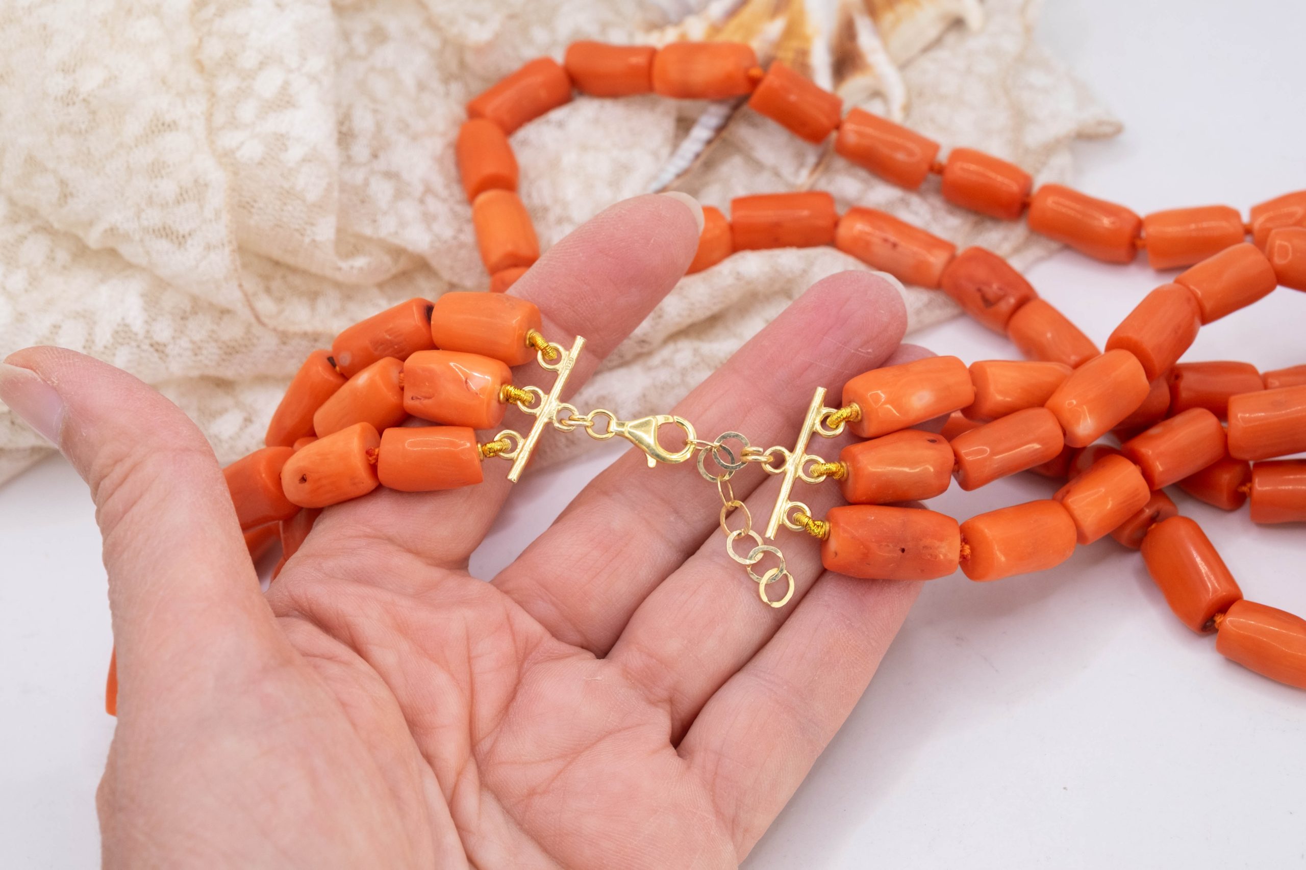 E’ lunga da 52 a 60 centimetri, regolabile mediante catenina, chiusura in argento 925 placcato oro. Ha l’annodatura professionale tra i barilotti di corallo.