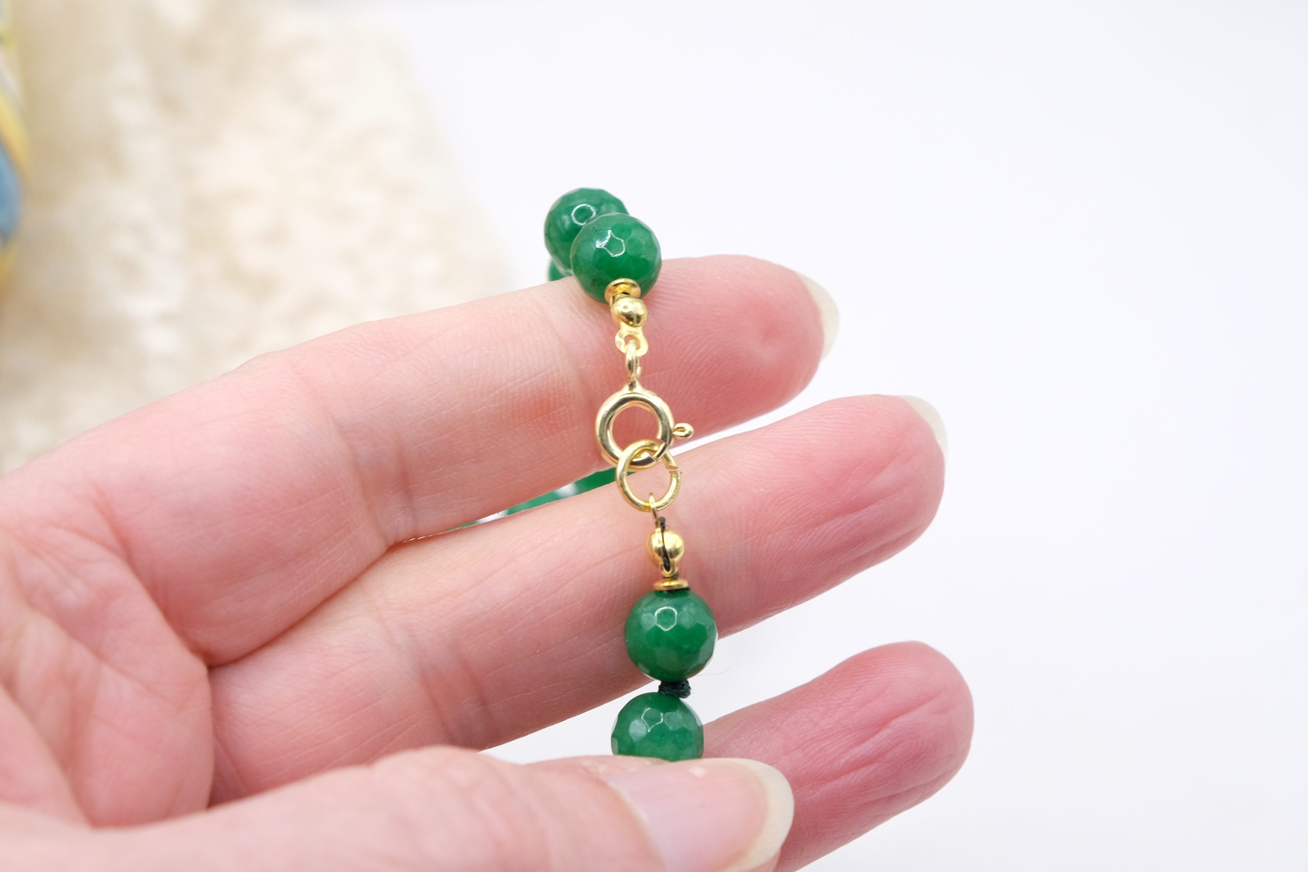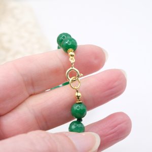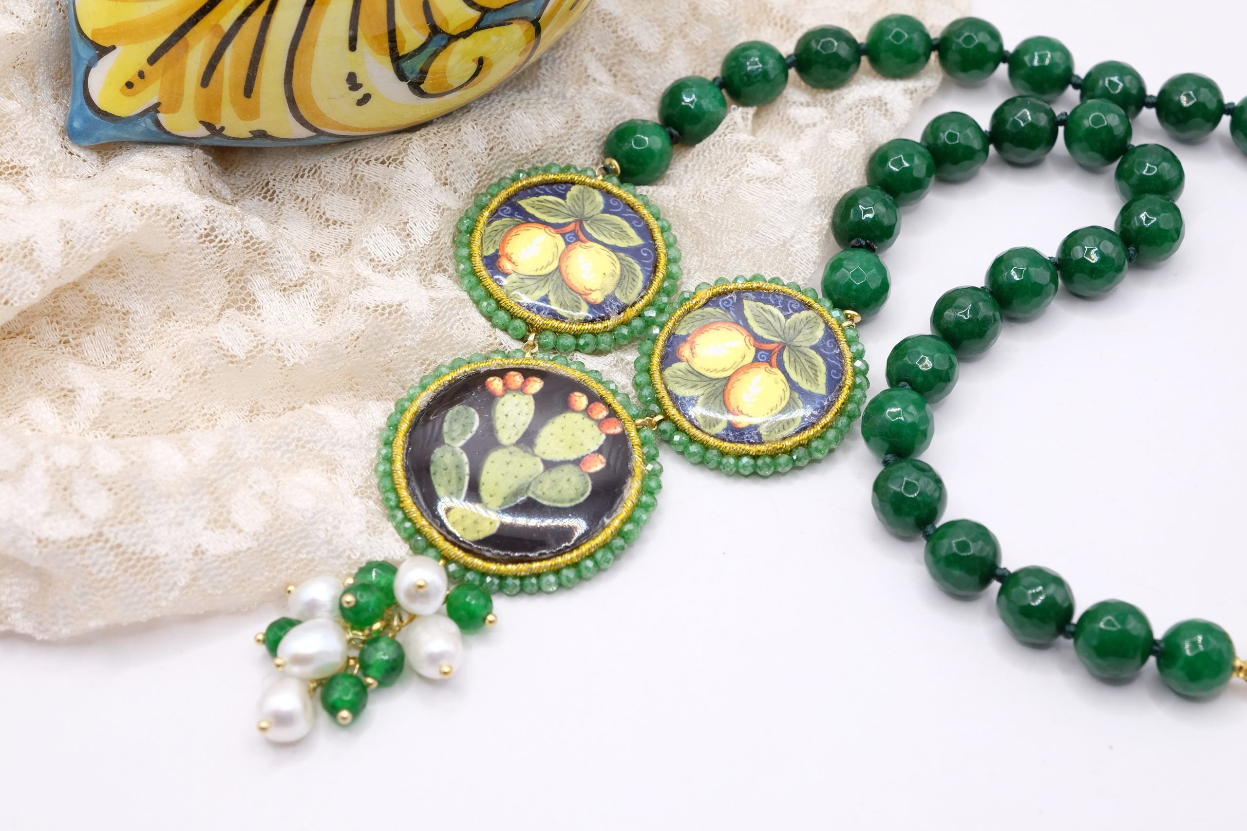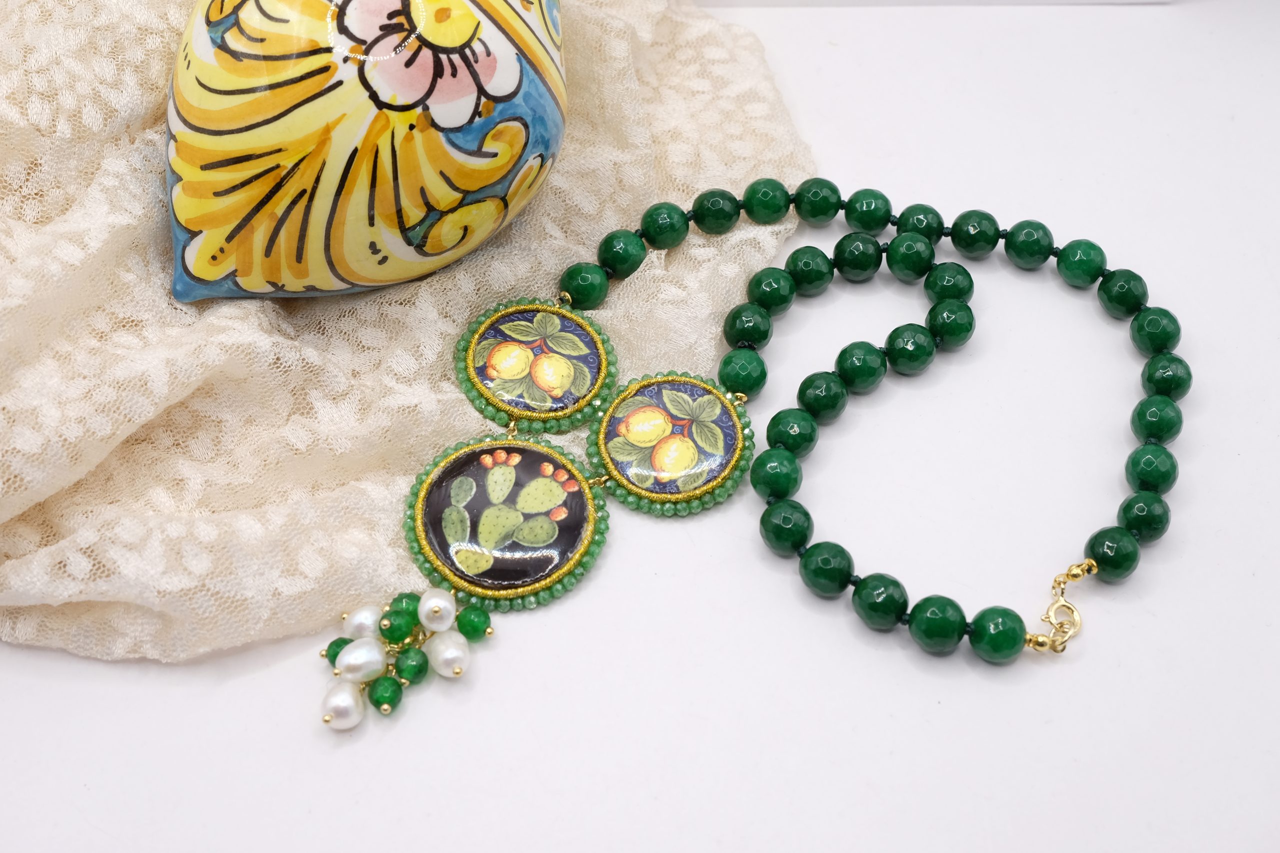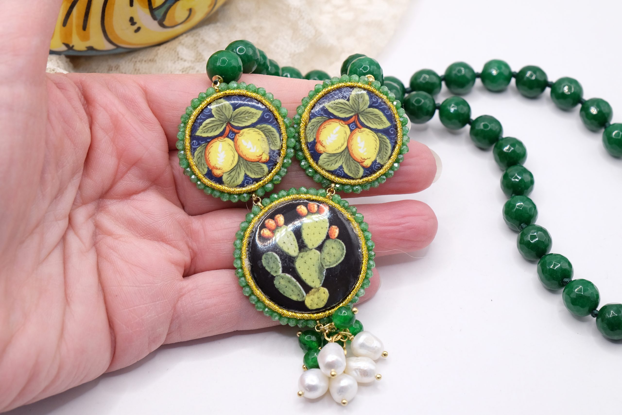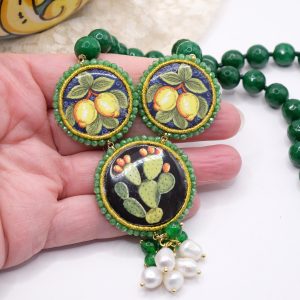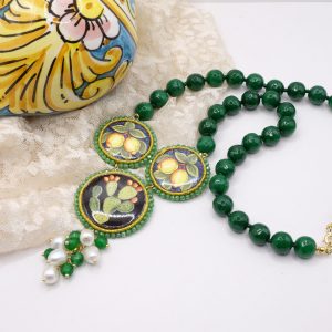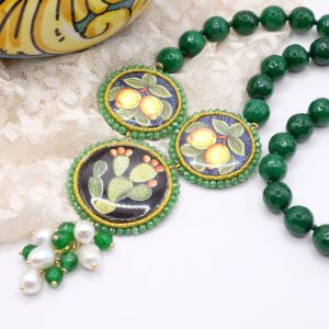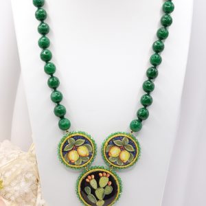 modello a Y, fatta interamente a mano, con 3 mattonelle tonde a lavorazione sautache con passamaneria e micropietre, in ceramica di Caltagirone, finemente decorata a mano e collana in giada verde