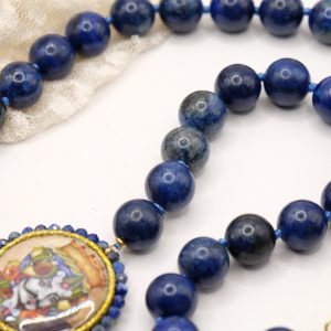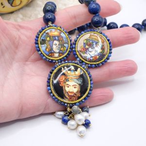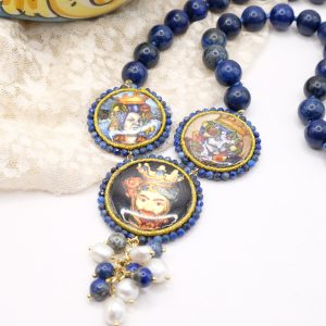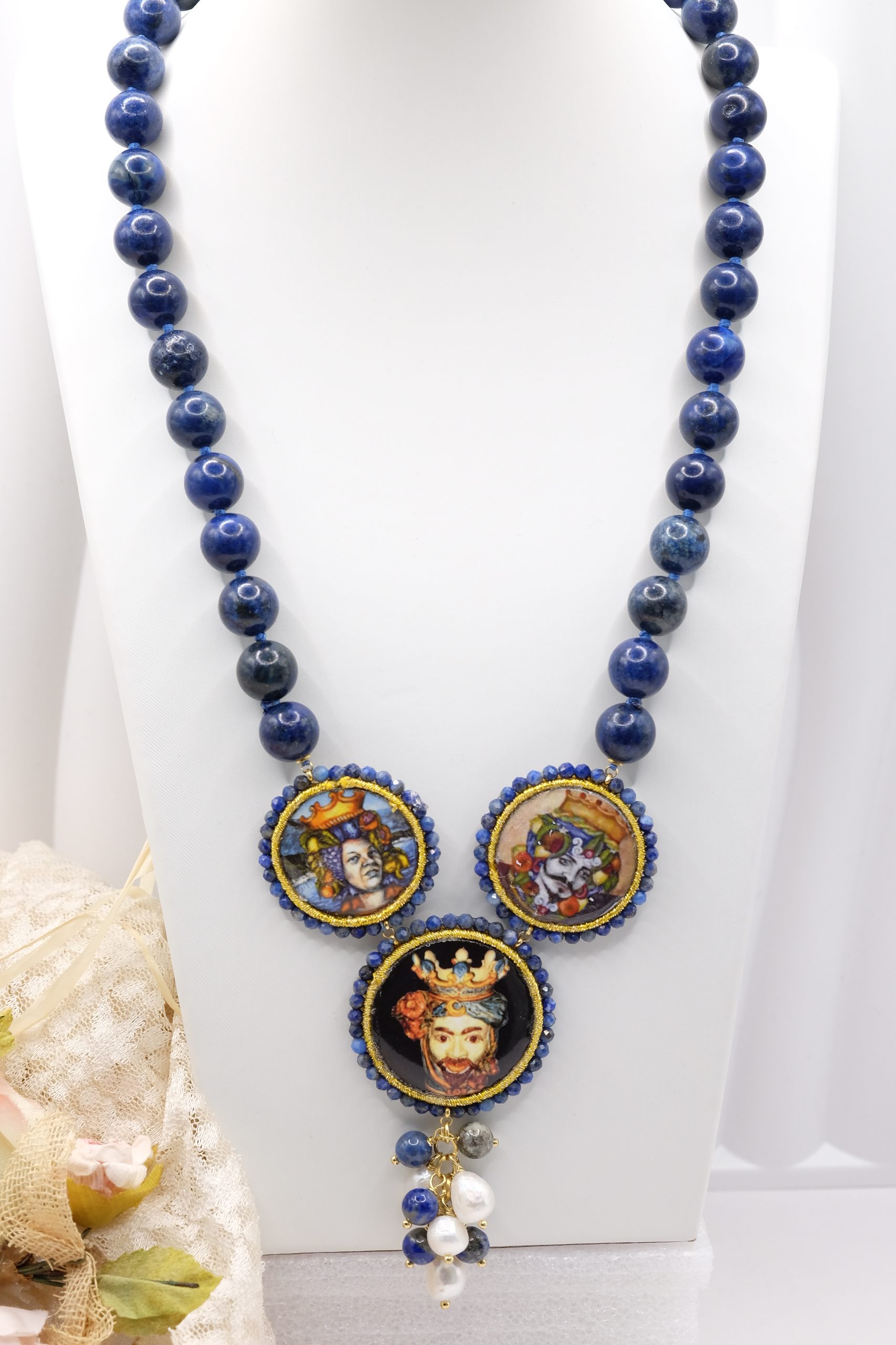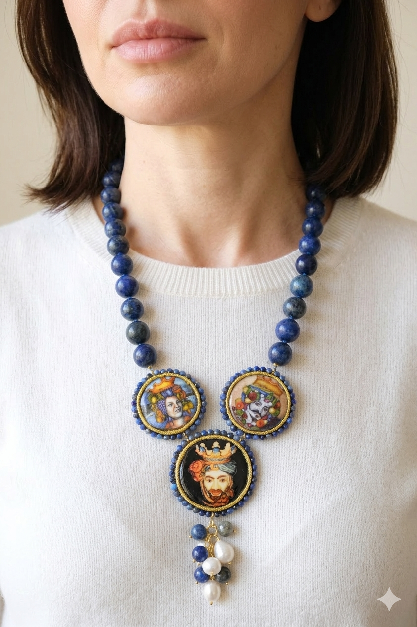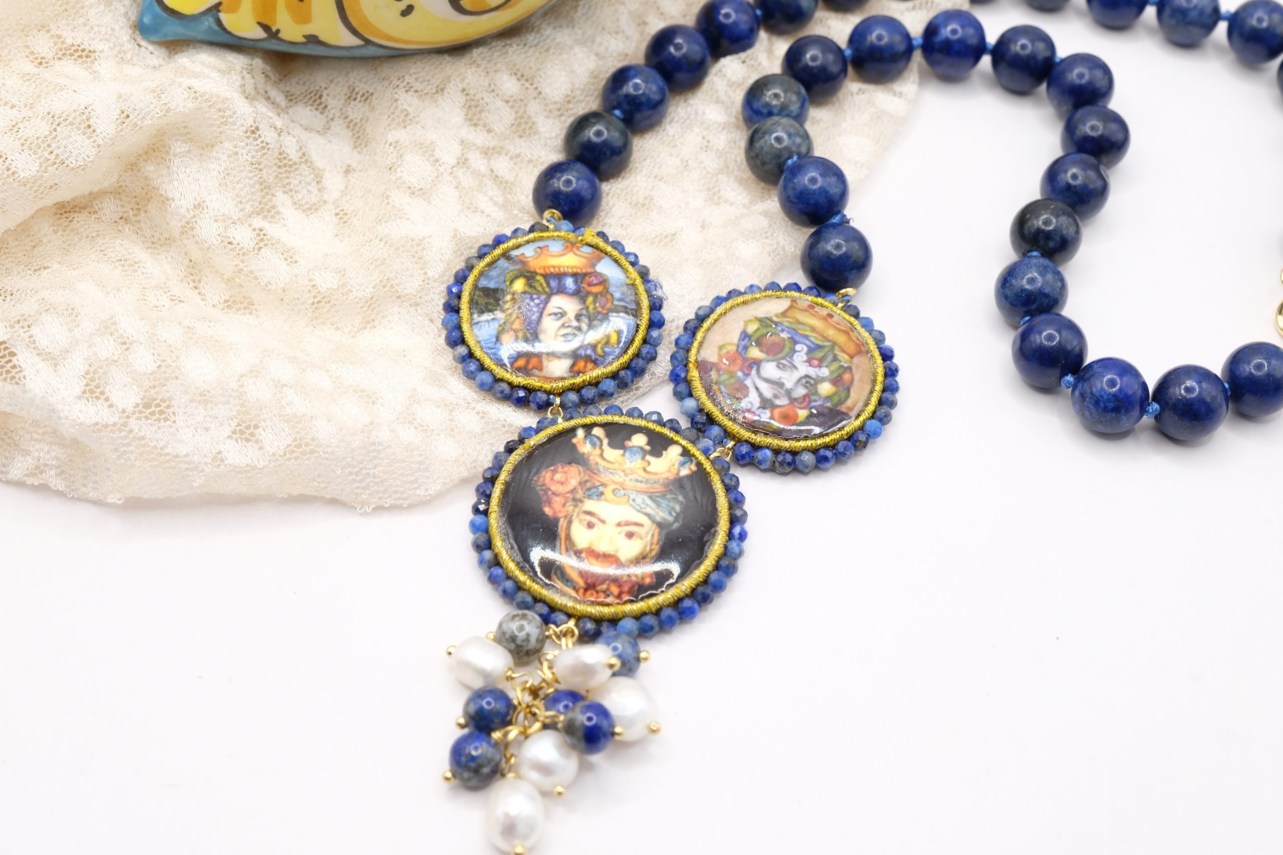 modello a Y, fatta interamente a mano, con 3 mattonelle tonde a lavorazione sautache con passamaneria e micropietre, in ceramica di Caltagirone, finemente decorata a mano con le teste di moro e collana in lapis
