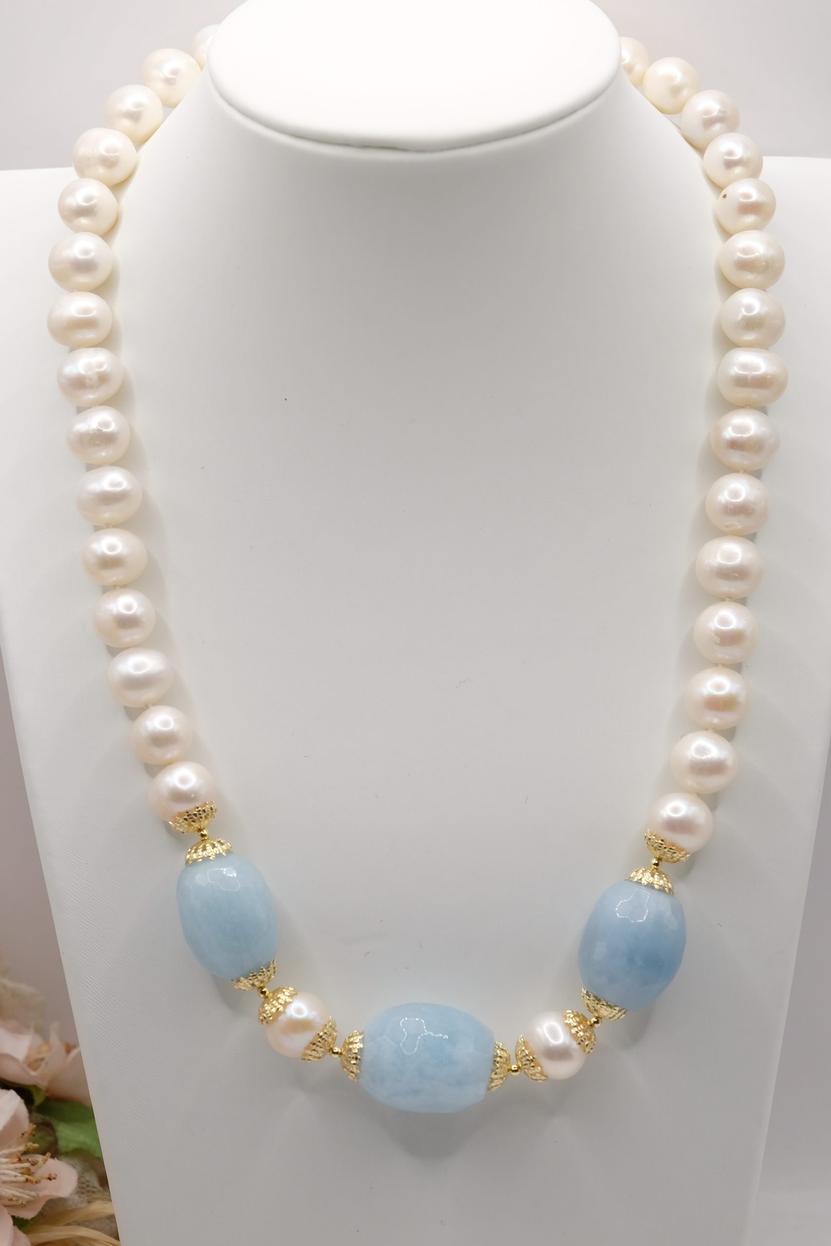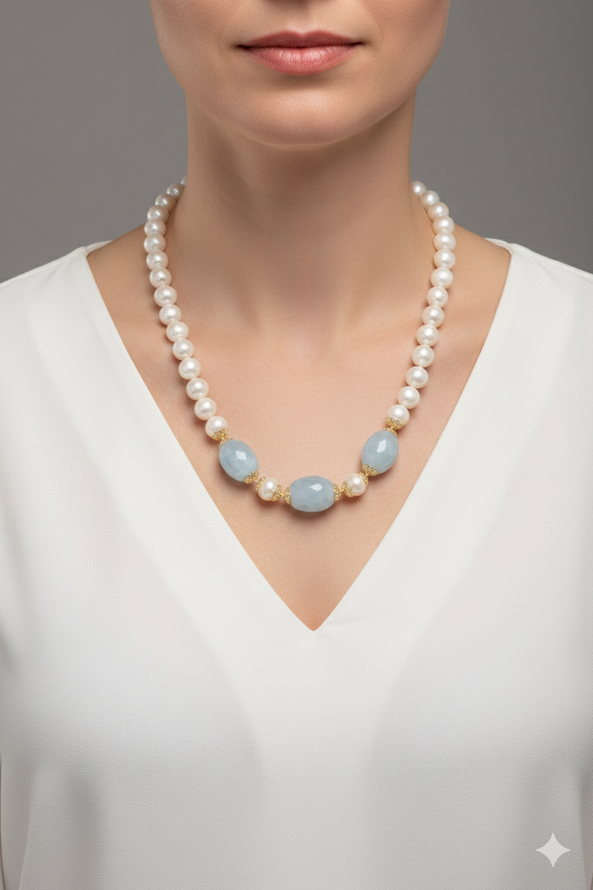Collana in perle naturali da 10mm, lisce e luminose e preziosa acquamarina a barilotti sfaccettati da 20 x 15 mm.