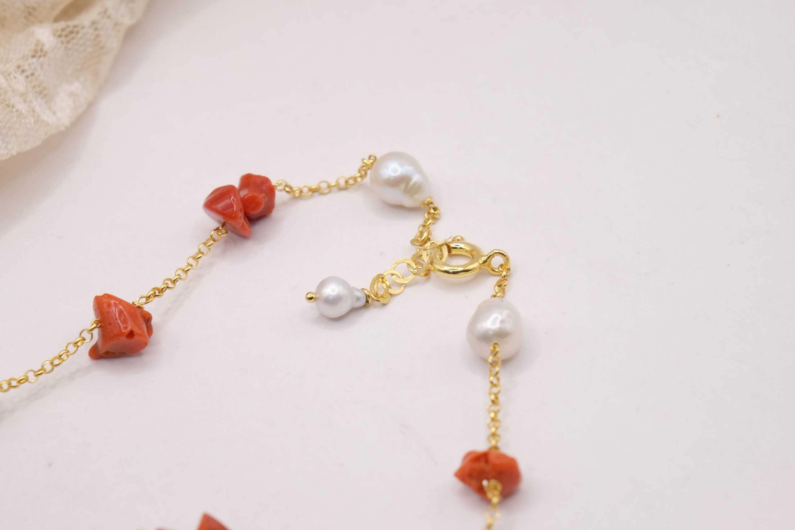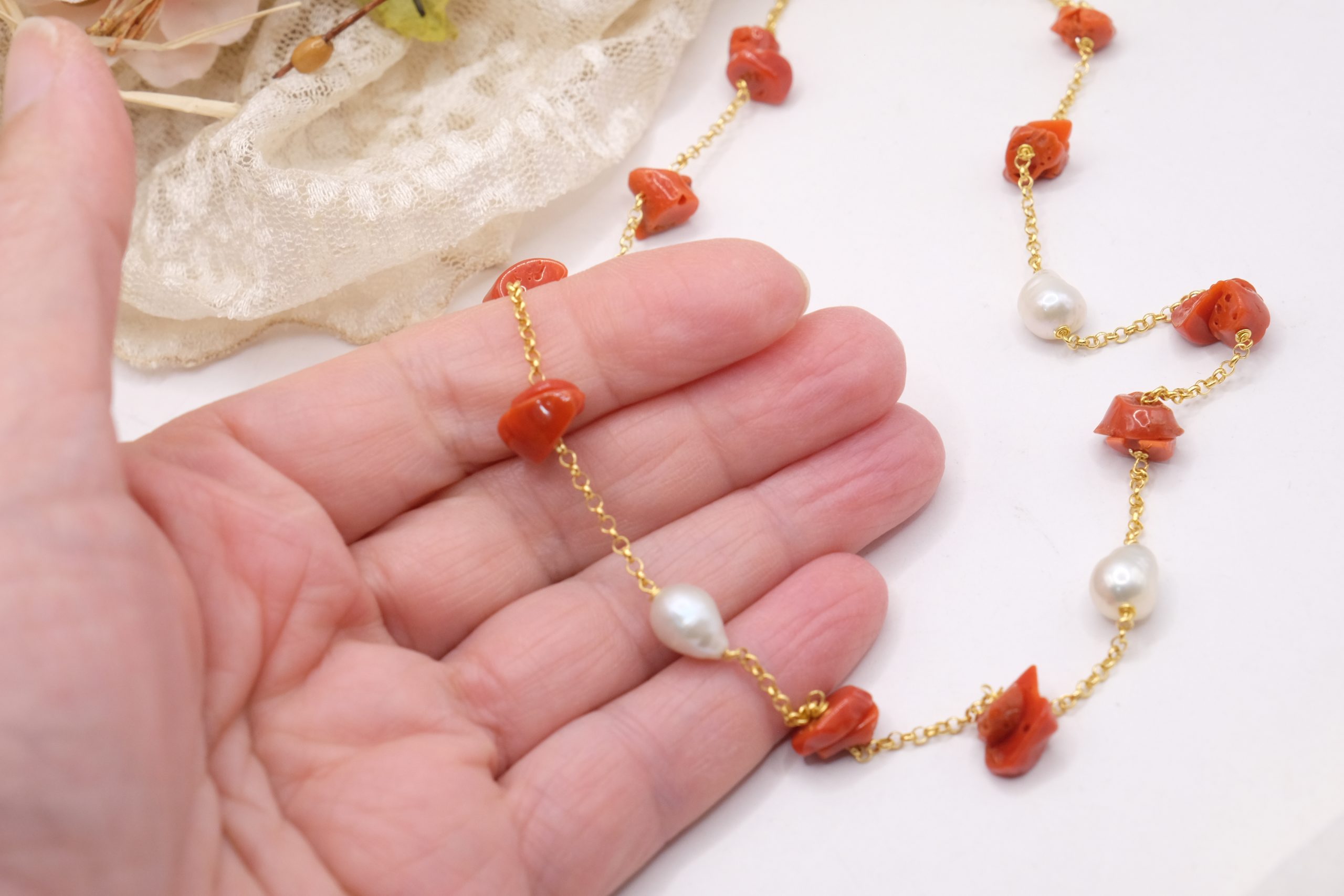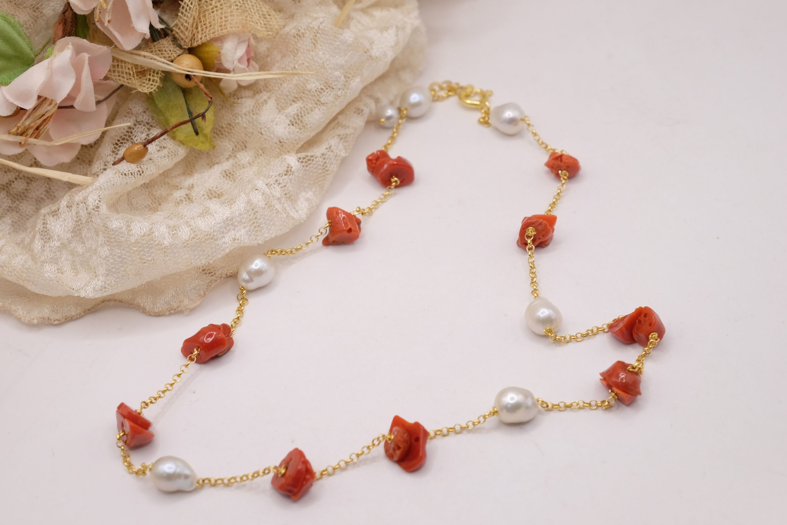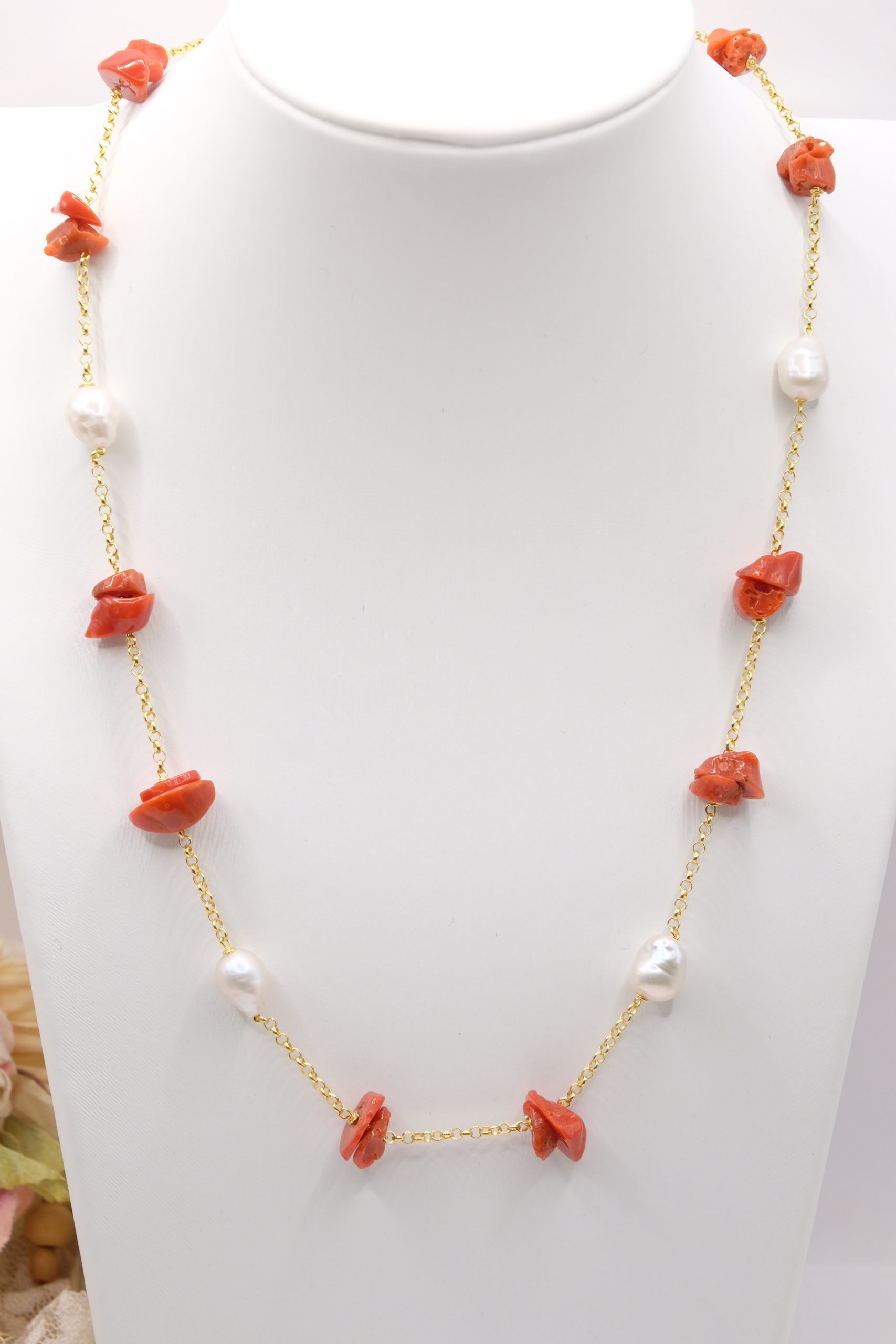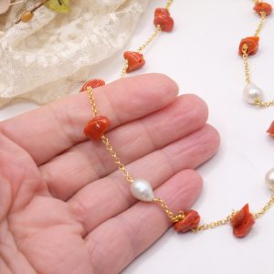 Elegante, raffinata e luminosa collana in argento 925 placcato oro giallo con perle e coralli naturali grezzi