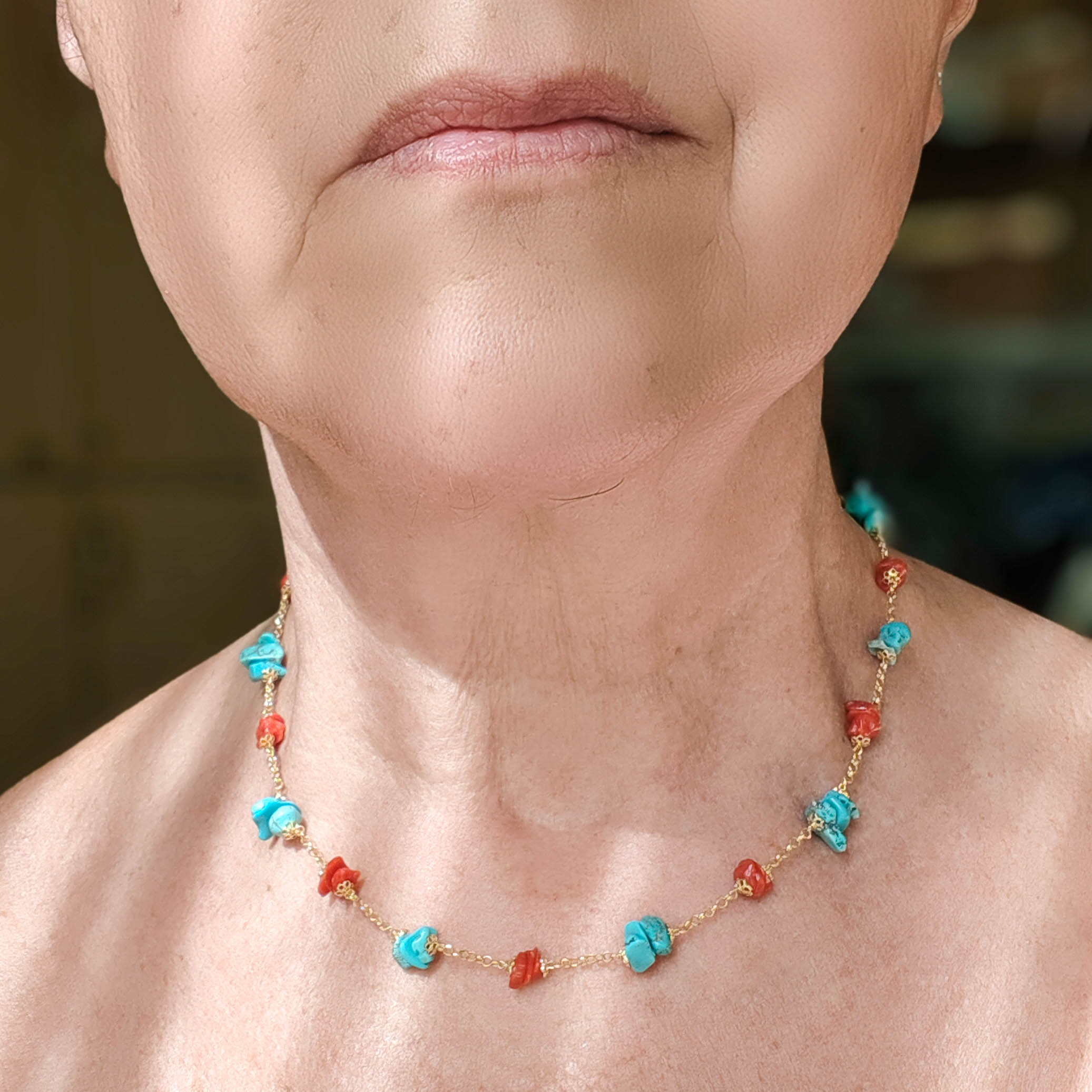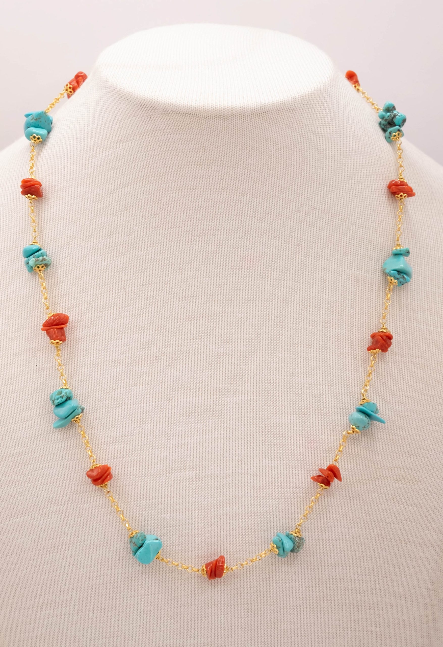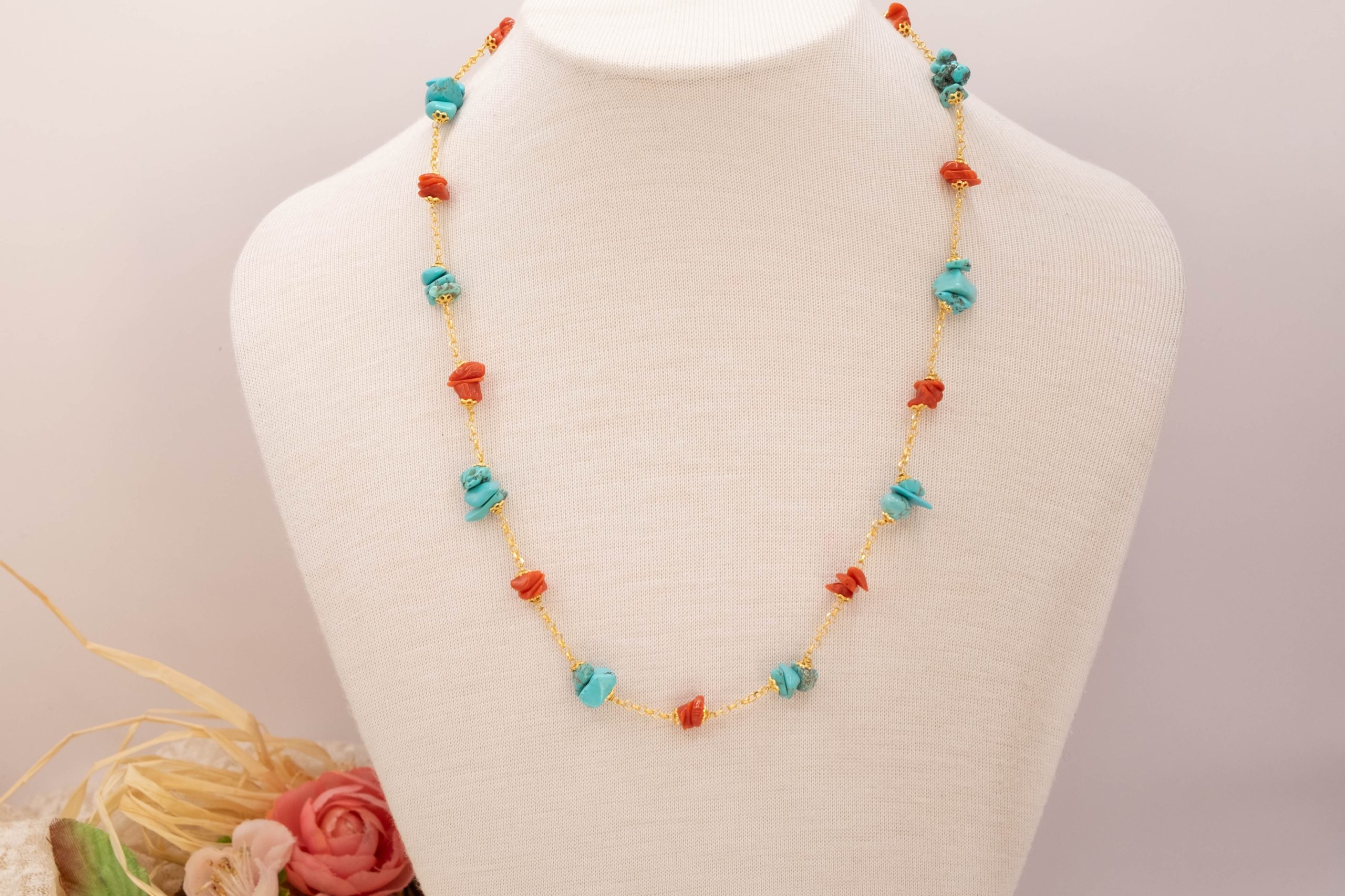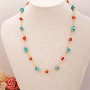 Elegante, raffinata e luminosa collana in argento 925 placcato oro giallo con coralli e turchesi naturali grezzi
