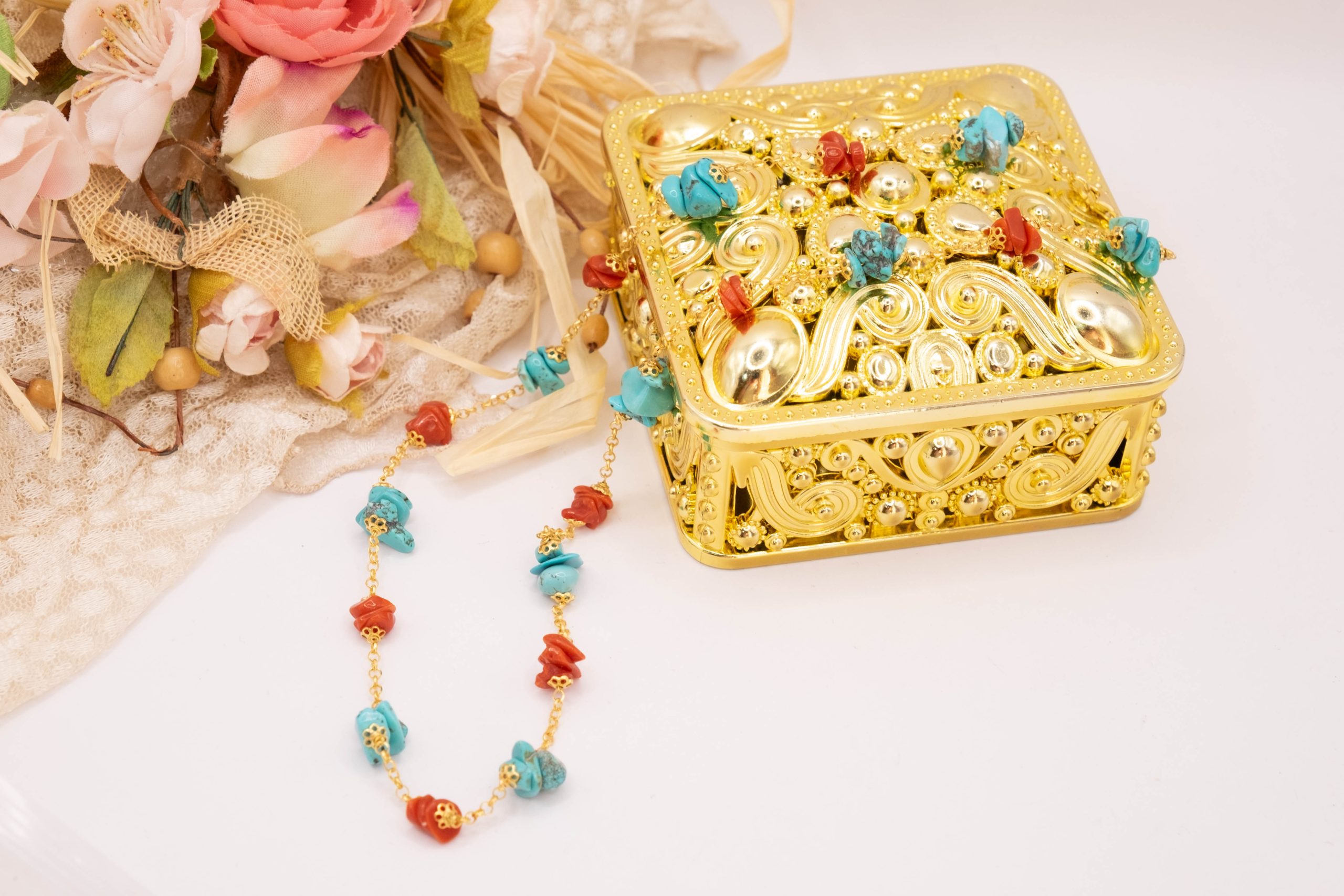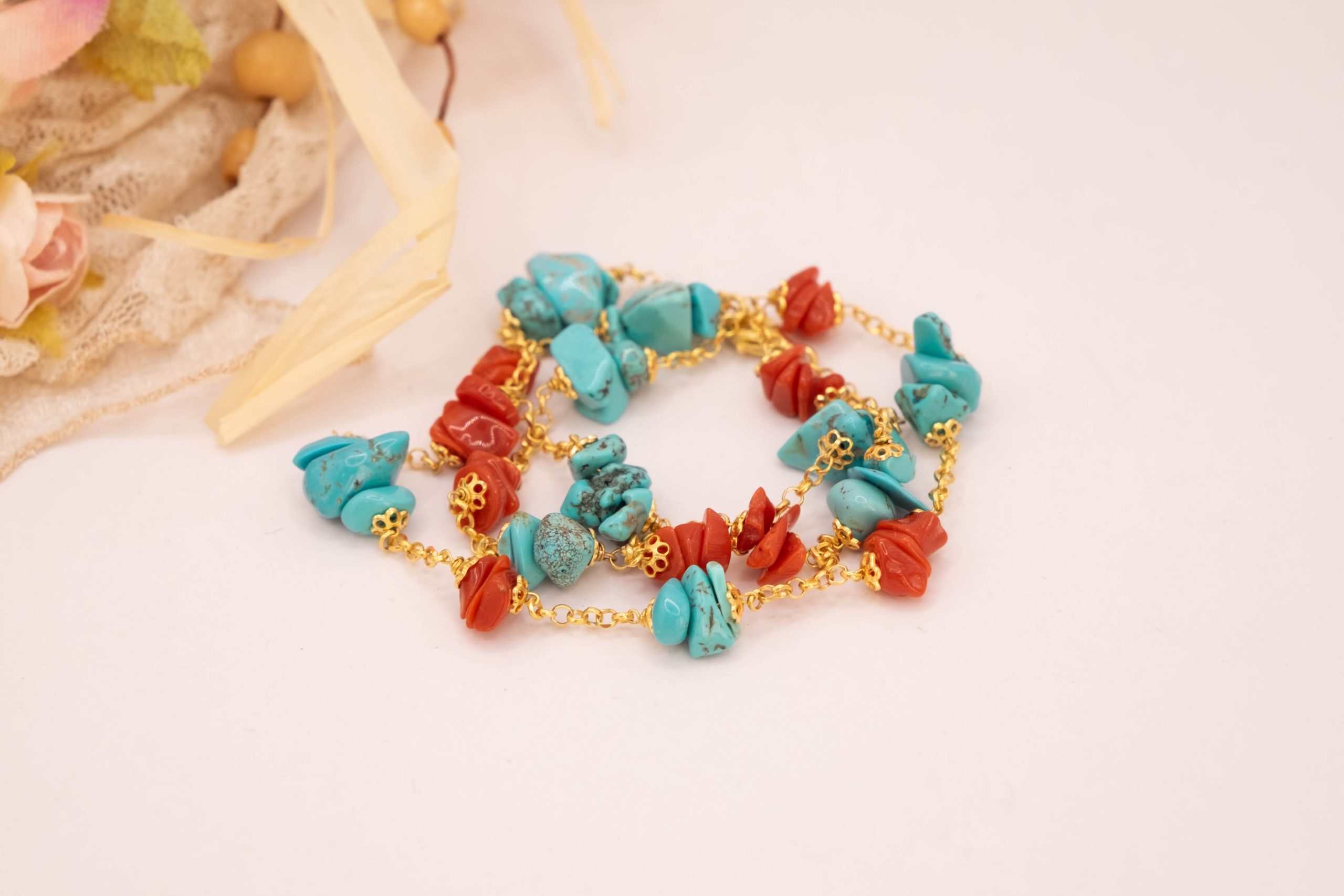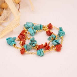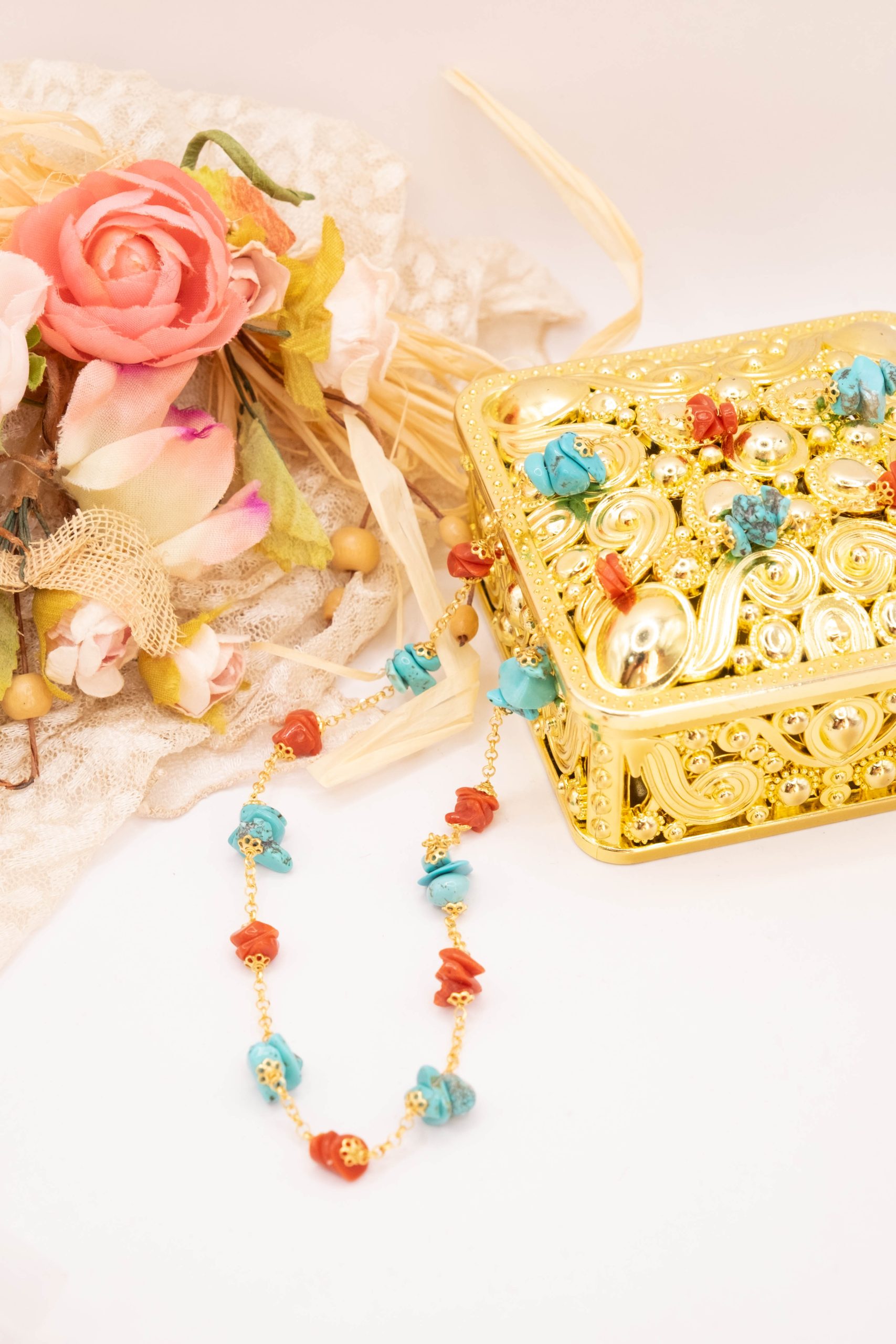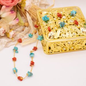 Elegante, raffinata e luminosa collana in argento 925 placcato oro giallo con coralli e turchesi naturali grezzi