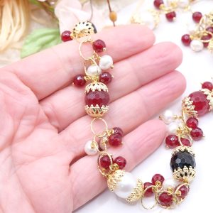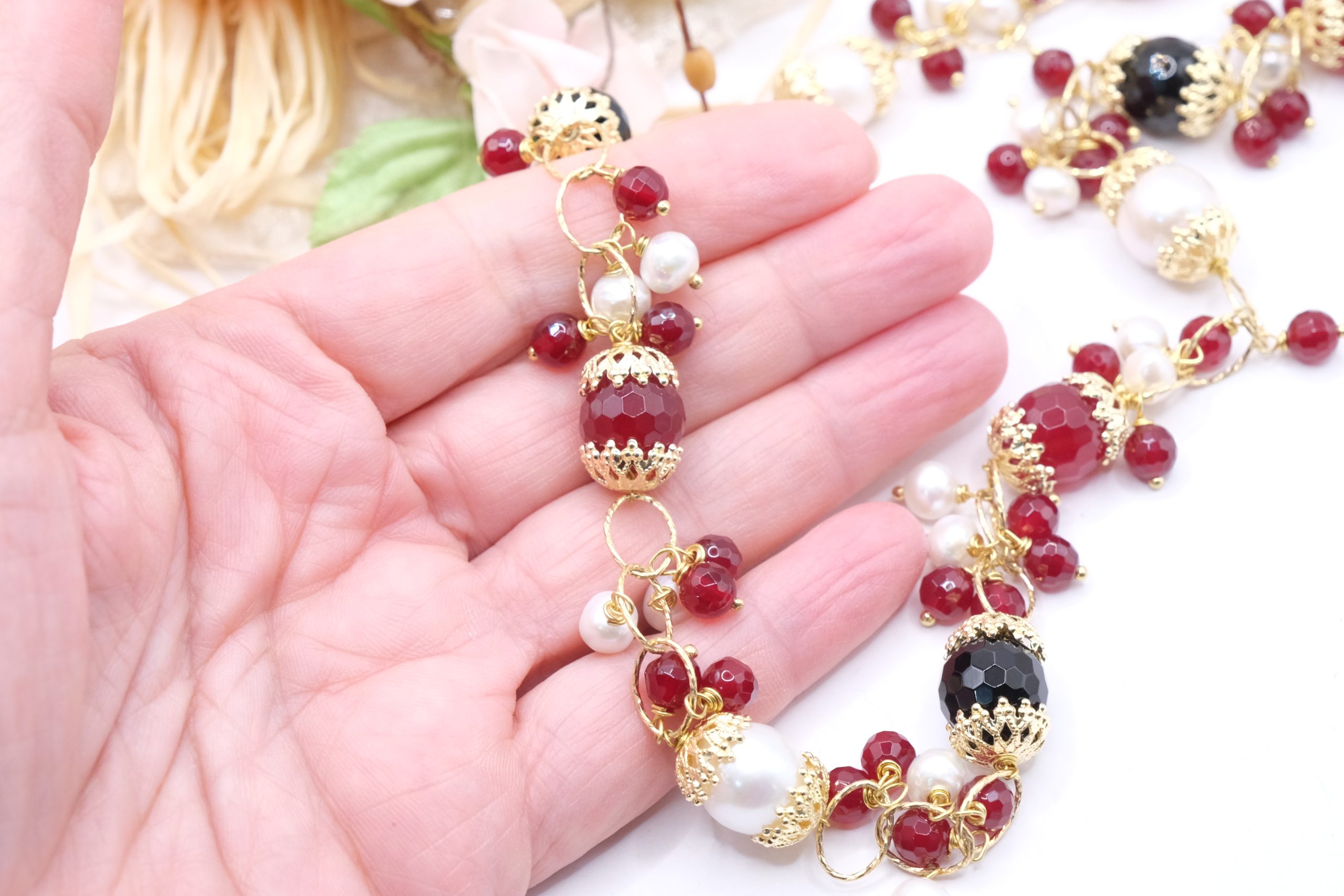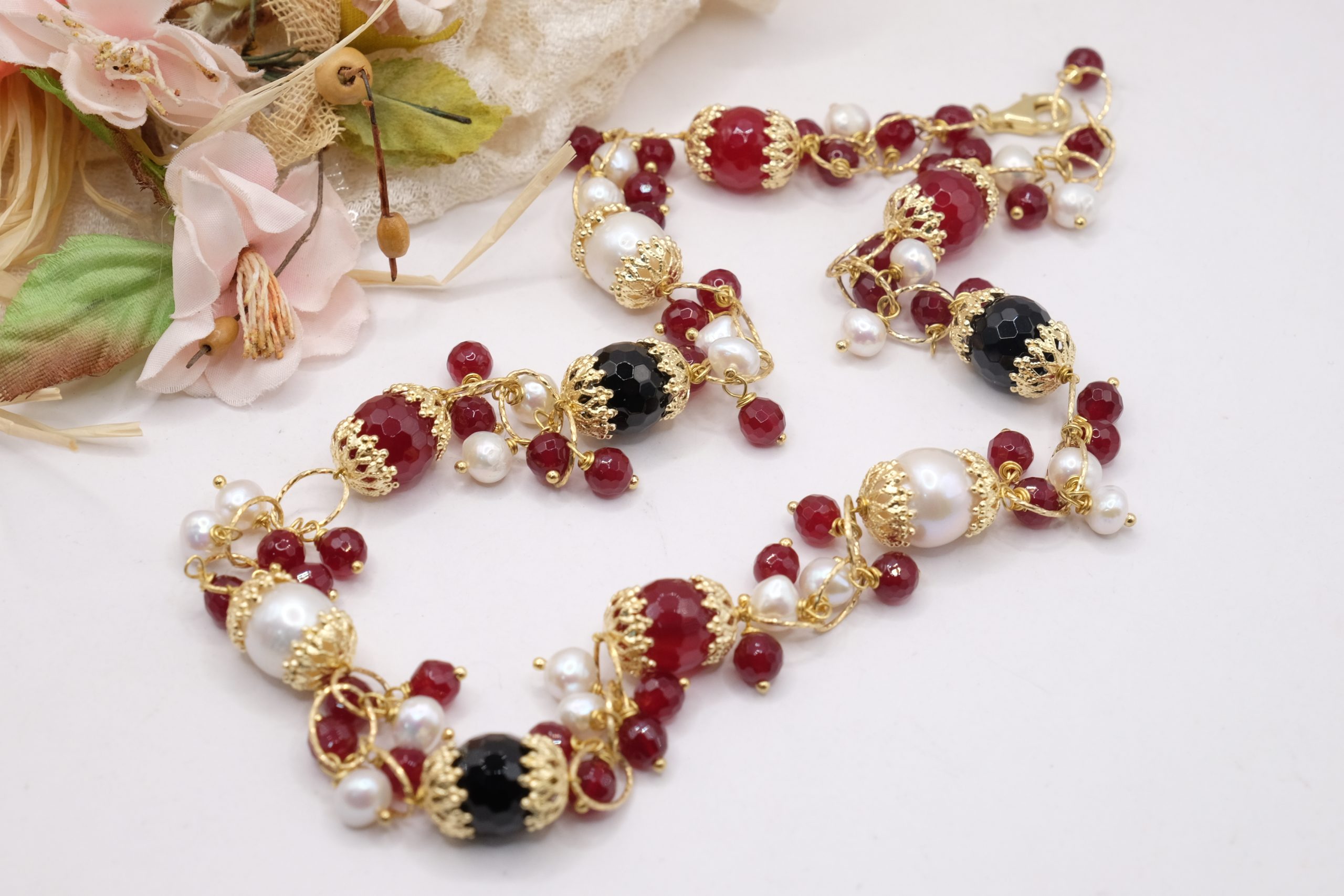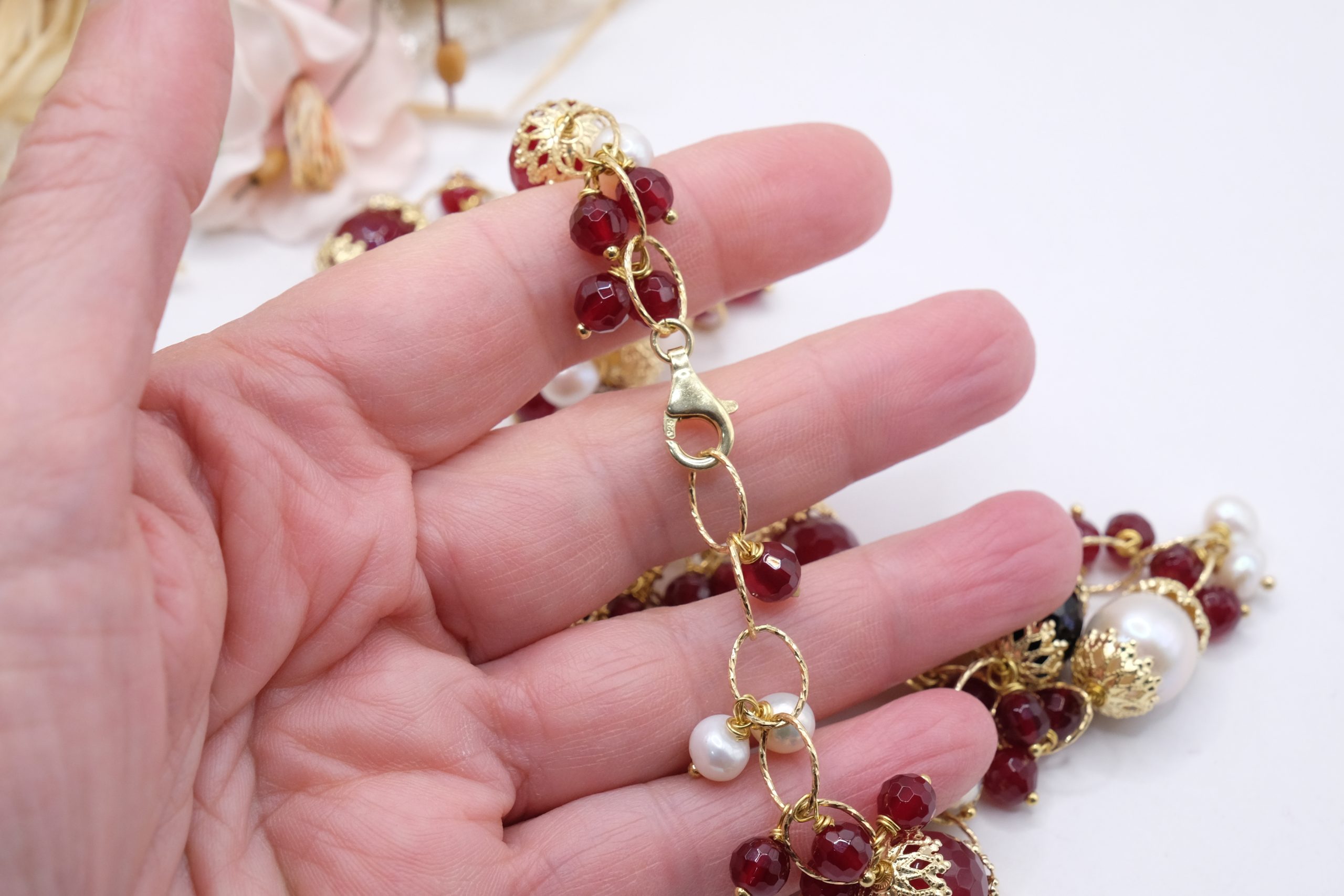 Collana in giada borgogna da 14 mm, perle da 14 mm e onice da 12 mm, grappoli di piccole perle e giada borgogna su eterea catena in argento 925 placcato oro