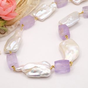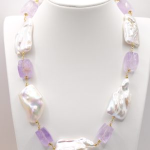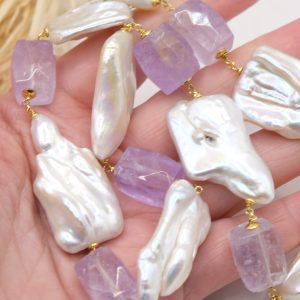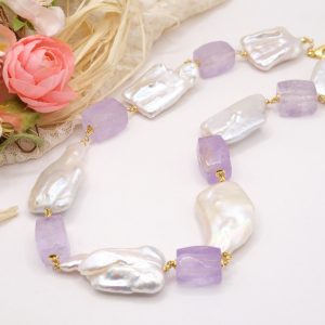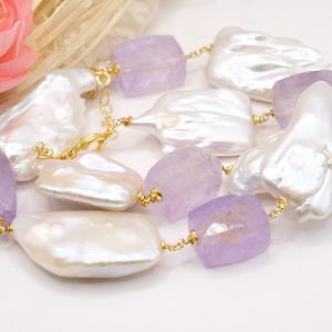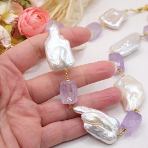 Collana bellissima con perle quadrate di grandi dimensioni, sassi sfaccettati di ametista lavanda e ematite gold
