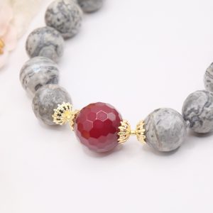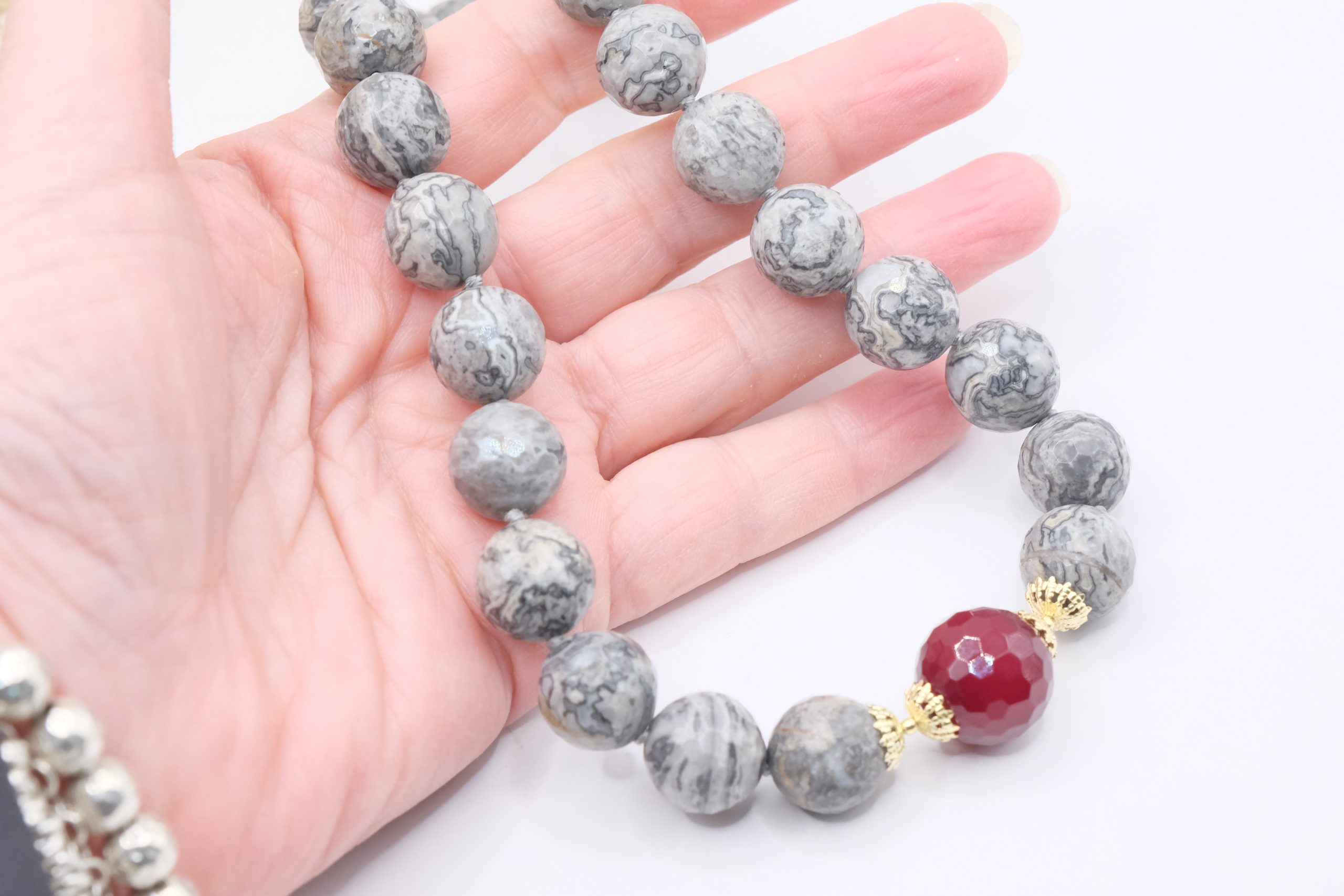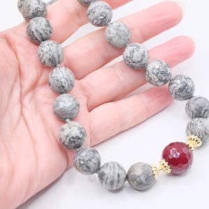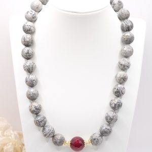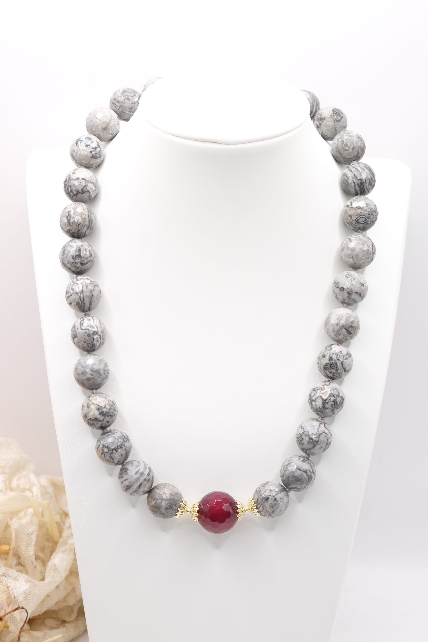 Collana meravigliosa in calcedonio da 15 mm e grande perla di giada borgogna da 17 mm