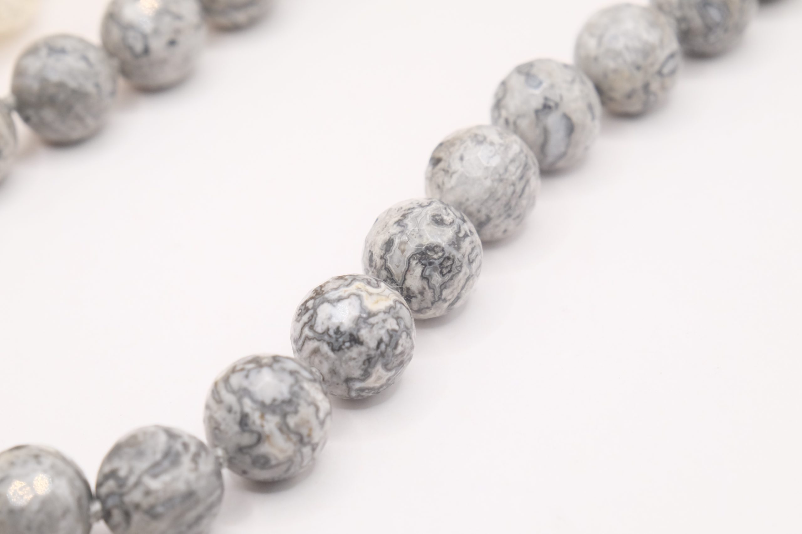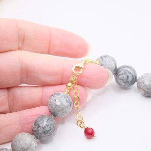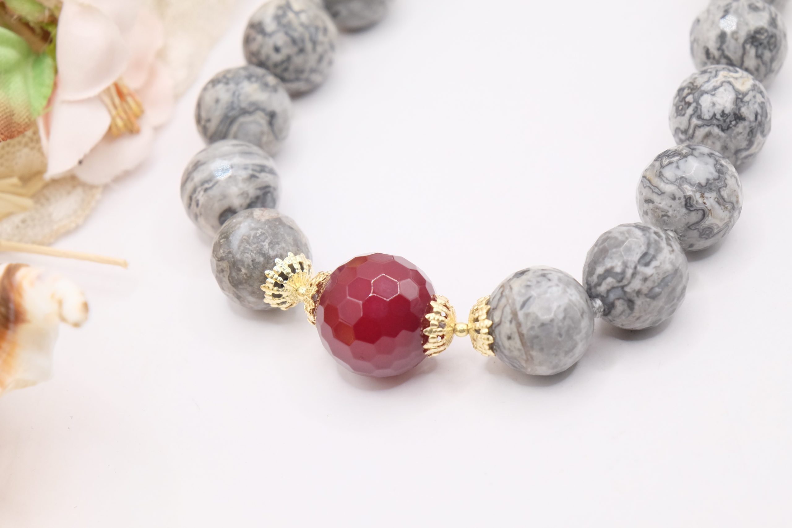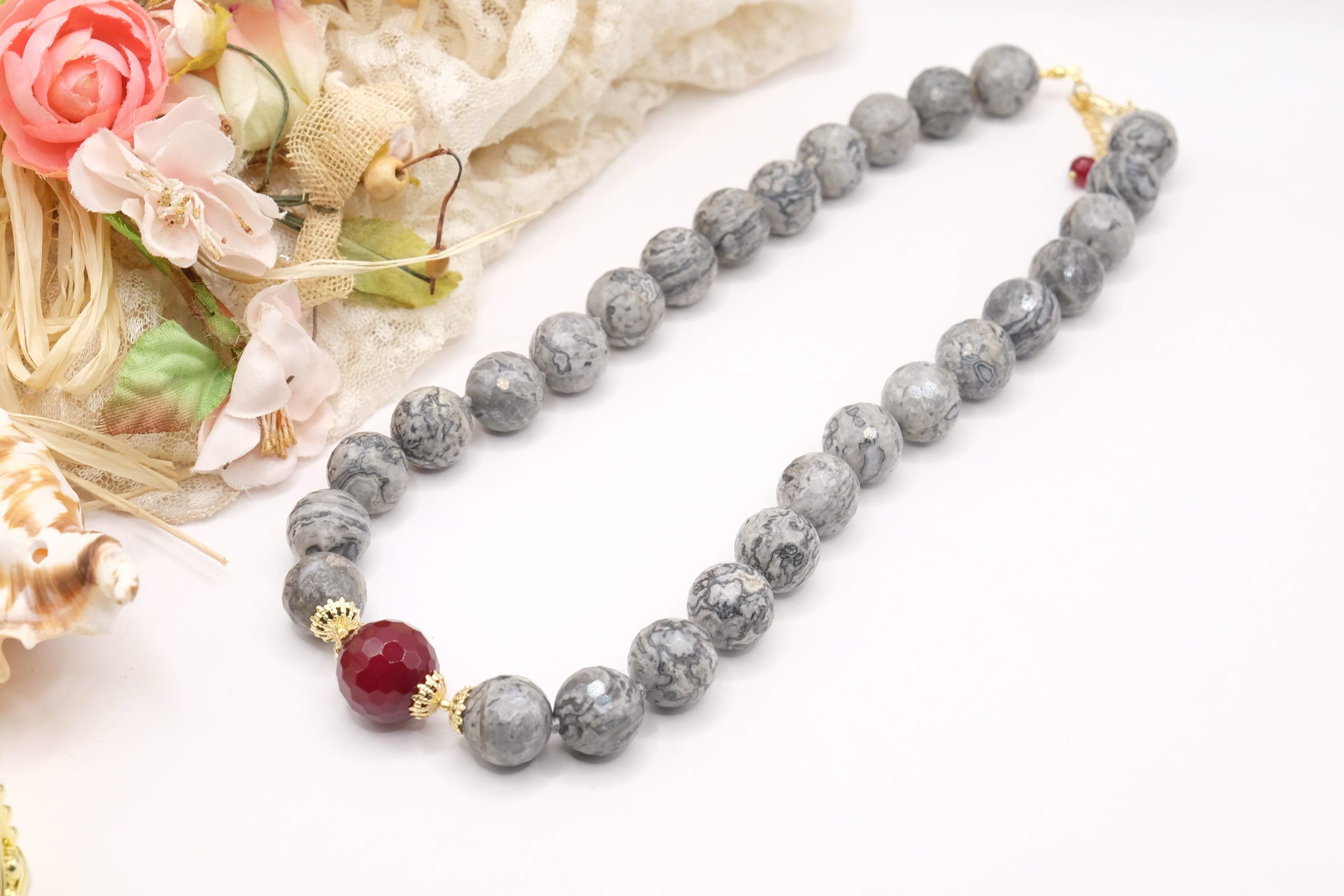 Collana meravigliosa in calcedonio da 15 mm e grande perla di giada borgogna da 17 mm